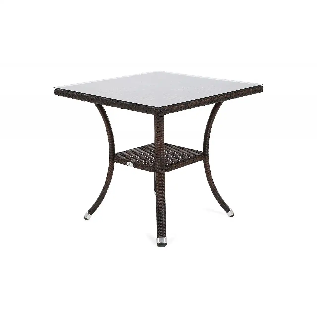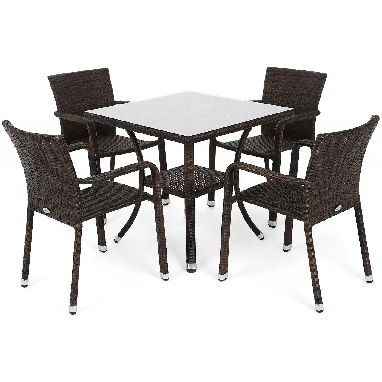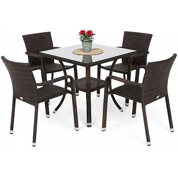 Практичні садові меблі з техноротанга Sumba Square - ідеальне рішення як для сучасної, так і для класичної тераси. Набір ідеально підходить для саду людей, які цінують проведення часу на природі, спільну їжу, а також спілкування за барбекю або кавою. У набір входить квадратний стіл з товстим загартованим склом, що дозволяє легко видаляти забруднення, і 4 зручних крісла з підлокітниками.