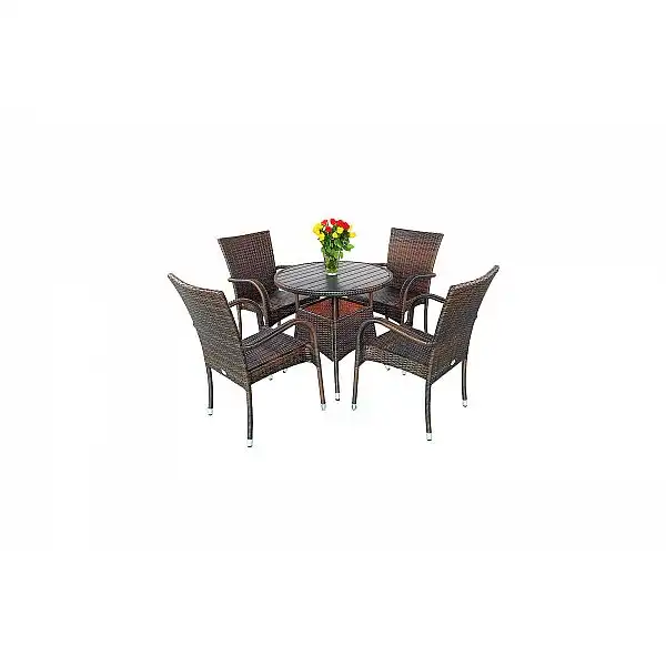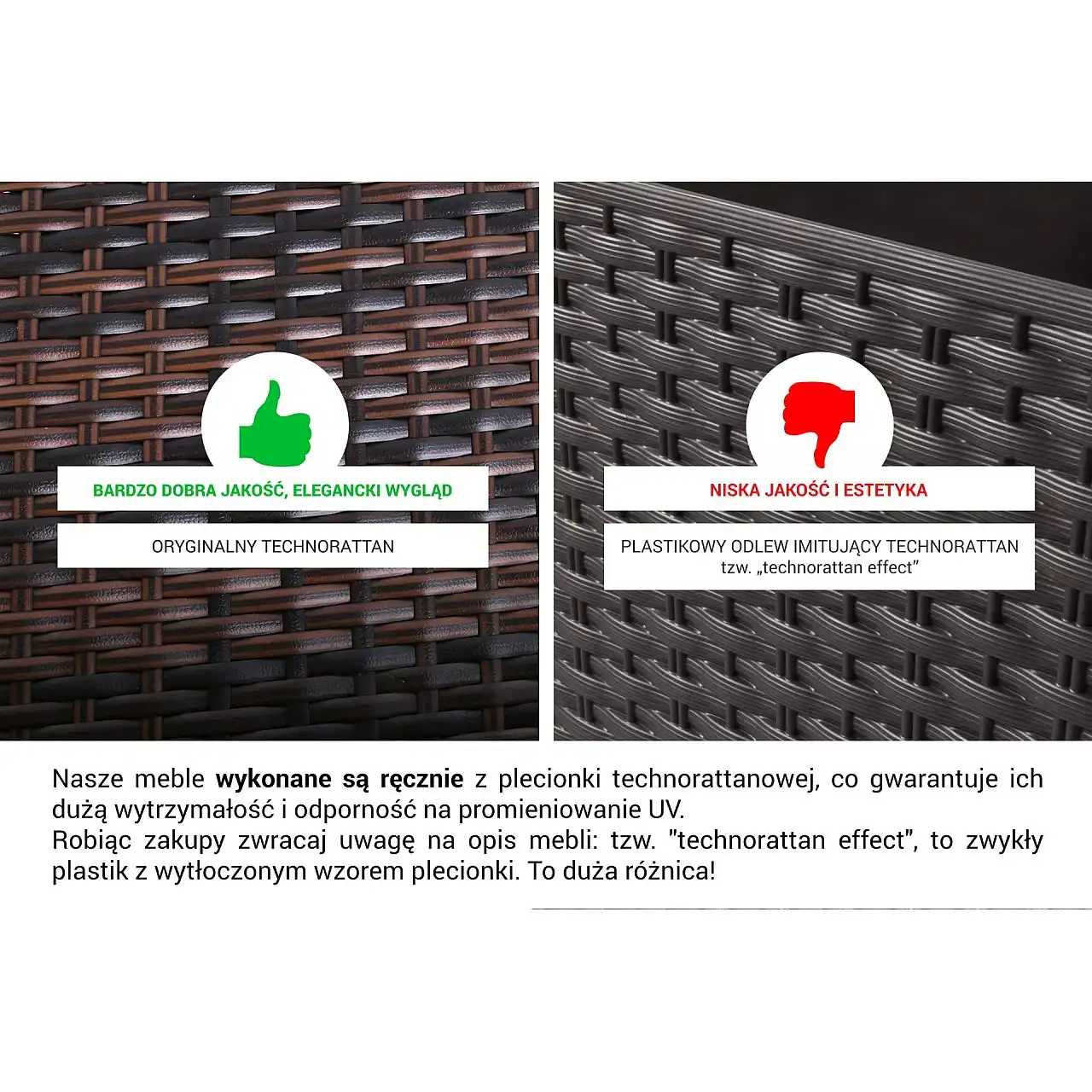 Mori - це елегантний набір меблів з техноротанга, ретельно оброблених. Меблі характеризуються високою якістю виготовлення: конструкція стільців і столу виконана з товстих алюмінієвих профілів з порошковим покриттям, а чохол виготовлений з міцного техноротанга, стійкого до несприятливих погодних умов. Дуже характерною особливістю цього набору є стільниця, яка виготовлена з композитних плит WPC - стійких до вологи, бруду та УФ-променів. Меблі підійдуть як на вулиці (сад, тераса, балкон), так і всередині будинку, кафе чи ресторану. М’яко вигнуті стільці виглядають дуже елегантно. Ретельна обробка меблів і алюмінієві кінці ніжок стільців і столу надають їм ексклюзивний характер.