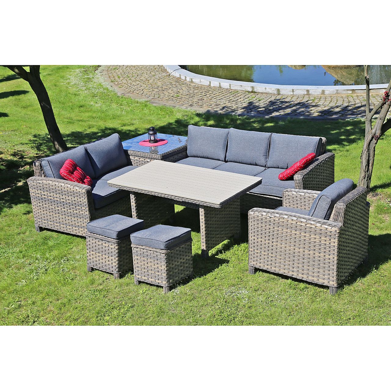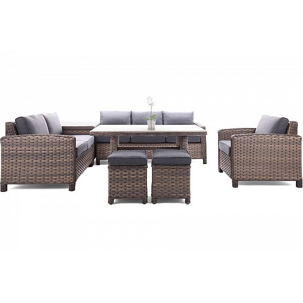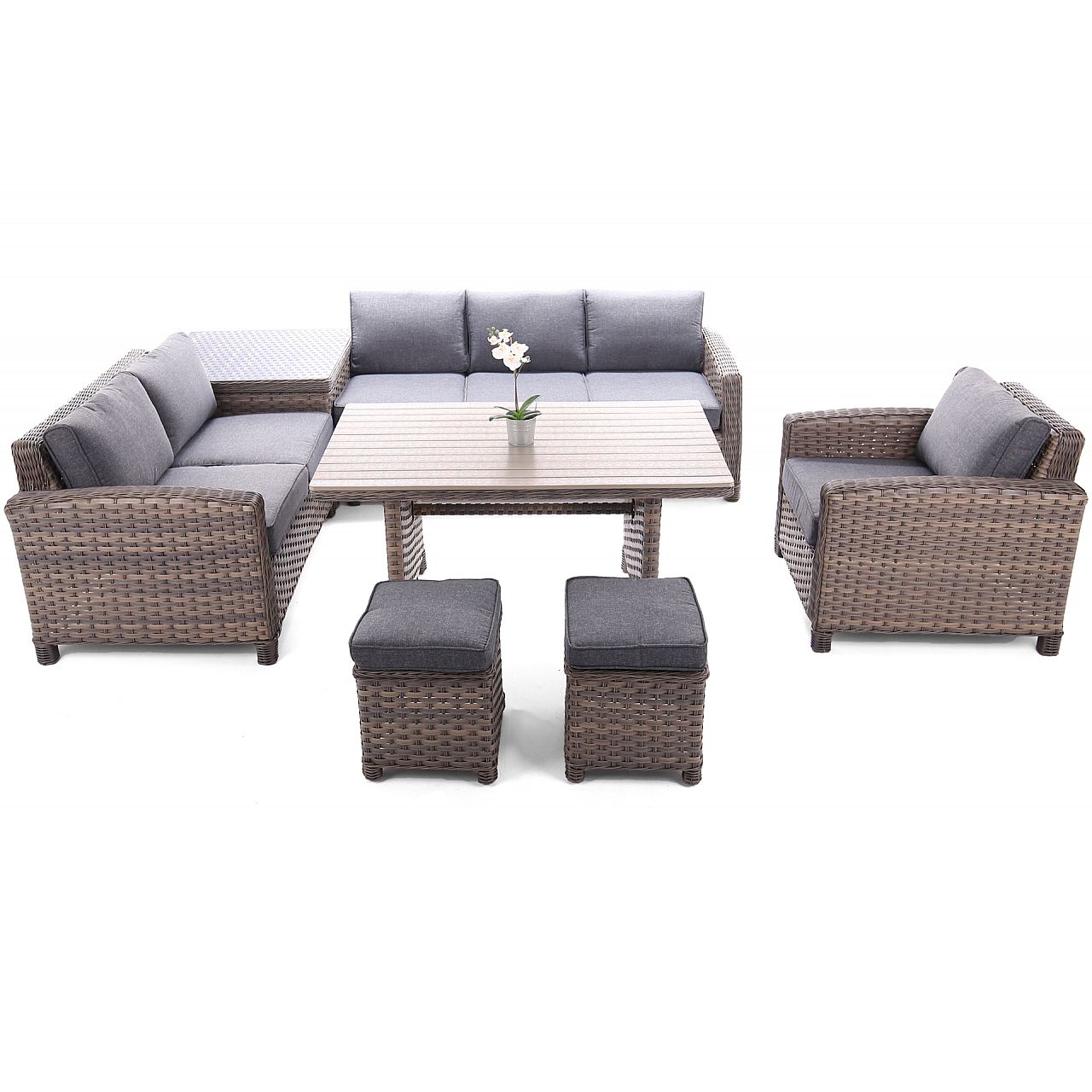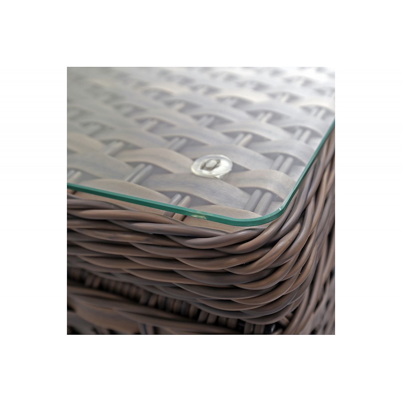 Комплект садових меблів Alhambra виготовлений з двоколірного техноротанга. Техноратанг — дуже міцний матеріал, але при цьому гнучкий і стійкий до погодних умов. Конструкція меблів виготовлена з алюмінієвих профілів з порошковим покриттям. Меблі дуже добре працюватимуть як зовні (сад, тераса, балкон), так і всередині будинку (кухня, їдальня, кімната). Елегантна і ретельна обробка меблів надає їй ексклюзивний характер. Комплект меблів з техноротангу Альгамбра складається з 2-х диванів (двомісний і тримісний), з'єднаних між собою контейнером, крісла, двох пуфів і столика. І диван, і крісло мають зручні підлокітники. Контейнер, в якому ми можемо зберігати подушки, також служить додатковим столиком або поличкою - на кришці є віконце із загартованого скла. Стільниця виготовлена з композитних плит WPC. Дивани, крісла та пуфи оснащені дуже зручними подушками, оббивку яких можна прати (застібається на блискавку).
