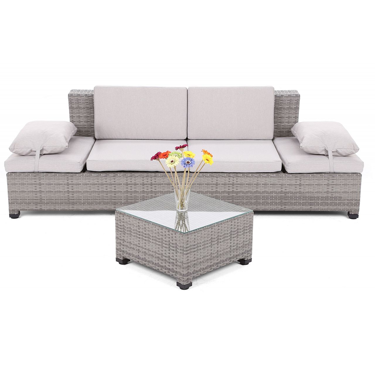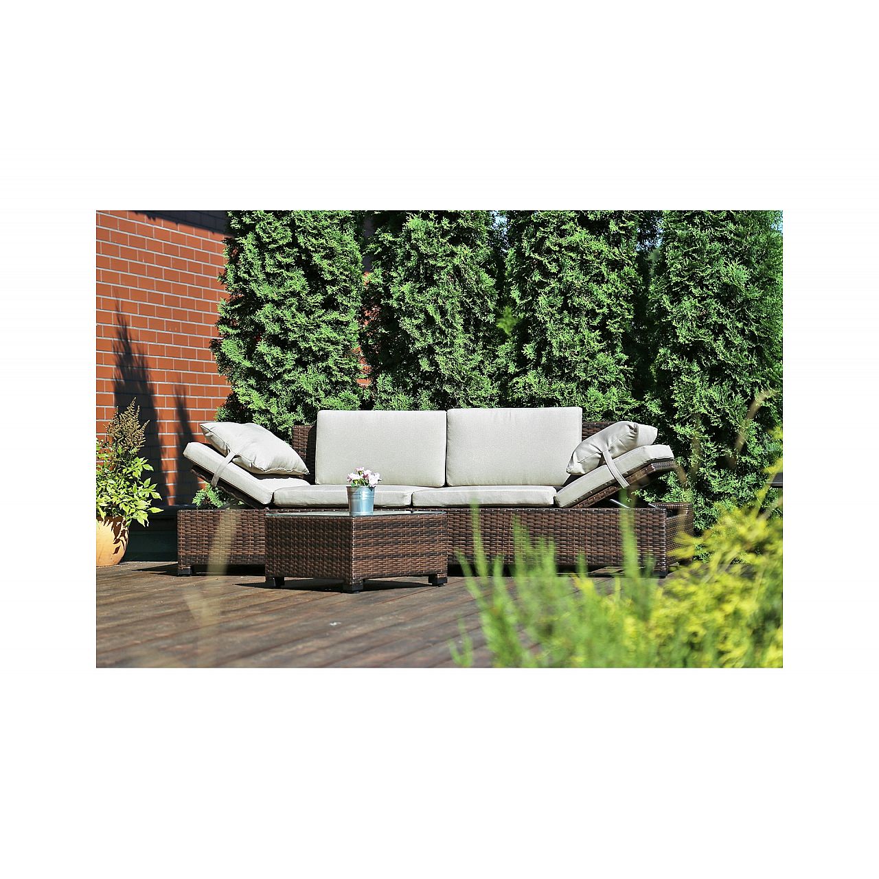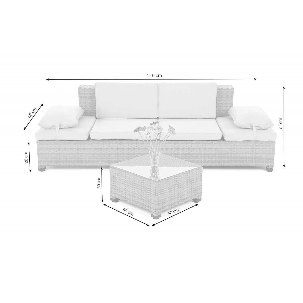 Садовий диван Milano 2-в-1 з техноротангу є надзвичайно привабливим предметом садових меблів . Чудово виглядає на терасі, в саду або в холі готелю. Суцільні алюмінієві профілі , з яких виготовлена конструкція, додатково пофарбовані порошковою фарбою. Покриття з техноротанга було заплетене на каркас вручну і дуже акуратно. Меблі виготовлені з атмосферостійких матеріалів - при правильному використанні вони прослужать багато років. Техноратанг не деформується під впливом сильних сонячних променів і навантажень (відновлює свою початкову форму) і не тьмяніє під впливом УФ-випромінювання. Йому не страшний дощ, навіть сніг і мороз. Цікавим рішенням є використання рухомих бічних панелей сидінь , які можна встановити в 4 різних положеннях (симетрично або асиметрично). Все це доповнюється зручними подушками на сидінні та спинці, а також декоративними подушками, прикріпленими за допомогою липучки. Чохли подушок застібаються на блискавку , тому їх можна зняти. У комплект також входить маленький практичний журнальний столик зі склом. Ми перемо наволочки при 30°C.