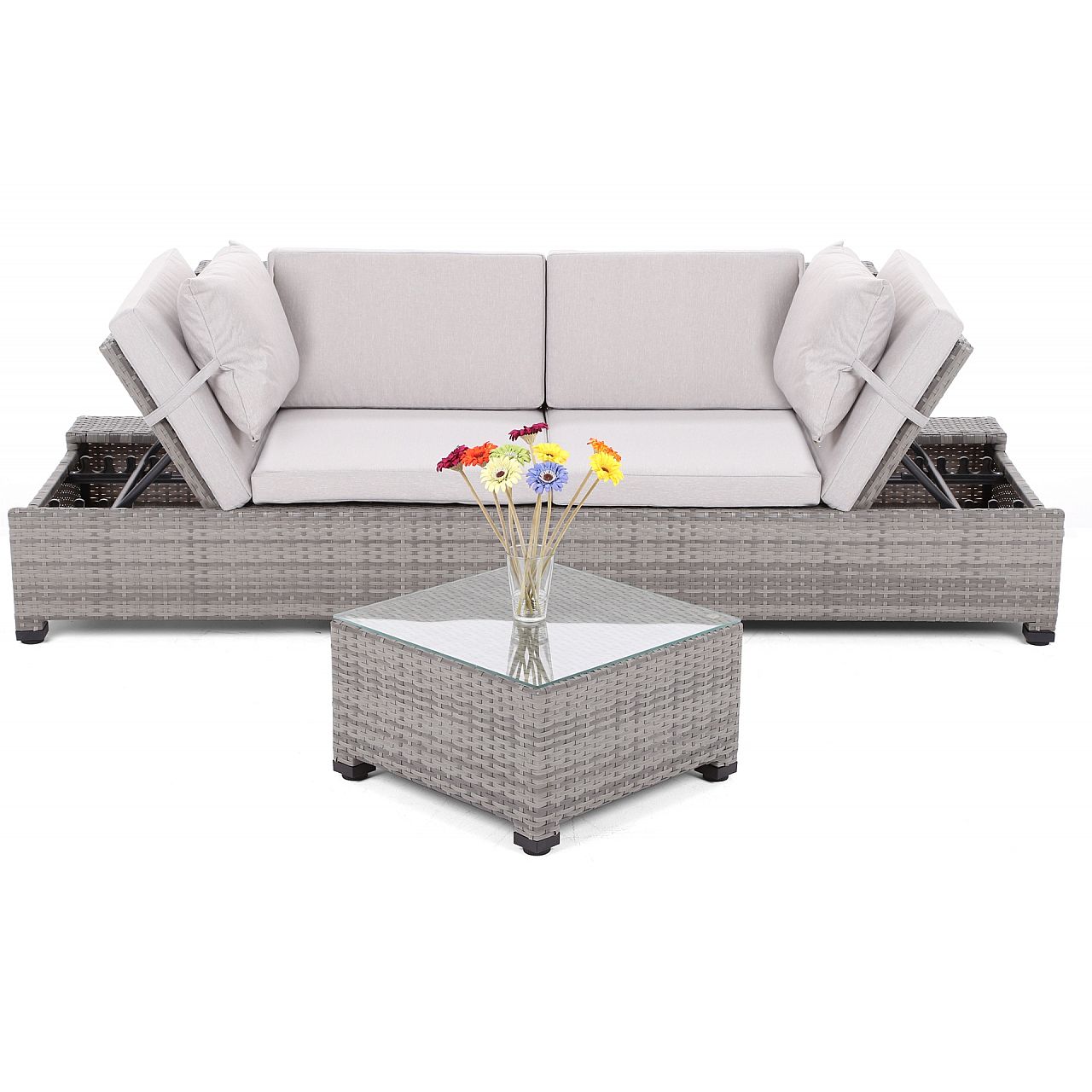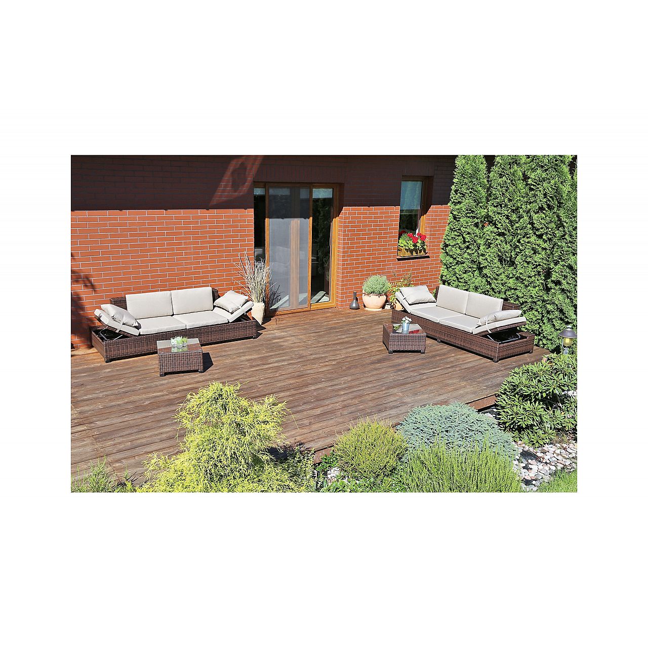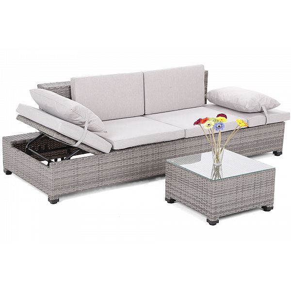 Садовий диван Milano 2-в-1 з техноротангу є надзвичайно привабливим предметом садових меблів . Чудово виглядає на терасі, в саду або в холі готелю. Суцільні алюмінієві профілі , з яких виготовлена конструкція, додатково пофарбовані порошковою фарбою. Покриття з техноротанга було заплетене на каркас вручну і дуже акуратно. Меблі виготовлені з атмосферостійких матеріалів - при правильному використанні вони прослужать багато років. Техноратанг не деформується під впливом сильних сонячних променів і навантажень (відновлює свою початкову форму) і не тьмяніє під впливом УФ-випромінювання. Йому не страшний дощ, навіть сніг і мороз. Цікавим рішенням є використання рухомих бічних панелей сидінь , які можна встановити в 4 різних положеннях (симетрично або асиметрично). Все це доповнюється зручними подушками на сидінні та спинці, а також декоративними подушками, прикріпленими за допомогою липучки. Чохли подушок застібаються на блискавку , тому їх можна зняти. У комплект також входить маленький практичний журнальний столик зі склом. Ми перемо наволочки при 30°C.