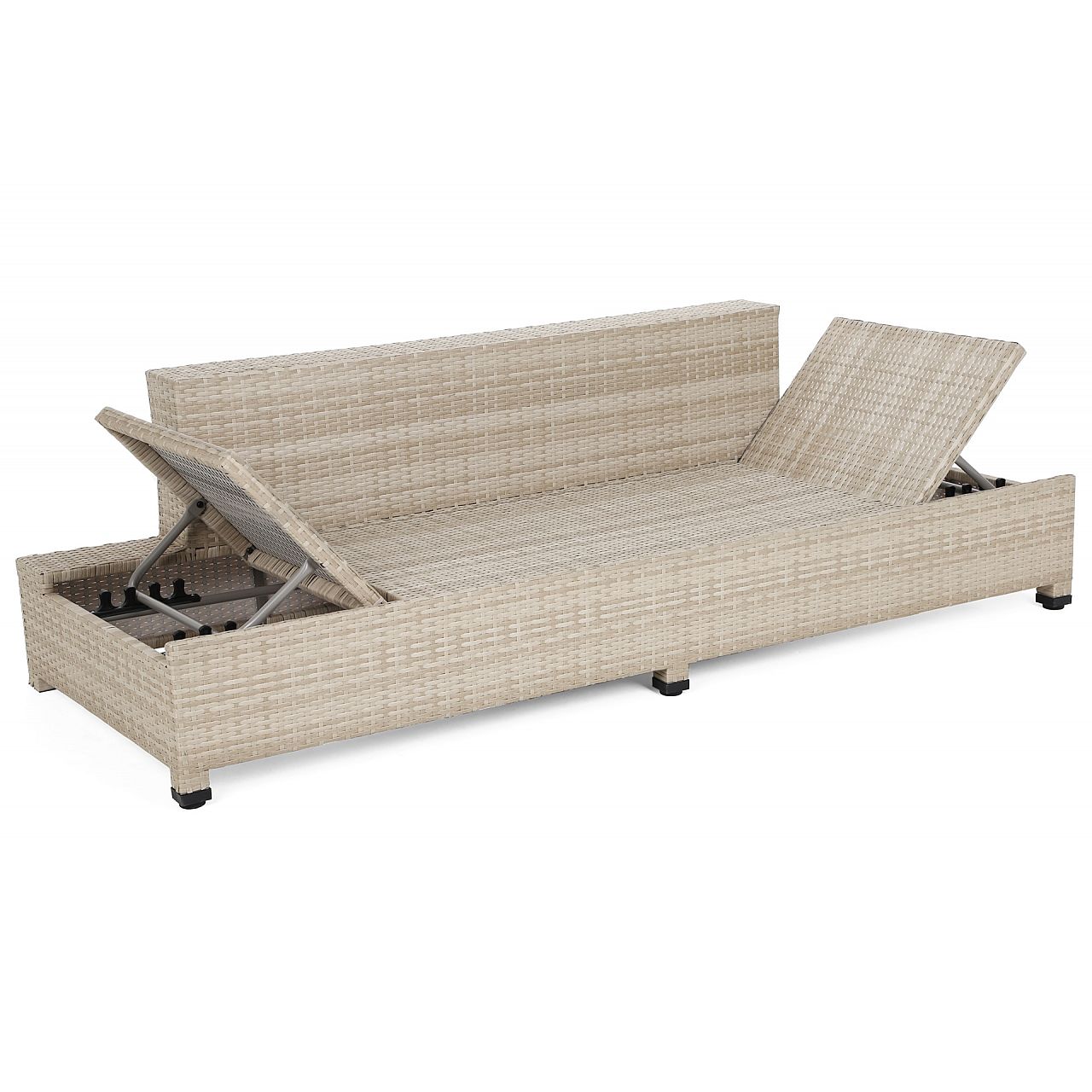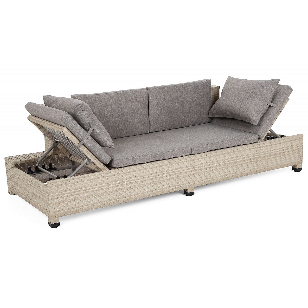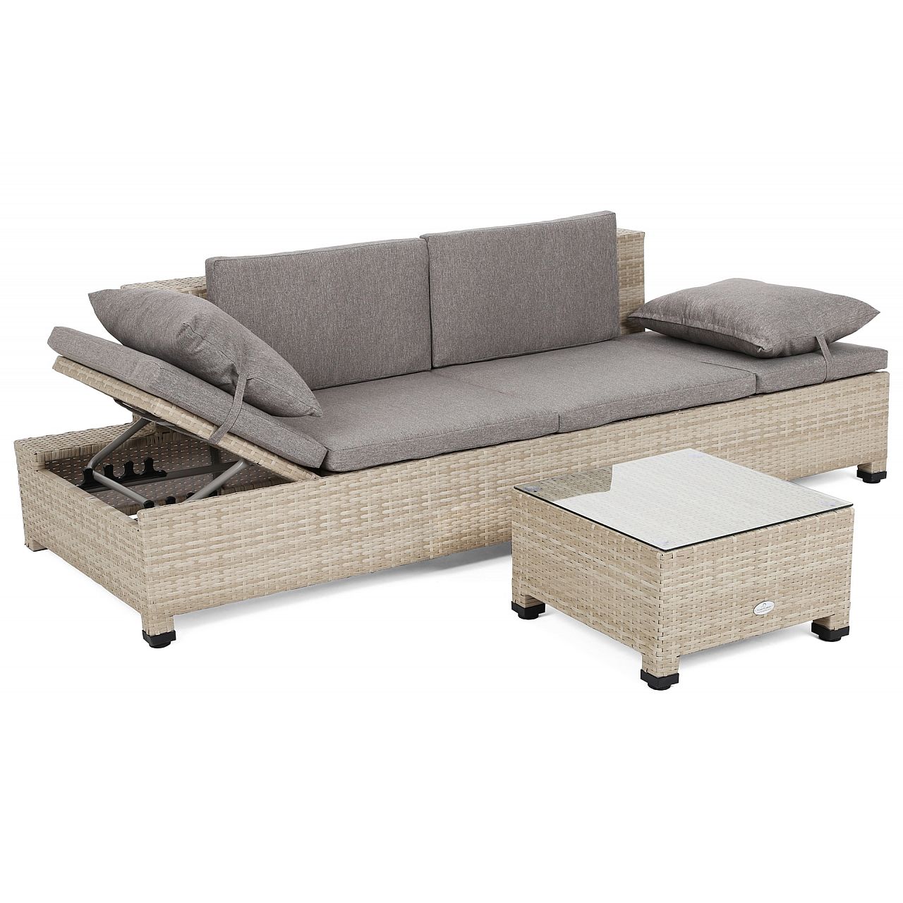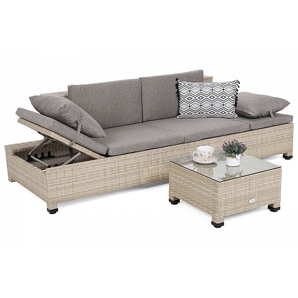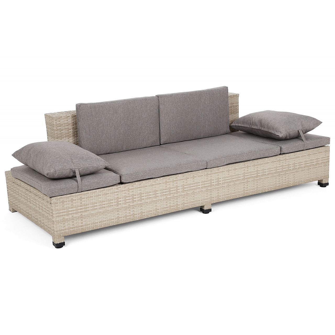 Садовий диван Milano 2 в 1 - лежак і великий зручний диван в одному. Конструкція дивана виконана з алюмінієвих профілів, пофарбованих порошковою фарбою, а вся частина обплетена міцним техноротангом. Диван має підголівники, що регулюються в п'яти напрямках, що дозволяє відрегулювати їх в максимально комфортне положення. Подушки, що входять у комплект, виготовлені з міцного матеріалу та мають блискавки, які дозволяють прати наволочки, тому підтримувати їх у чистоті без проблем. До дивана також входить невеликий журнальний столик зі стільницею із загартованого скла. Ніжки дивана і столу регулюються, що дозволяє вирівняти гарнітур на нерівній поверхні. Диван Milano впишеться як в сад або терасу, так і в інтер'єр. Ми перемо наволочки при 30°C.