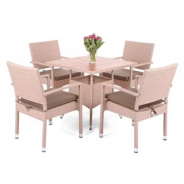Садові меблі з техноротангу Doris - надзвичайно функціональний і дуже зі смаком набір. Відрізняється високою якістю виконання та ретельною обробкою. Конструкція стільців і столу виконана з товстих алюмінієвих профілів, пофарбованих порошковою фарбою, а покриття - з міцного техноротанга, стійкого до несприятливих погодних умов. Стільниця виготовлена з композитних плит WPC, які стійкі до вологи, бруду та УФ-променів. Меблі підійдуть як на вулиці (сад, тераса, балкон), так і всередині будинку, кафе чи ресторану. Їх ексклюзивний характер підкреслюється алюмінієвими торцями стільців і ніжок столу, а також їх елегантною і ретельною обробкою, а зручні подушки роблять крісла ще зручнішими для сидіння.