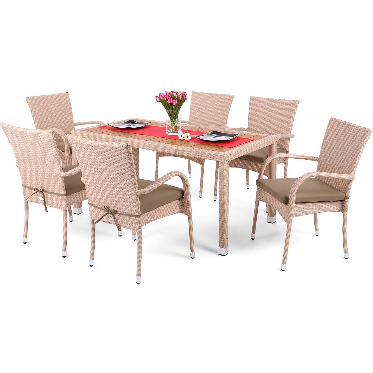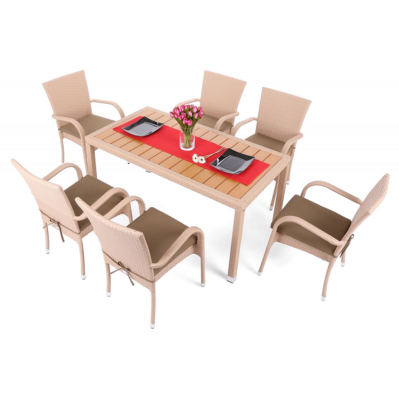 Mori - це елегантний набір меблів з техноратанга, ретельно оброблених. Меблі характеризуються високою якістю виготовлення: конструкція стільців і столу виконана з товстих алюмінієвих профілів з порошковим покриттям, а чохол виготовлений з міцного техноротанга, стійкого до несприятливих погодних умов. Дуже характерною особливістю цього набору є стільниця, яка виготовлена з композитних плит WPC - стійких до вологи, бруду та УФ-променів. Меблі підійдуть як на вулиці (сад, тераса, балкон), так і всередині будинку, кафе чи ресторану. М’яко вигнуті стільці виглядають дуже елегантно.