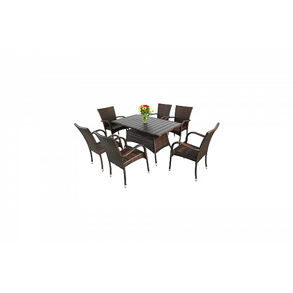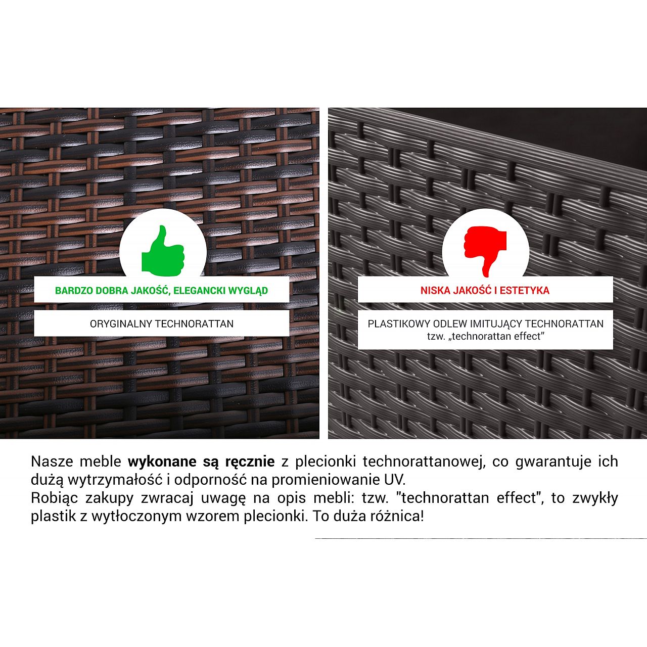 Mori - це елегантний набір меблів з техноратанга, ретельно оброблених. Меблі характеризуються високою якістю виготовлення: конструкція стільців і столу виконана з товстих алюмінієвих профілів з порошковим покриттям, а чохол виготовлений з міцного техноротанга, стійкого до несприятливих погодних умов. Дуже характерною особливістю цього набору є стільниця, яка виготовлена з композитних плит WPC - стійких до вологи, бруду та УФ-променів. Меблі підійдуть як на вулиці (сад, тераса, балкон), так і всередині будинку, кафе чи ресторану. М’яко вигнуті стільці виглядають дуже елегантно. Ретельна обробка меблів і алюмінієві кінці ніжок стільців і столу надають їм ексклюзивний характер. Полиця під стільницею є дуже практичним елементом - вона додає жорсткості конструкції, роблячи стіл дуже стійким, а також дозволяє зберігати журнали та інші дрібниці.