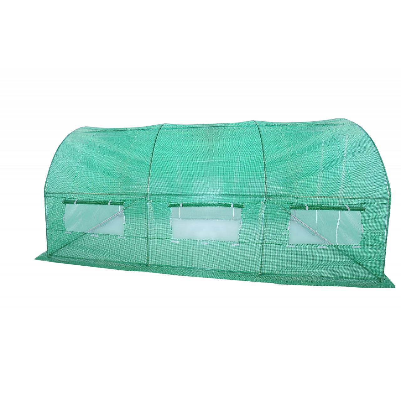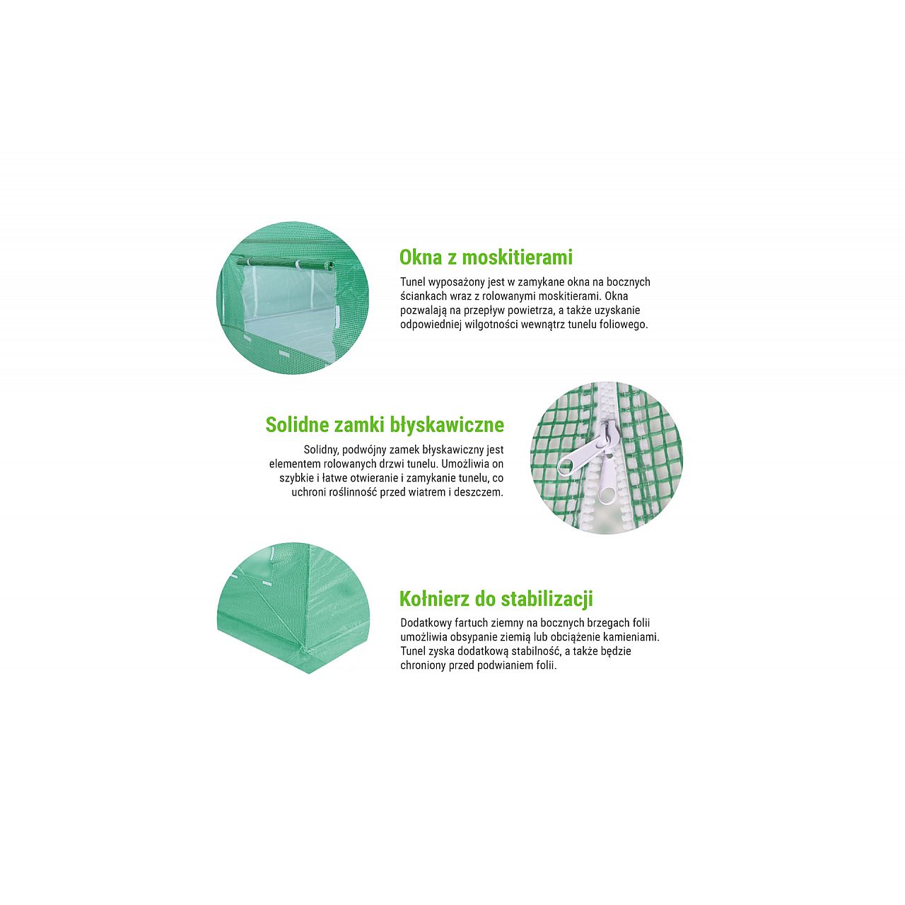 Бічні вікна, захищені москітними сітками, забезпечать вентиляцію та повітрообмін у садовому тунелі. Широкі двері оснащені двома блискавками, які при згортанні можна закріпити над входом за допомогою засувок.