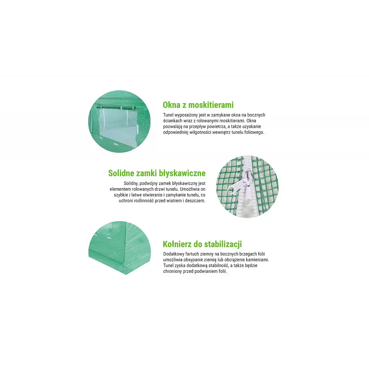 Тунель обладнаний 10 вікнами з москітними сітками, які забезпечують належну вентиляцію та захищають рослини від шкідників. Крім того, тунель для культивації розміром 3 × 8 м забезпечує відповідну температуру для росту рослин та захищає від опадів. Завдяки цьому посіви краще захищені, а умови всередині тунелю залишаються оптимальними для вирощування овочів, квітів та фруктів.