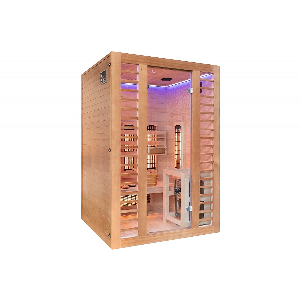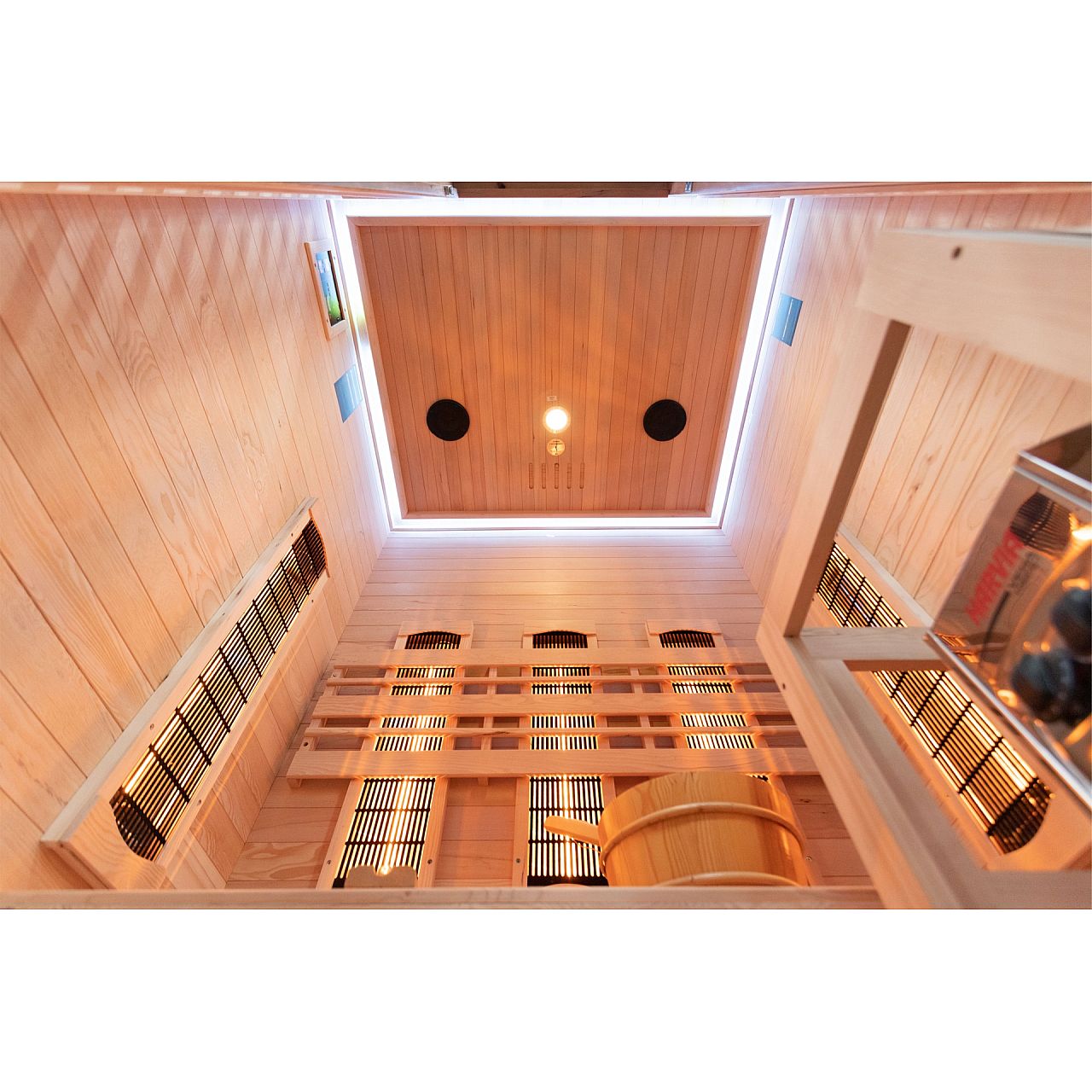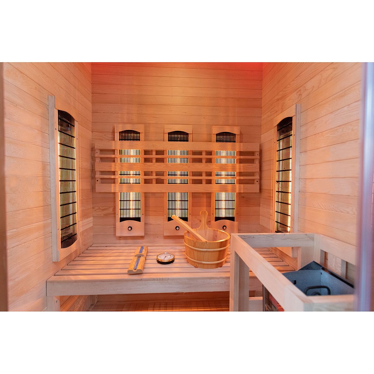 Обладнання:• radio multimedialne z USB/BT • dwa stereofoniczne głośniki zamocowane w suficie sauny • oświetlenie wewnętrzne • piec i kamienie • 2 panele sterujące: zewnętrzny i wewnętrzny (umożliwia nam zmianę parametrów pracy sauny bez konieczności wychodzenia z sauny podczas relaksu) • ceber z chochlą na wodę do zraszania kamieni • termometr • klepsydra (do odmierzania czasu seansu w saunie) • dodatkowe oświetlenie LED RGB | |