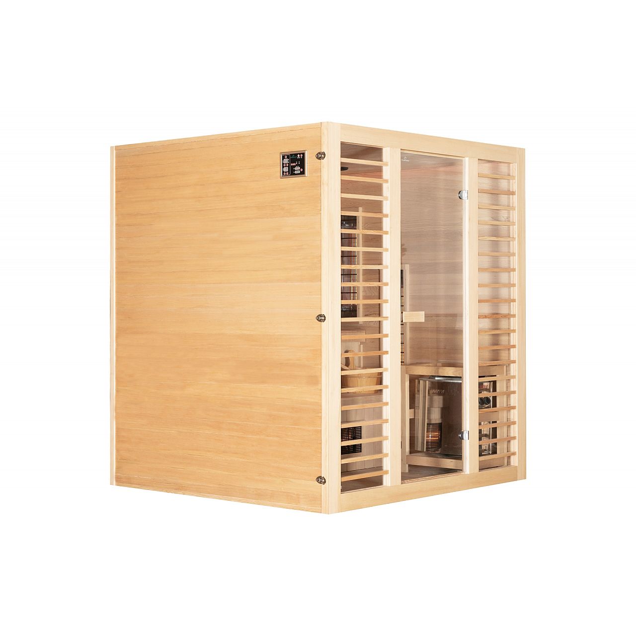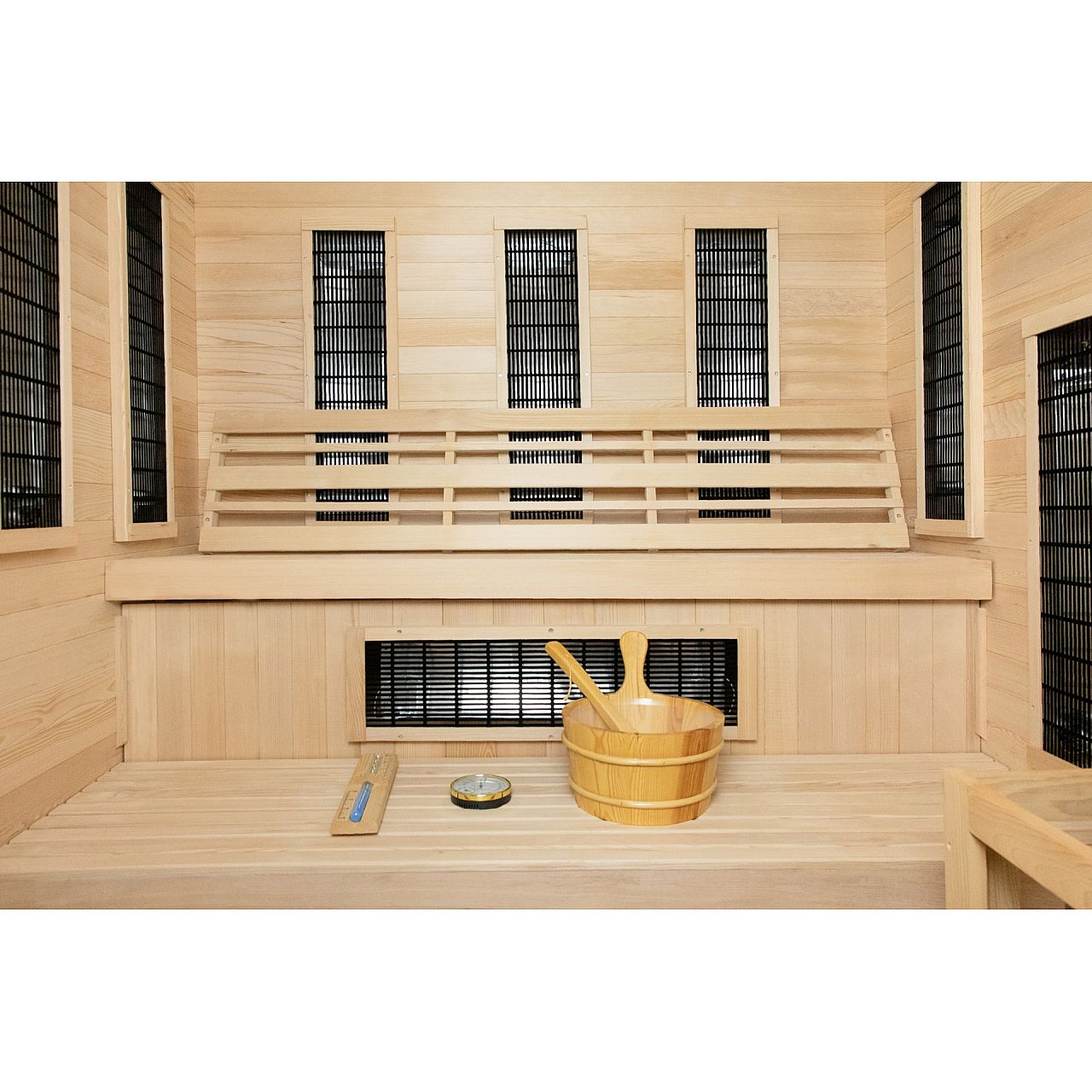 Обладнання:• мультимедійне радіо з USB/BT • два стереодинаміки, встановлені в стелі сауни • внутрішнє освітлення • піч і каміння • 2 панелі управління: зовнішня та внутрішня (дозволяє змінювати параметри роботи сауни, не виходячи з сауни під час відпочинку) • відерце з черпаком для води для посипання каменів • термометр • пісочний годинник (для вимірювання часу відвідування сауни) • додаткове RGB LED освітлення | |