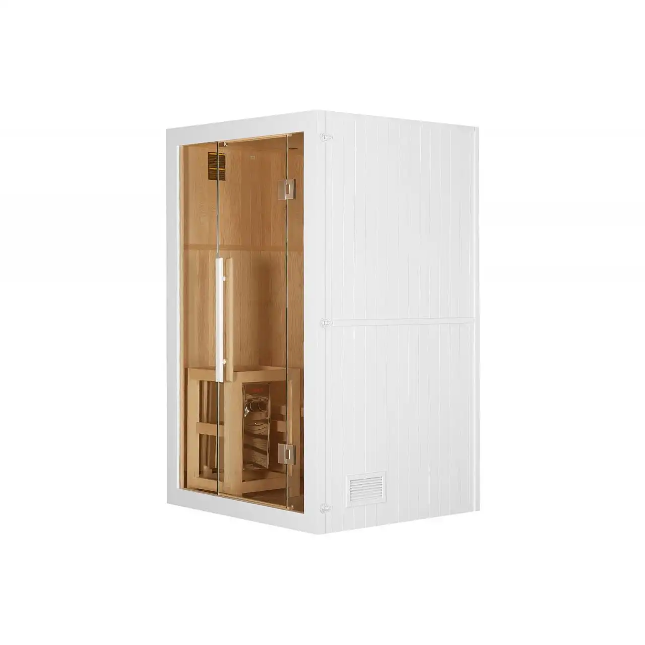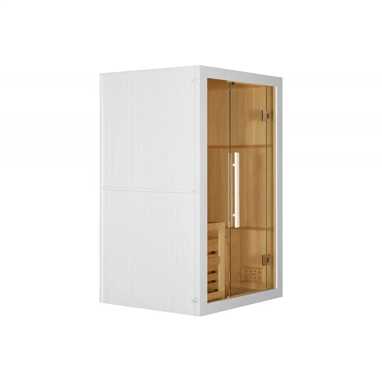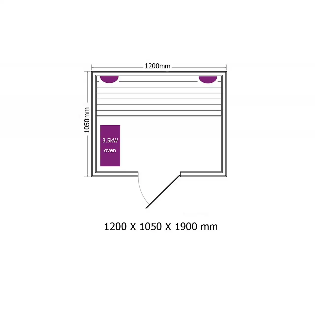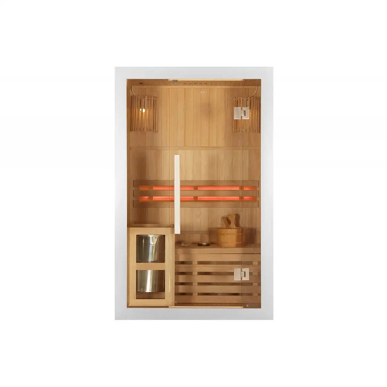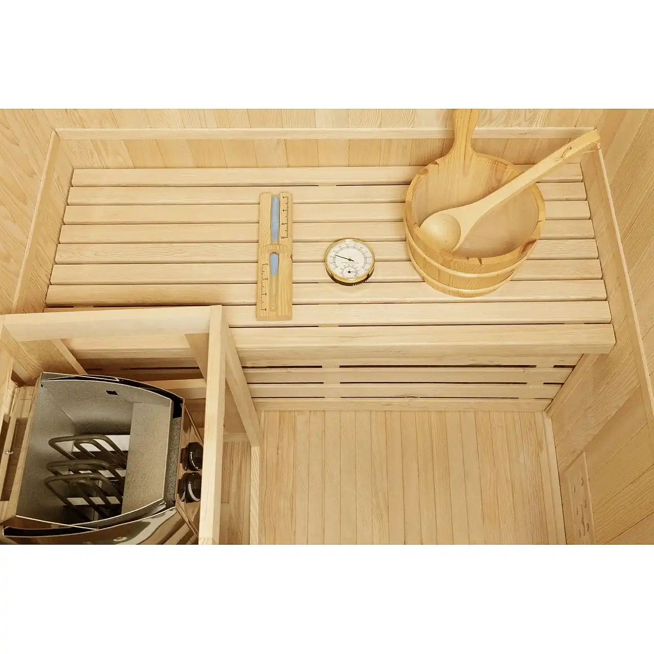 | Обладнання | • внутрішнє освітлення з окремою вилкою • піч і каміння • відро з черпаком для поливу каменів • гігрометр (вимірювання вологості) • пісочний годинник (для вимірювання часу відвідування сауни) • додаткове RGB LED освітлення |