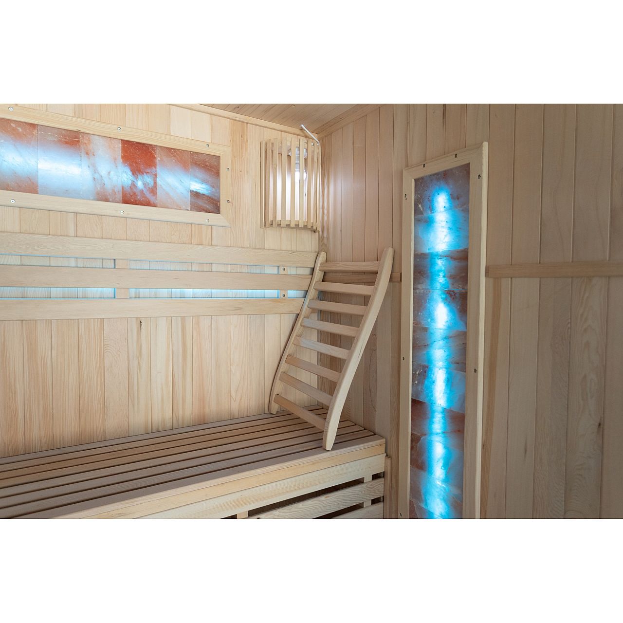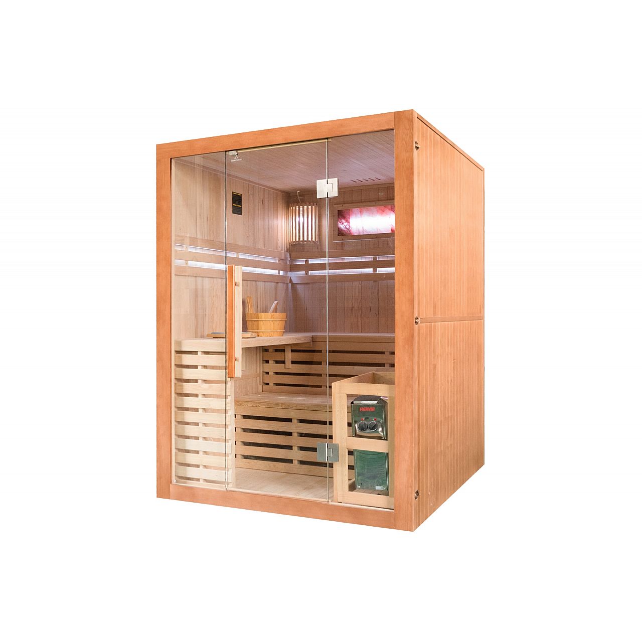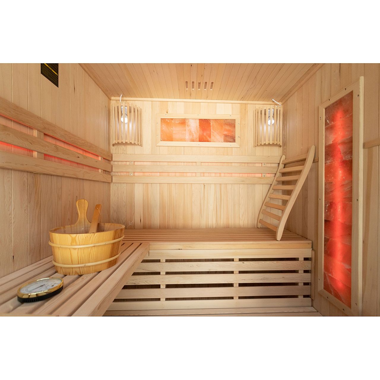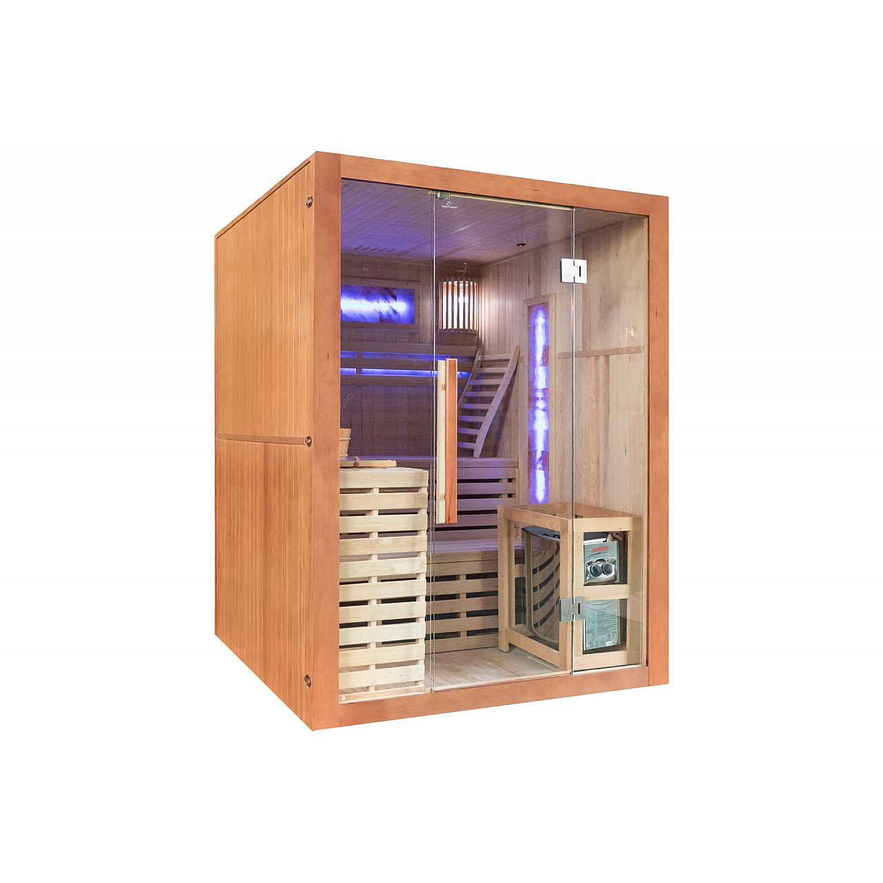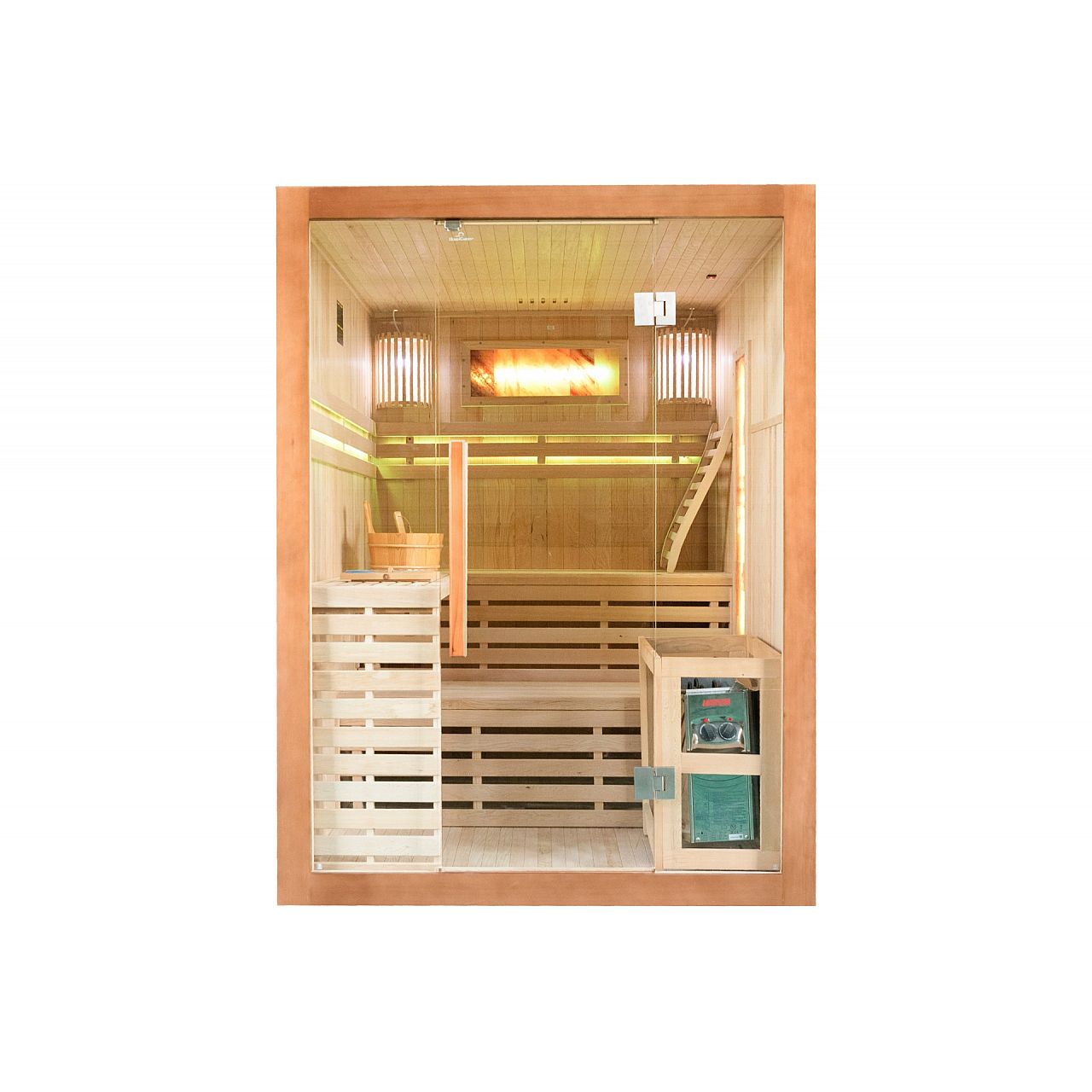 Обладнання | внутрішнє освітлення з окремою вилкою, піч та каміння, відро з ополоником для посипання каміння, гігрометр (вимірювання вологості), пісочний годинник (для вимірювання часу сеансу сауни), додаткове RGB-світлодіодне освітлення |