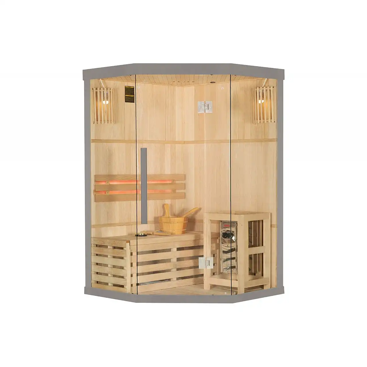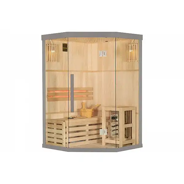 Обладнання | • внутрішнє освітлення з окремою вилкою • піч і каміння • відро з черпаком для поливу каменів • гігрометр (вимірювання вологості) • пісочний годинник (для вимірювання часу відвідування сауни) • додаткове RGB LED освітлення |