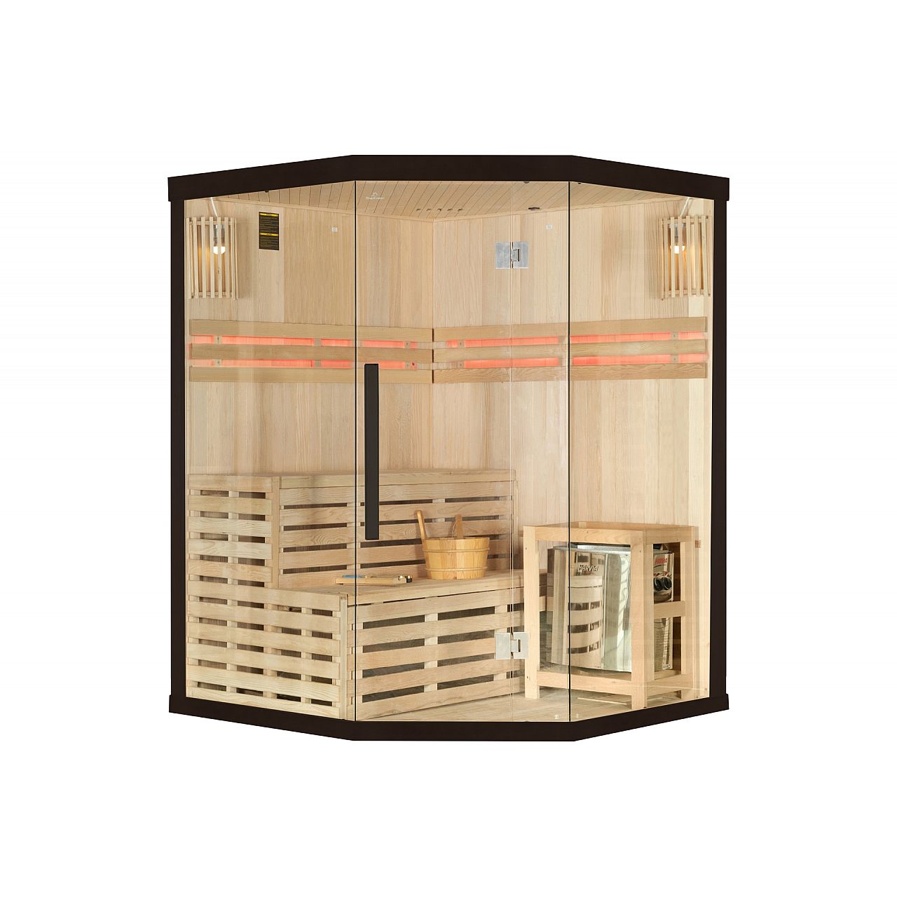 Обладнання | внутрішнє освітлення з окремою вилкою, піч і каміння, відро з черпаком для поливання каміння; гігрометр (вимірювання вологості), пісочний годинник (для вимірювання часу відвідування сауни), додаткове RGB LED освітлення |