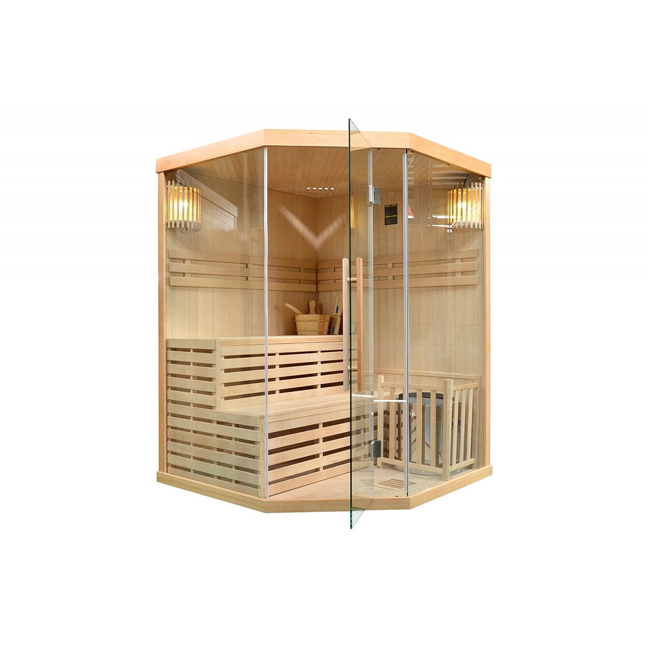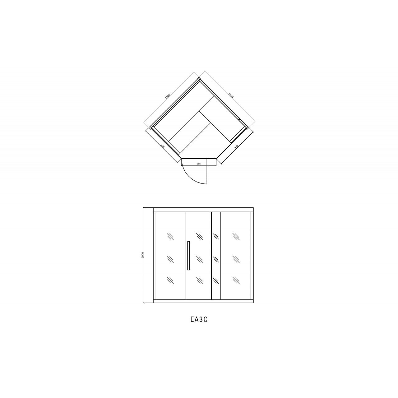Кутова фінська сауна для дому EA3C виготовлена з канадської ялиці. Кабіна стійка до механічних пошкоджень і вологи. Дверцята виготовлені з міцного скла, яке не тріскається навіть при контакті з високими температурами.