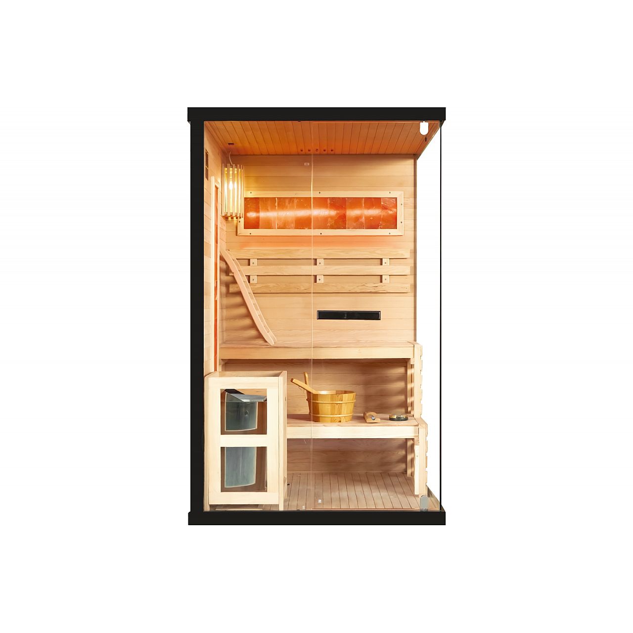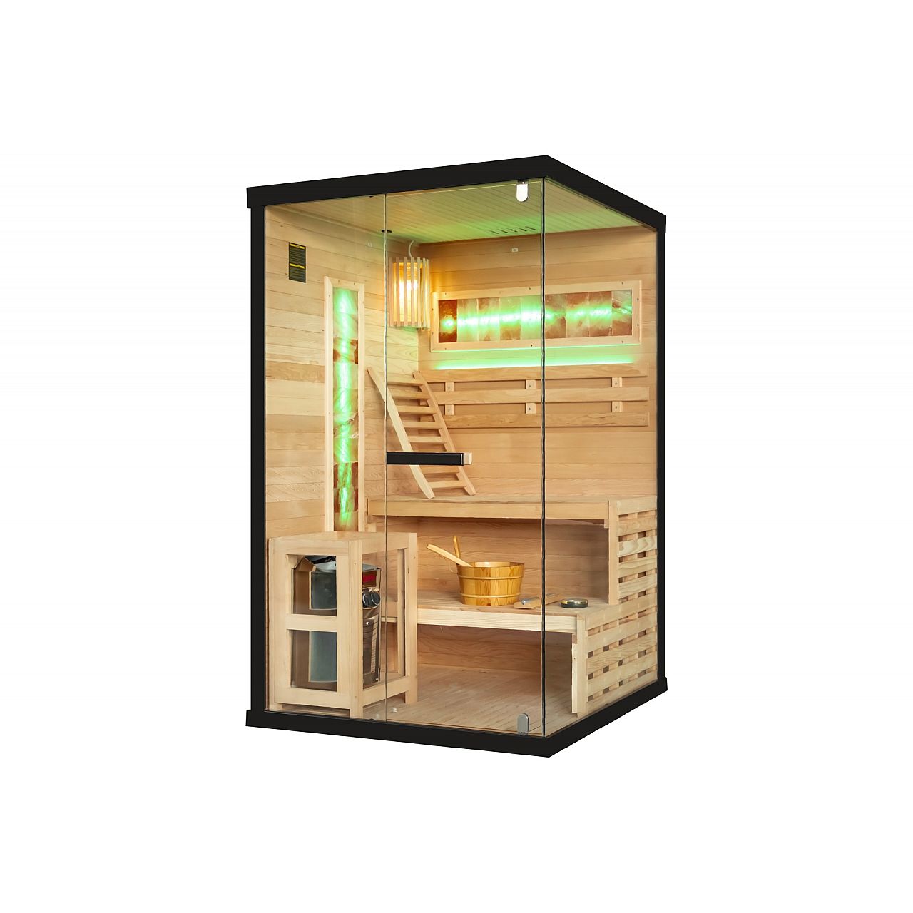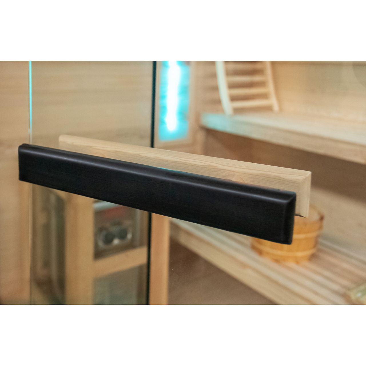 Обладнання | • внутрішнє освітлення • піч і каміння • дві соляні панелі з особливими цілющими властивостями • відро з черпаком для води для посипання каміння • термометр • пісочний годинник (для вимірювання часу відвідування сауни) • світлодіодне освітлення |