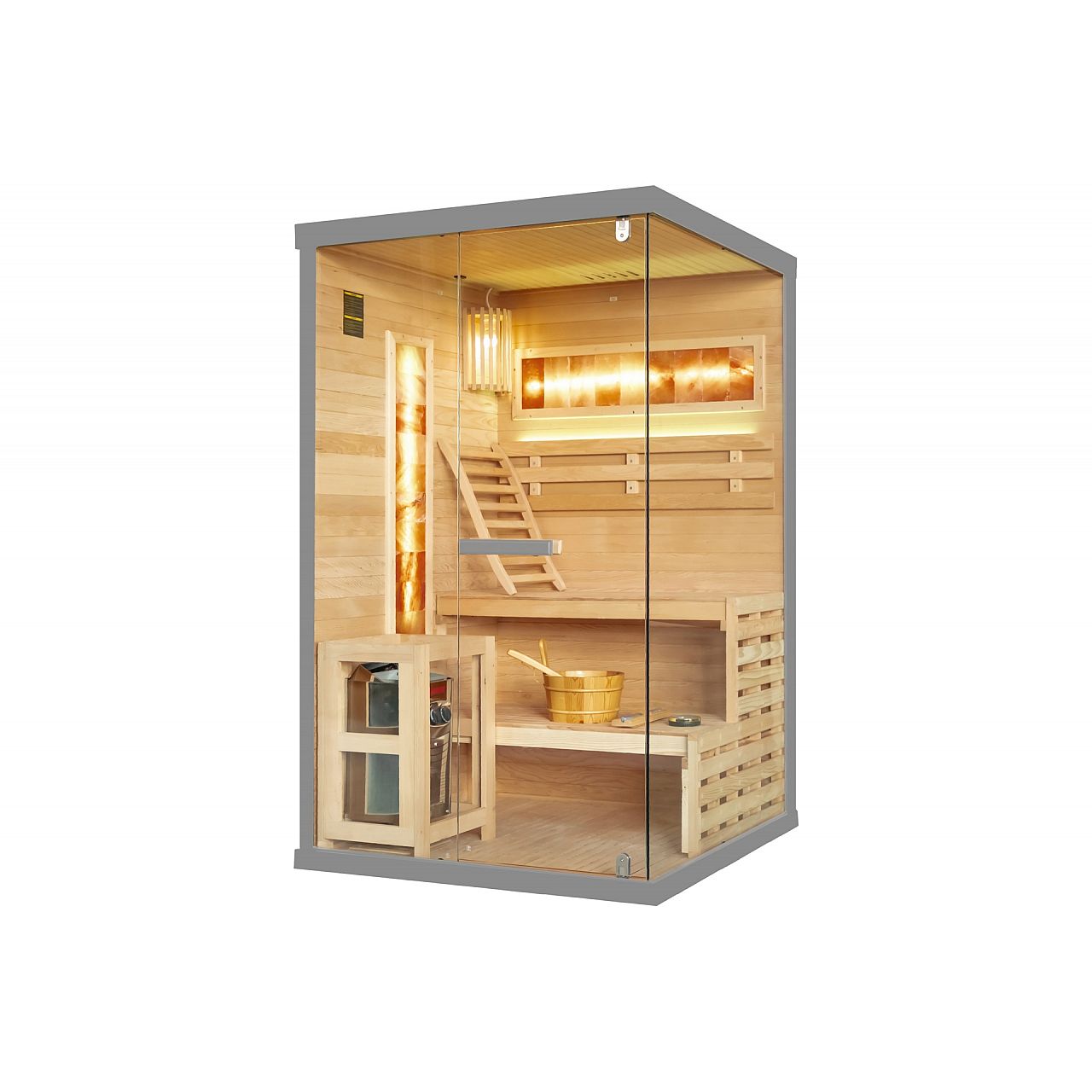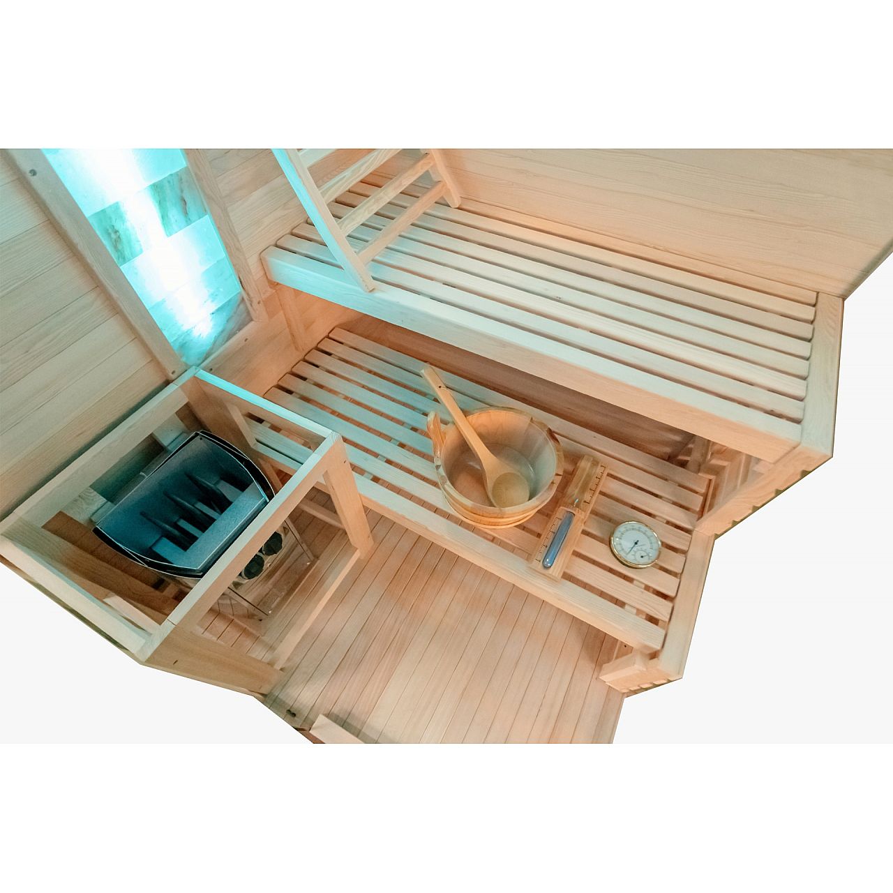 Обладнання | • oświetlenie wewnętrzne • piec i kamienie • dwa panele solne o szczególnych właściwościach leczniczych • ceber z chochlą na wodę do zraszania kamieni • termometr • klepsydra (do odmierzania czasu seansu w saunie) • oświetlenie LED |