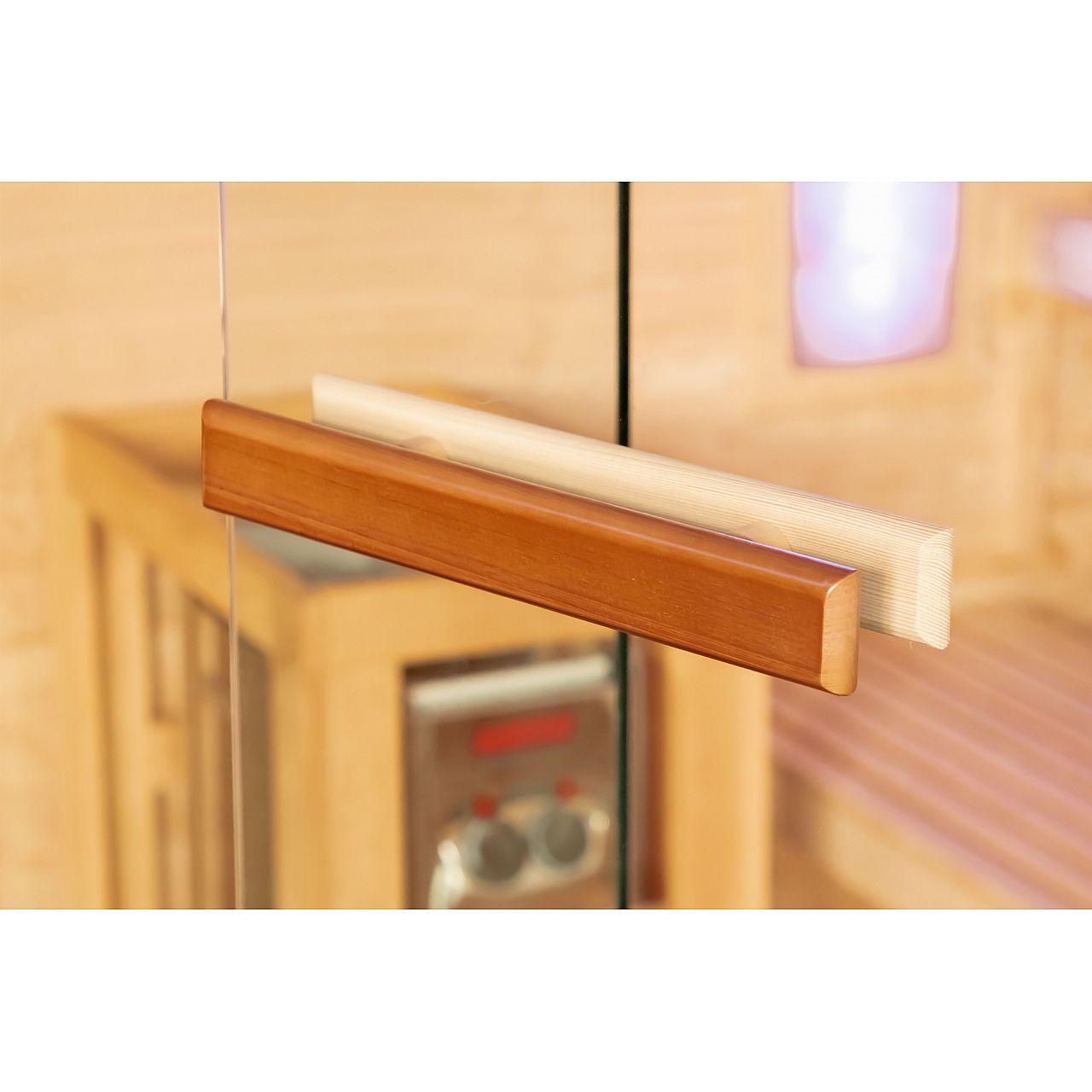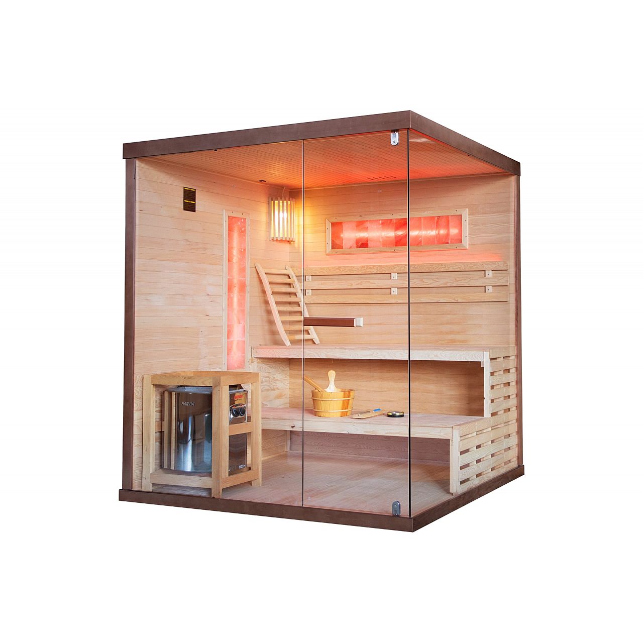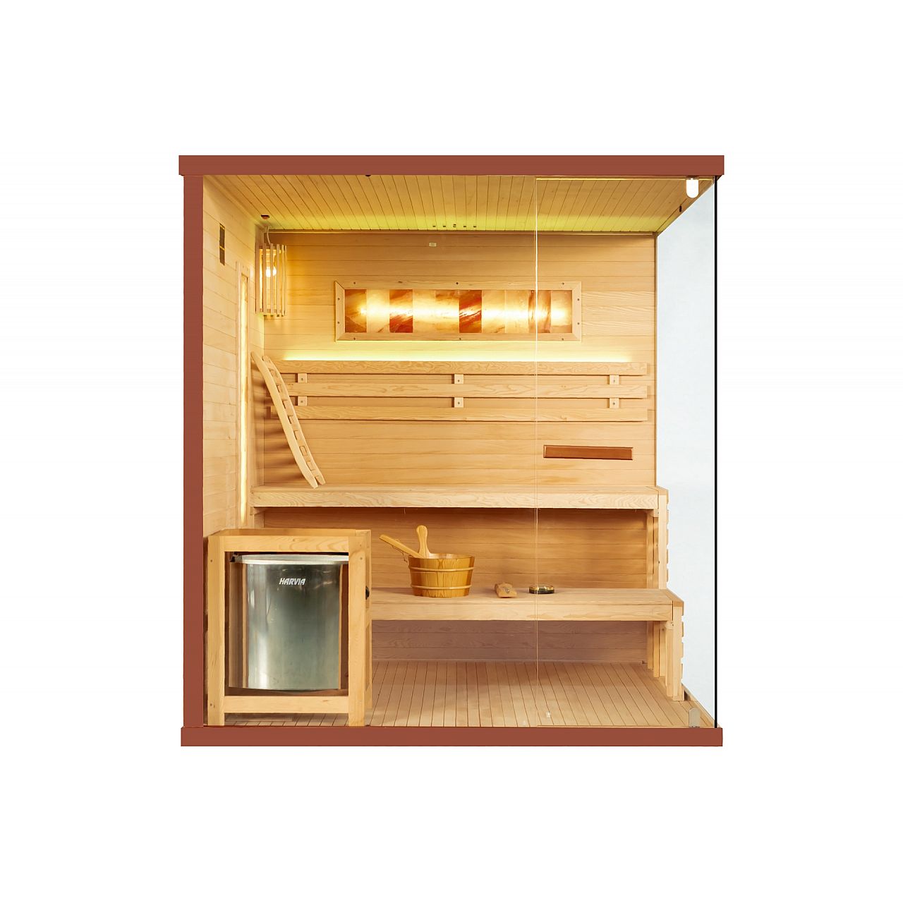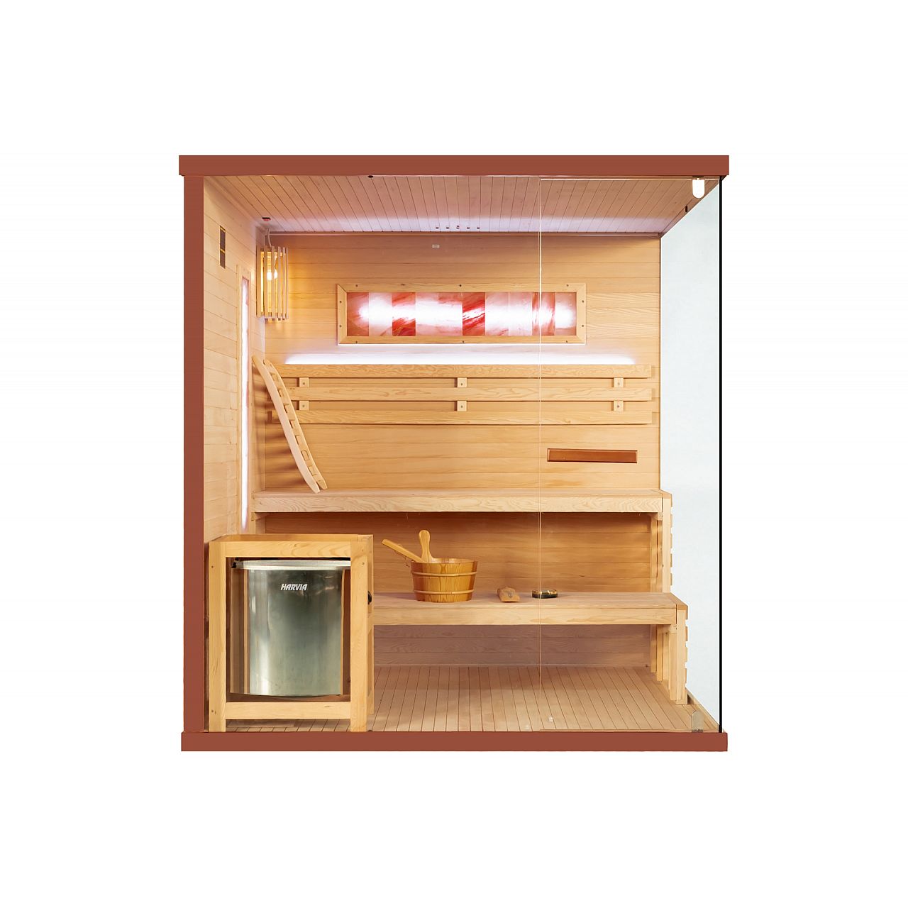 Обладнання | • внутрішнє освітлення • піч та камені • дві соляні панелі зі спеціальними цілющими властивостями • відро з ополоником для води, щоб посипати каміння • термометр • пісочний годинник (для вимірювання часу сеансу сауни) • світлодіодне освітлення |