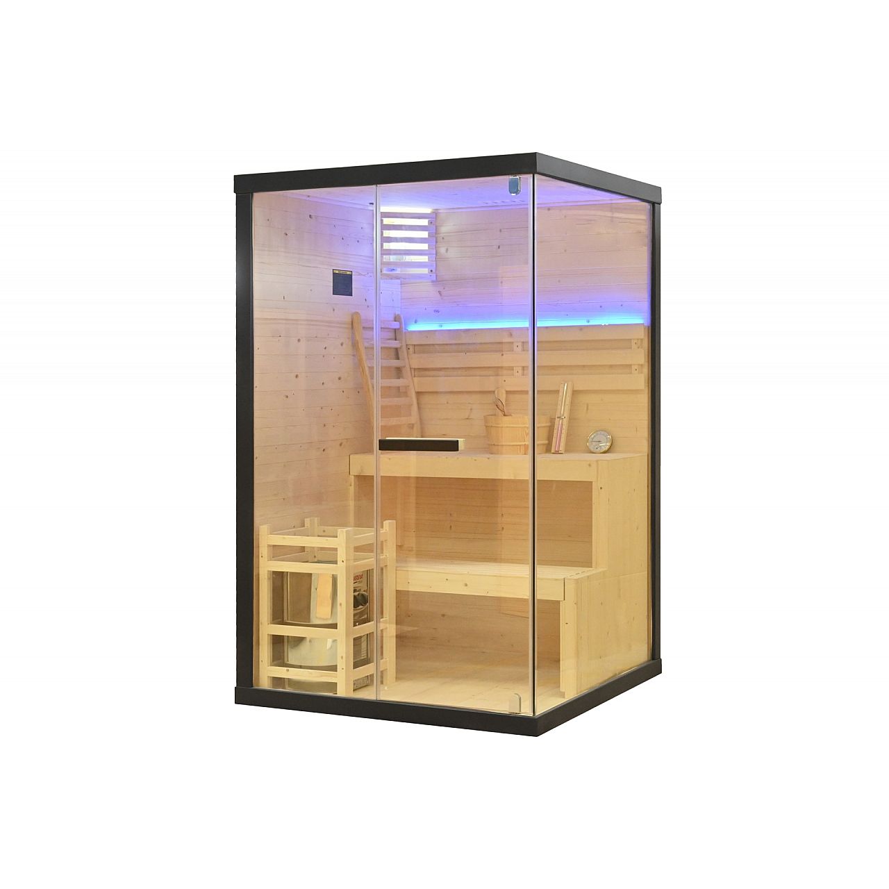 Обладнання | • внутрішнє освітлення • піч і каміння • відро з черпаком для поливу каміння • термометр • пісочний годинник (для вимірювання часу відвідування сауни) • світлодіодне освітлення |