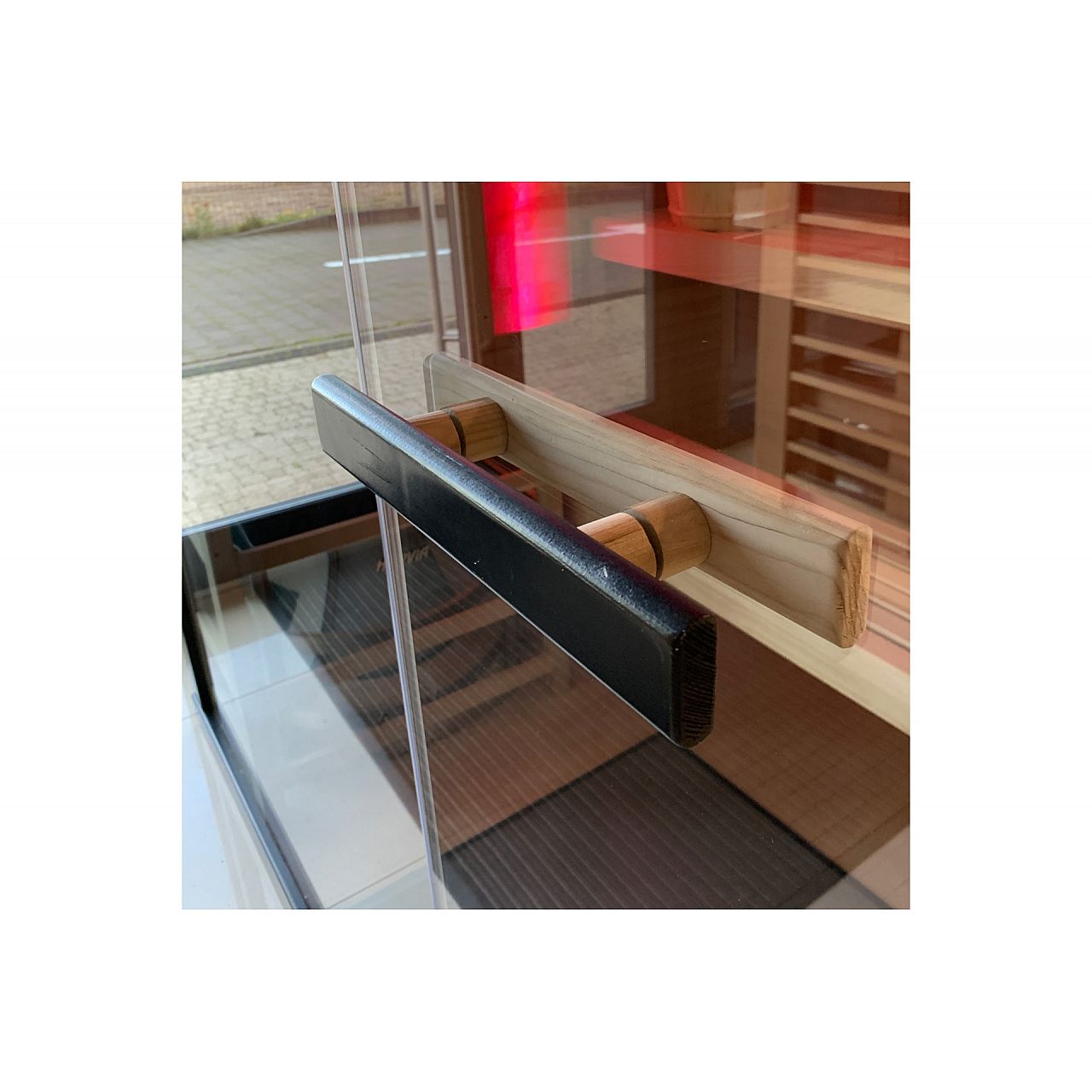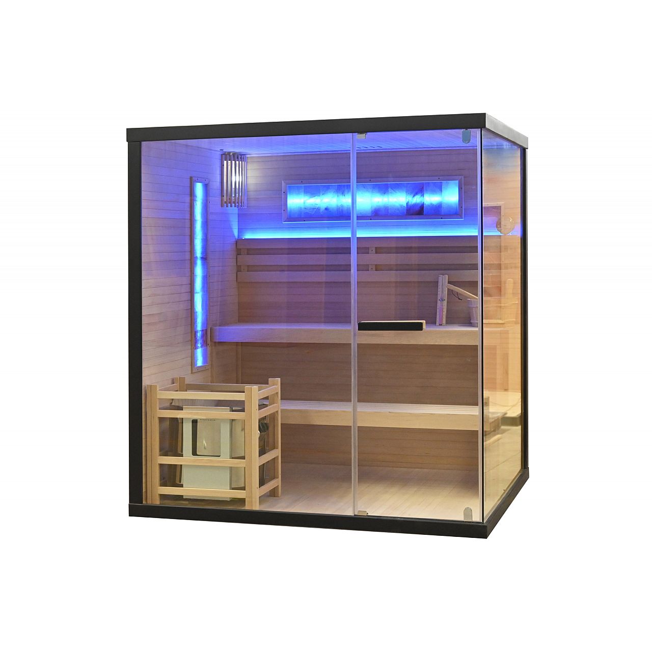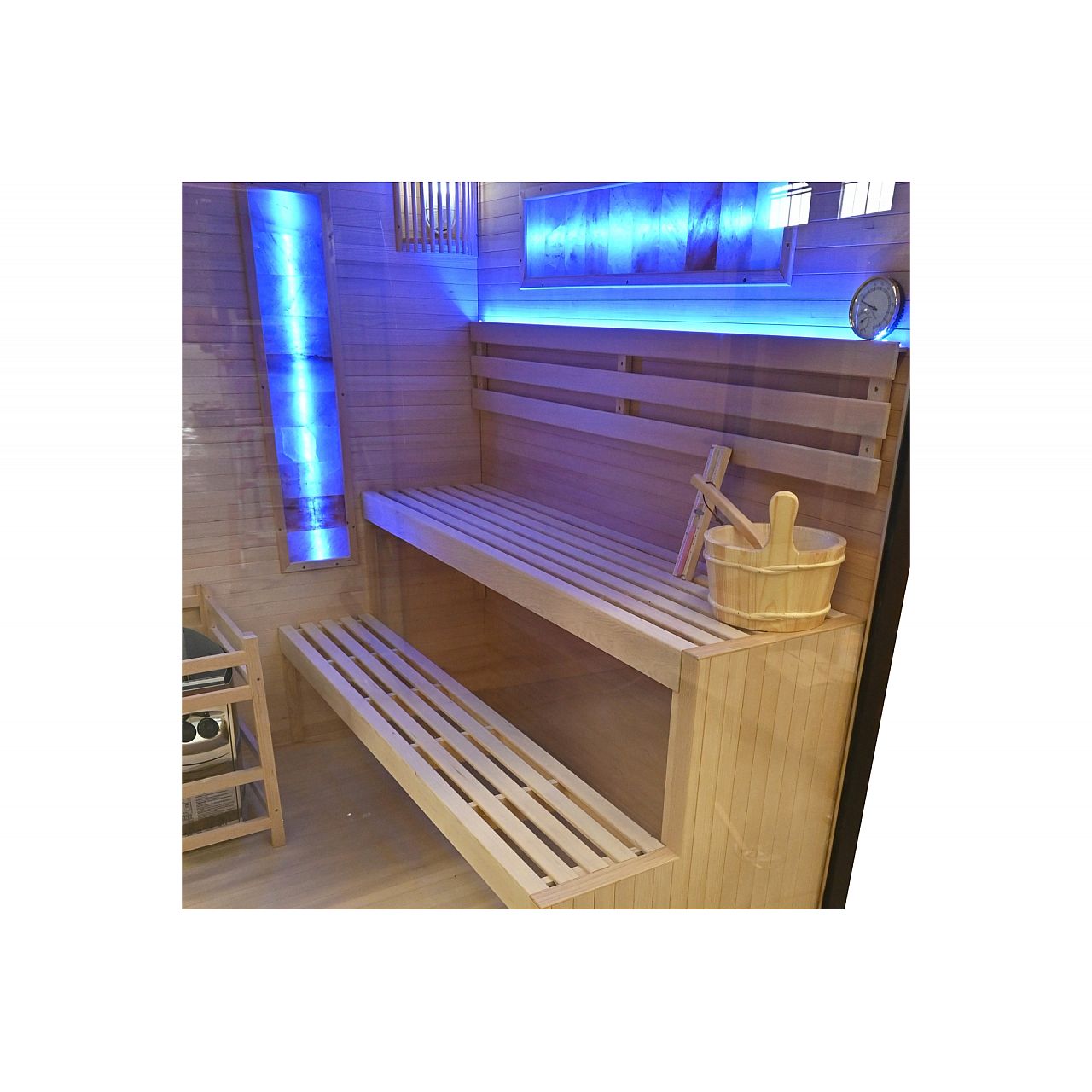 Обладнання | • внутрішнє освітлення • піч і каміння • дві соляні панелі з особливими цілющими властивостями • відро з черпаком для води для посипання каміння • термометр • пісочний годинник (для вимірювання часу відвідування сауни) • світлодіодне освітлення |