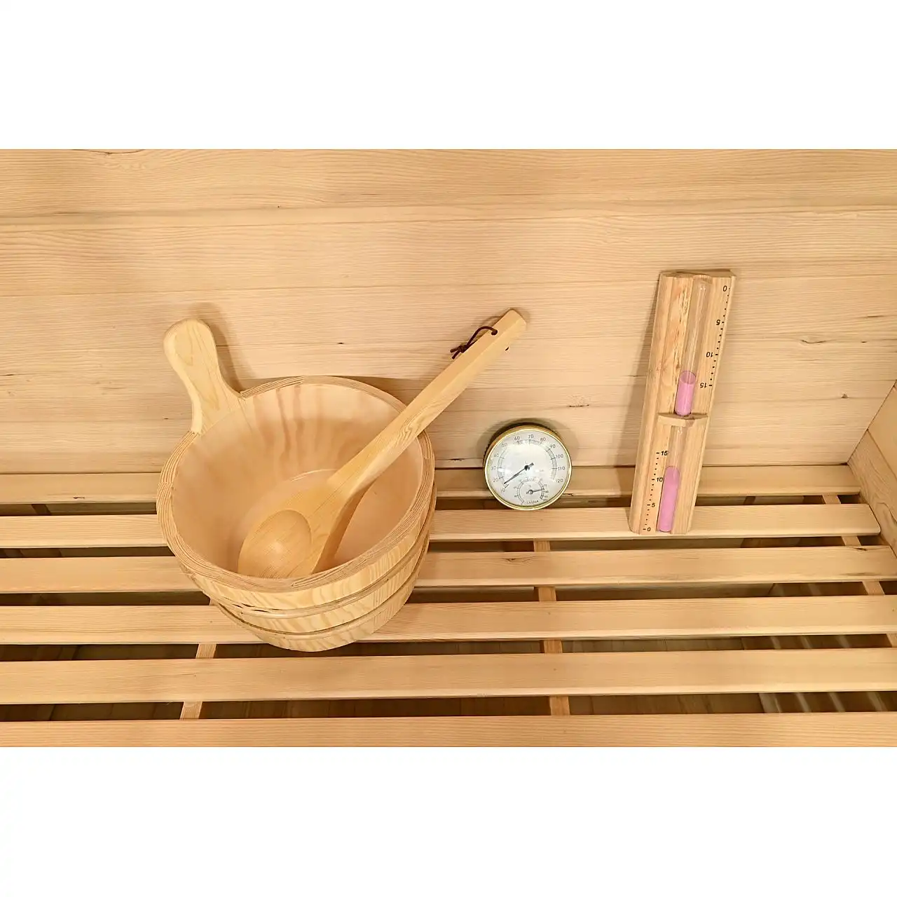 | Обладнання | • внутрішнє освітлення • піч і каміння • відро з черпаком для поливання каміння • гігрометр (вимірювання вологості) • пісочний годинник (для вимірювання часу відвідування сауни) |