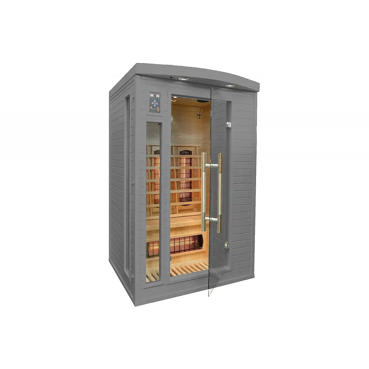 Інфрачервона сауна (інфрачервона, низькотемпературна) без пари і з низькою температурою повітря (до 60°C), де замість традиційних печей використовуються кварцові, керамічні або вугільні інфрачервоні обігрівачі. Кабіну з канадської ялиці можна встановити у ванній, спальні, вітальні або будь-якій іншій кімнаті. Для роботи достатньо звичайного джерела живлення 230В. Після ввімкнення сауна налаштована на заводі на 60 хвилин. Він має автоматичний вимикач, який запобігає випадковому залишанню сауни увімкненою на надто довгий час, що робить її безпечною у використанні. Радіатори захищені дерев'яними сітками.