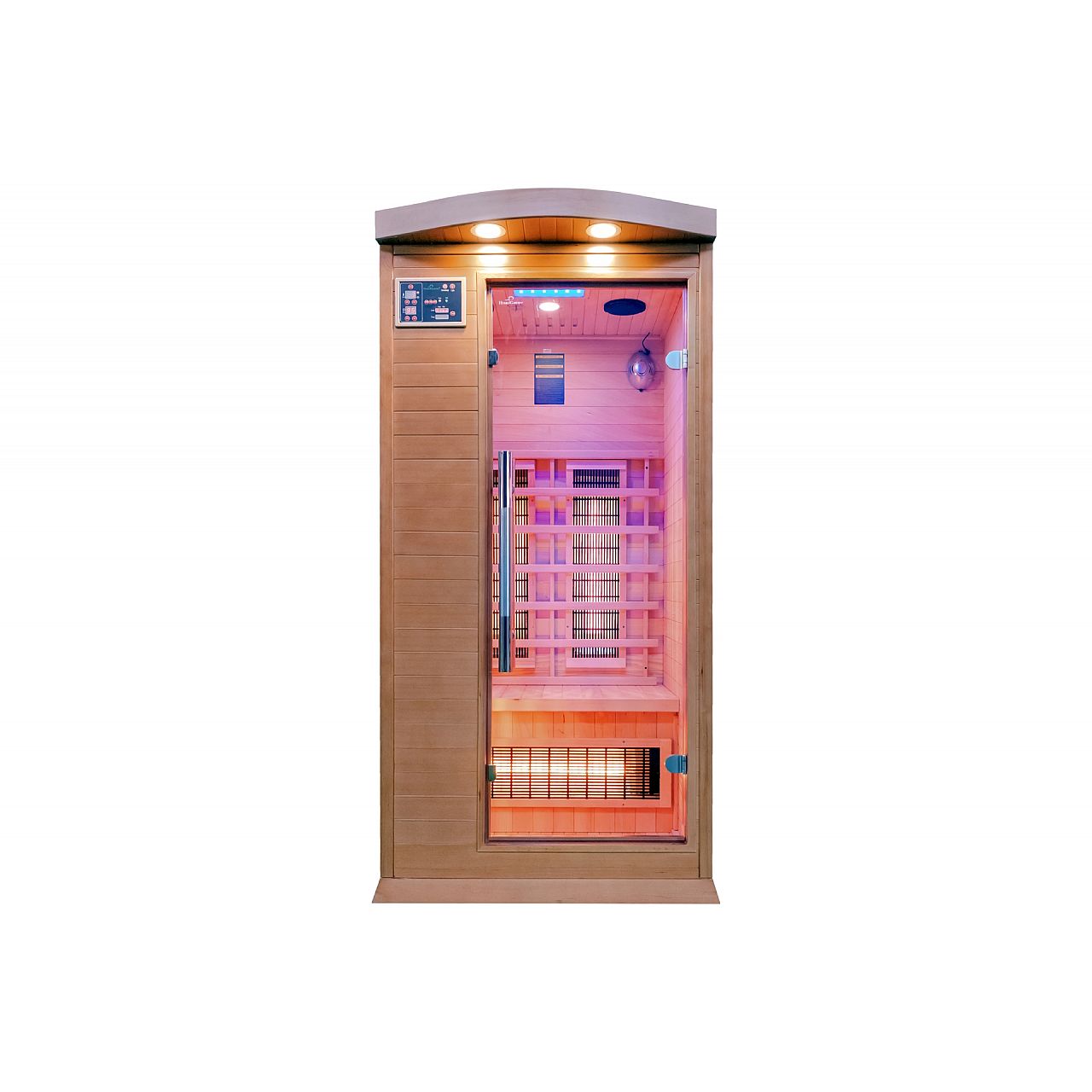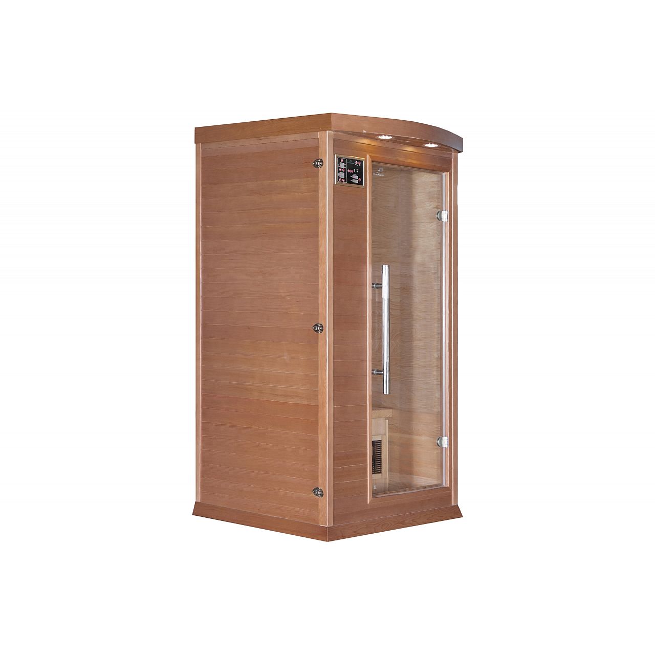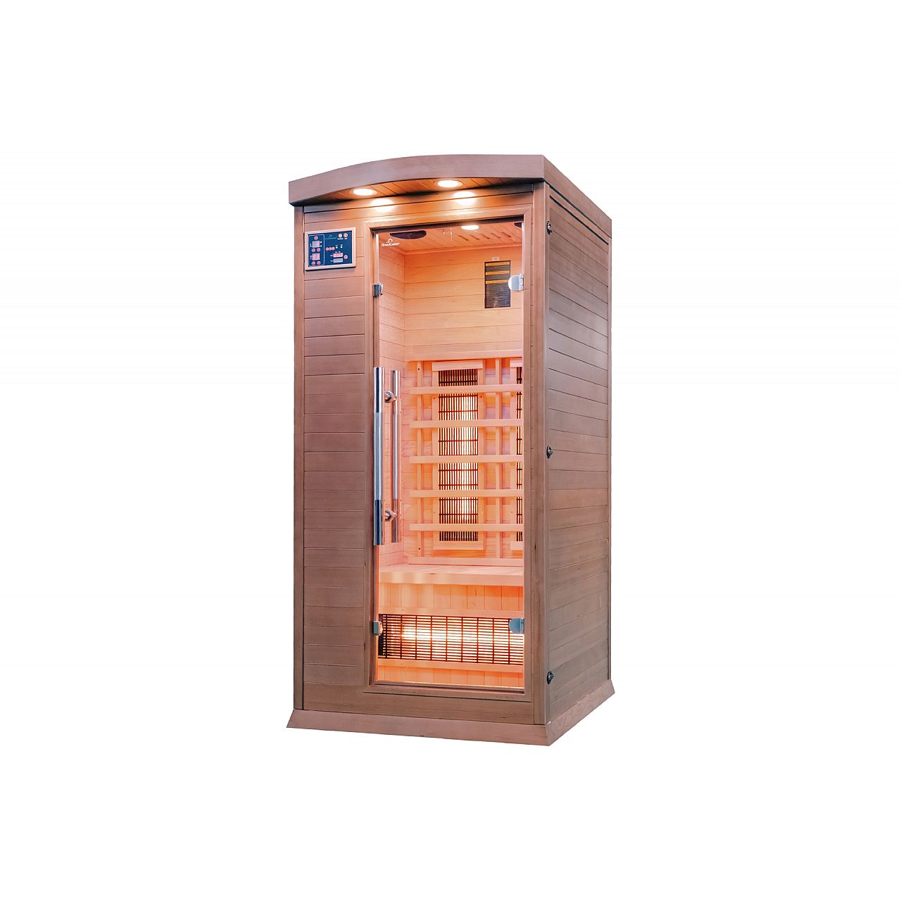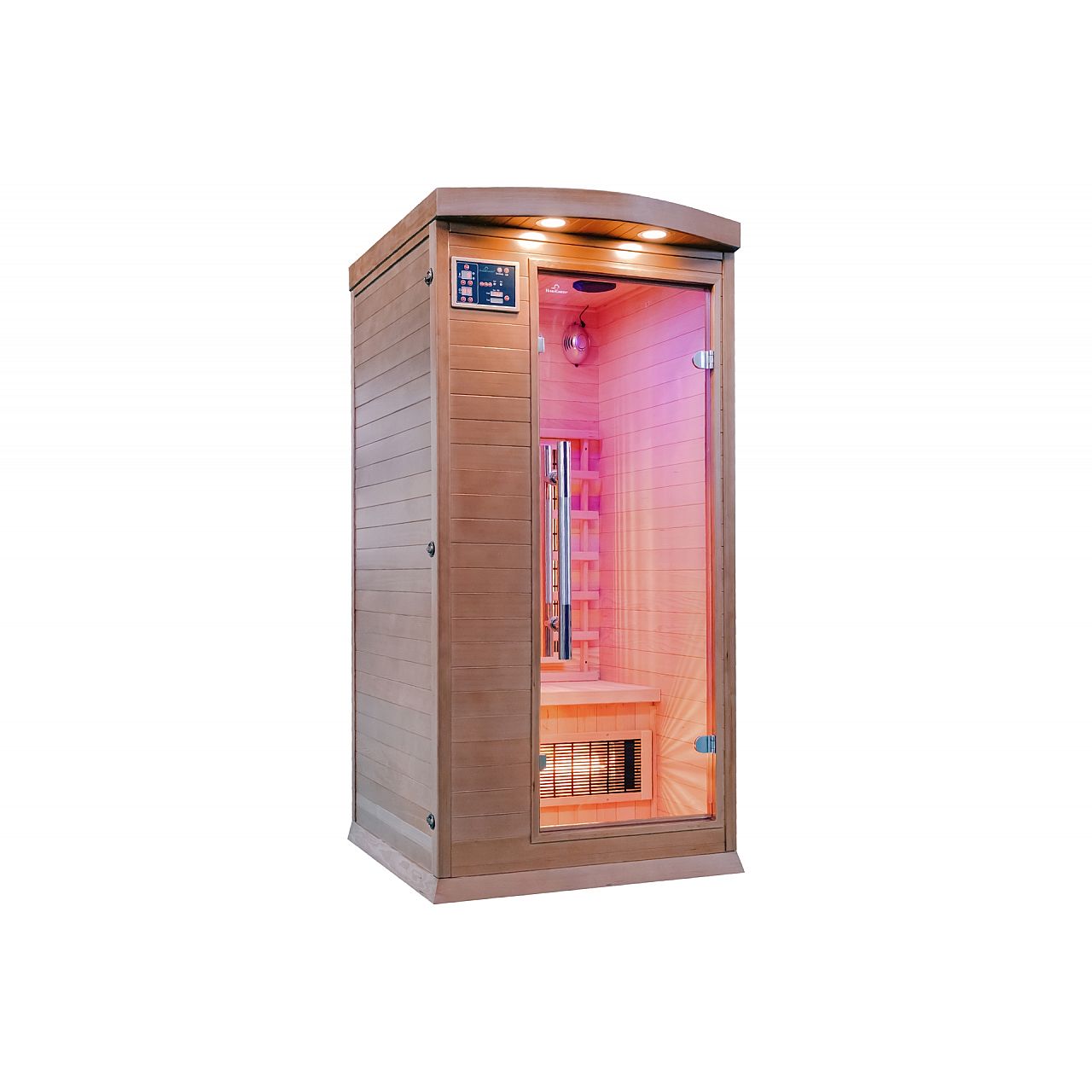 Інфрачервона сауна (інфрачервона, низькотемпературна) без пари і з низькою температурою повітря (до 60°C), де замість традиційних печей використовуються кварцові, керамічні або вугільні інфрачервоні обігрівачі. Кабіну з канадської ялиці можна встановити у ванній, спальні, вітальні або будь-якій іншій кімнаті. Для роботи достатньо звичайного джерела живлення 230В. Після ввімкнення сауна налаштована на заводі на 60 хвилин. Він має автоматичний вимикач, який запобігає випадковому залишанню сауни увімкненою на надто довгий час, що робить її безпечною у використанні. Радіатори захищені дерев'яними сітками.