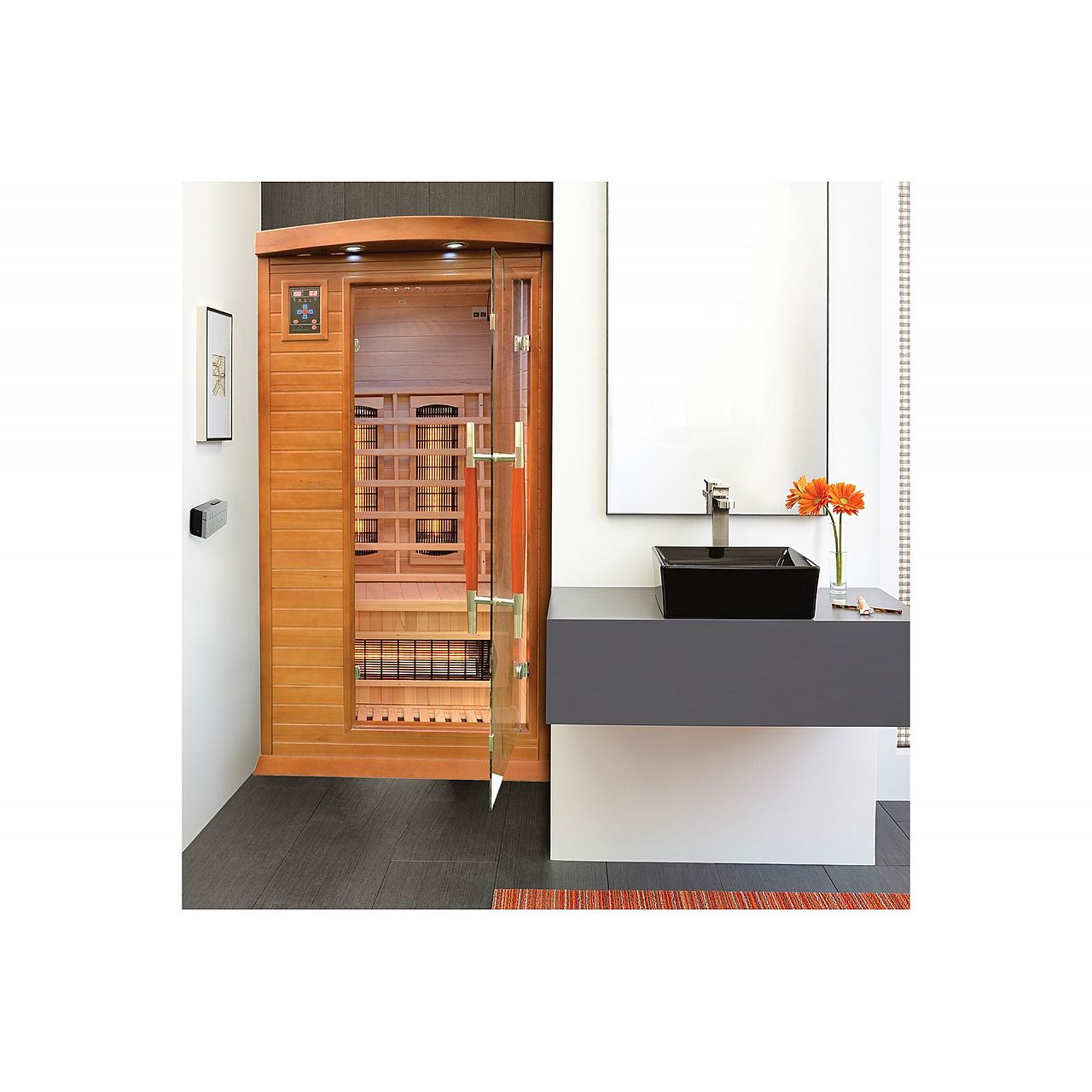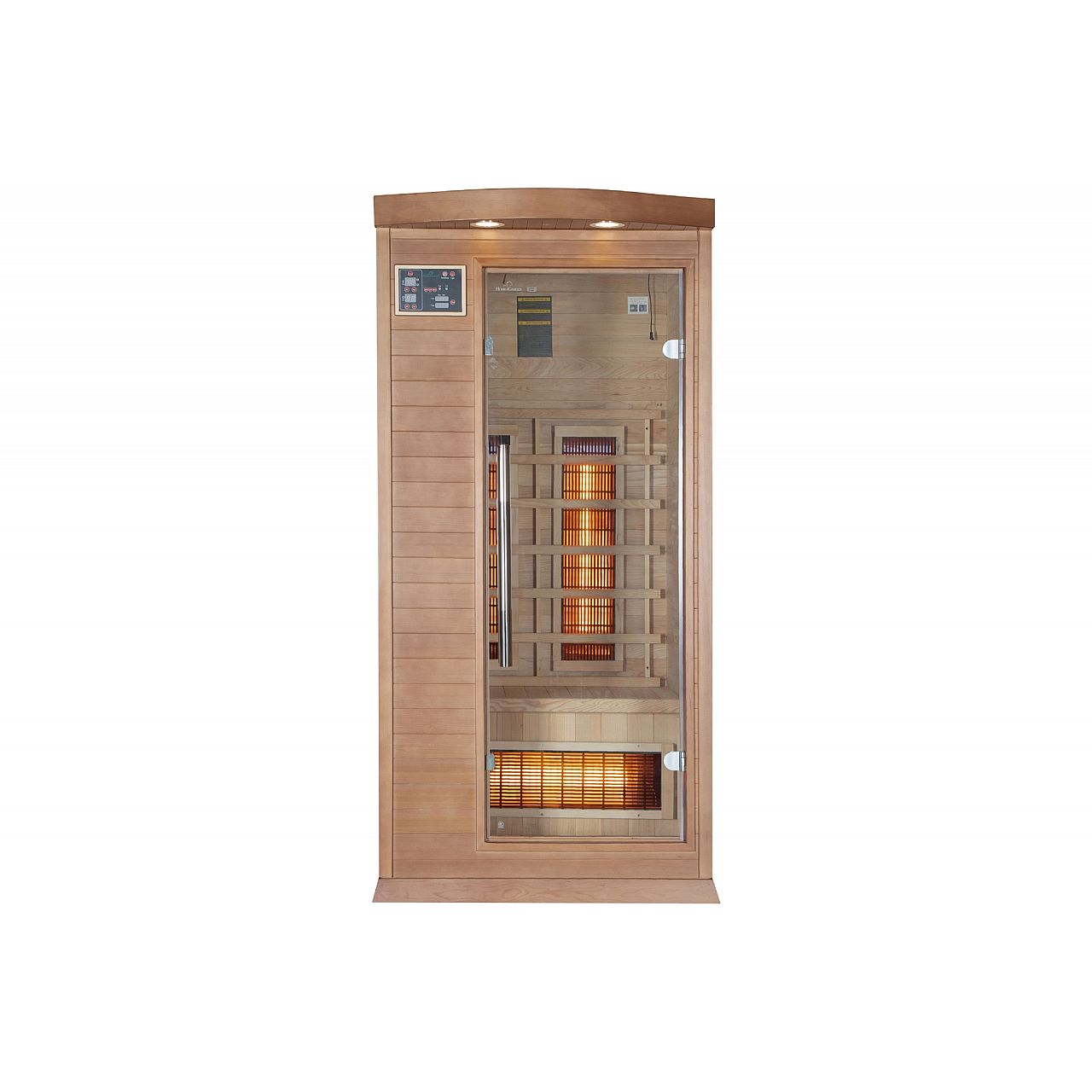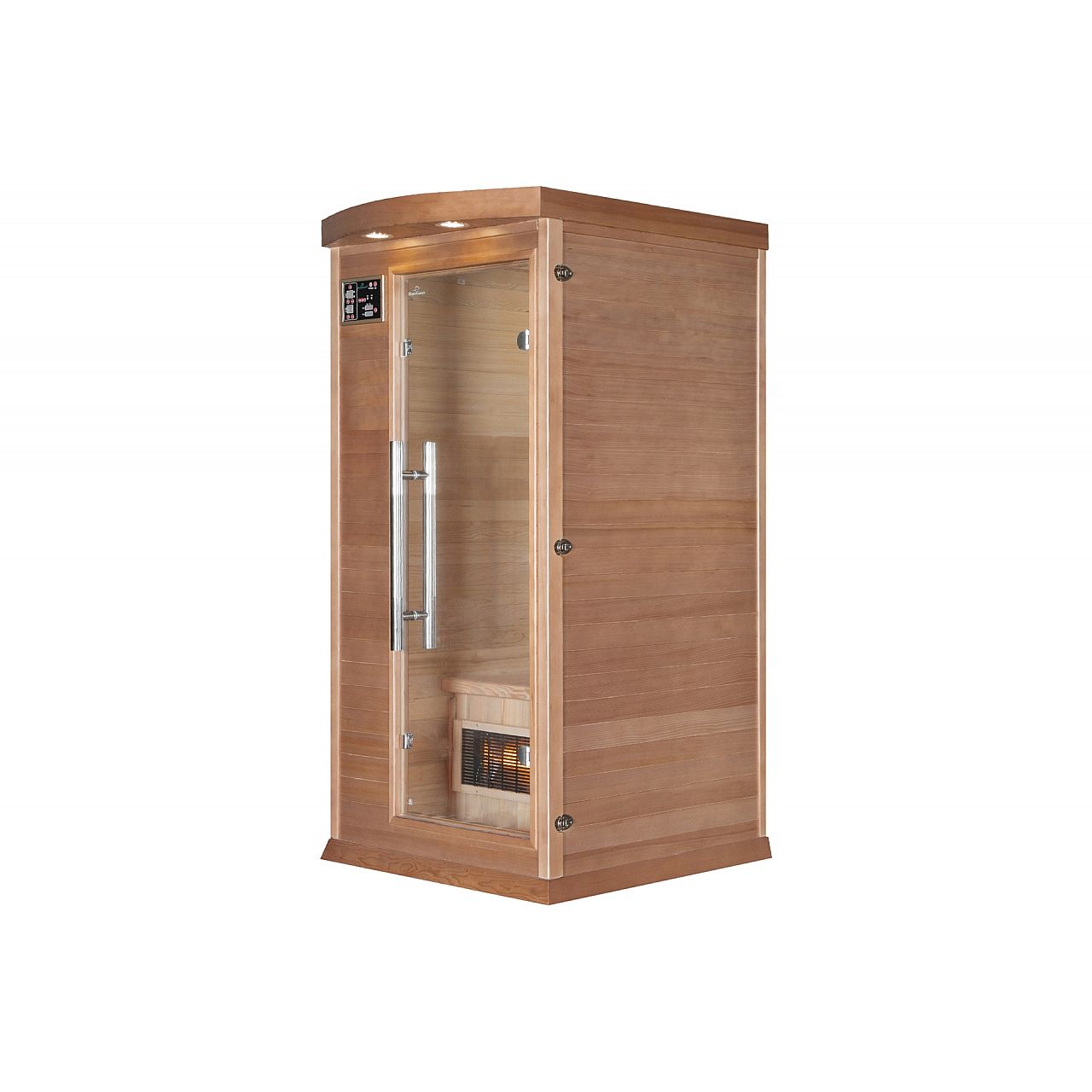 Інфрачервона сауна (інфрачервона, низькотемпературна) без пари і з низькою температурою повітря (до 60°C), де замість традиційних печей використовуються кварцові, керамічні або вугільні інфрачервоні обігрівачі. Кабіну з канадської ялиці можна встановити у ванній, спальні, вітальні або будь-якій іншій кімнаті. Для роботи достатньо звичайного джерела живлення 230В. Після ввімкнення сауна налаштована на заводі на 60 хвилин. Він має автоматичний вимикач, який запобігає випадковому залишанню сауни увімкненою на надто довгий час, що робить її безпечною у використанні. Радіатори захищені дерев'яними сітками.