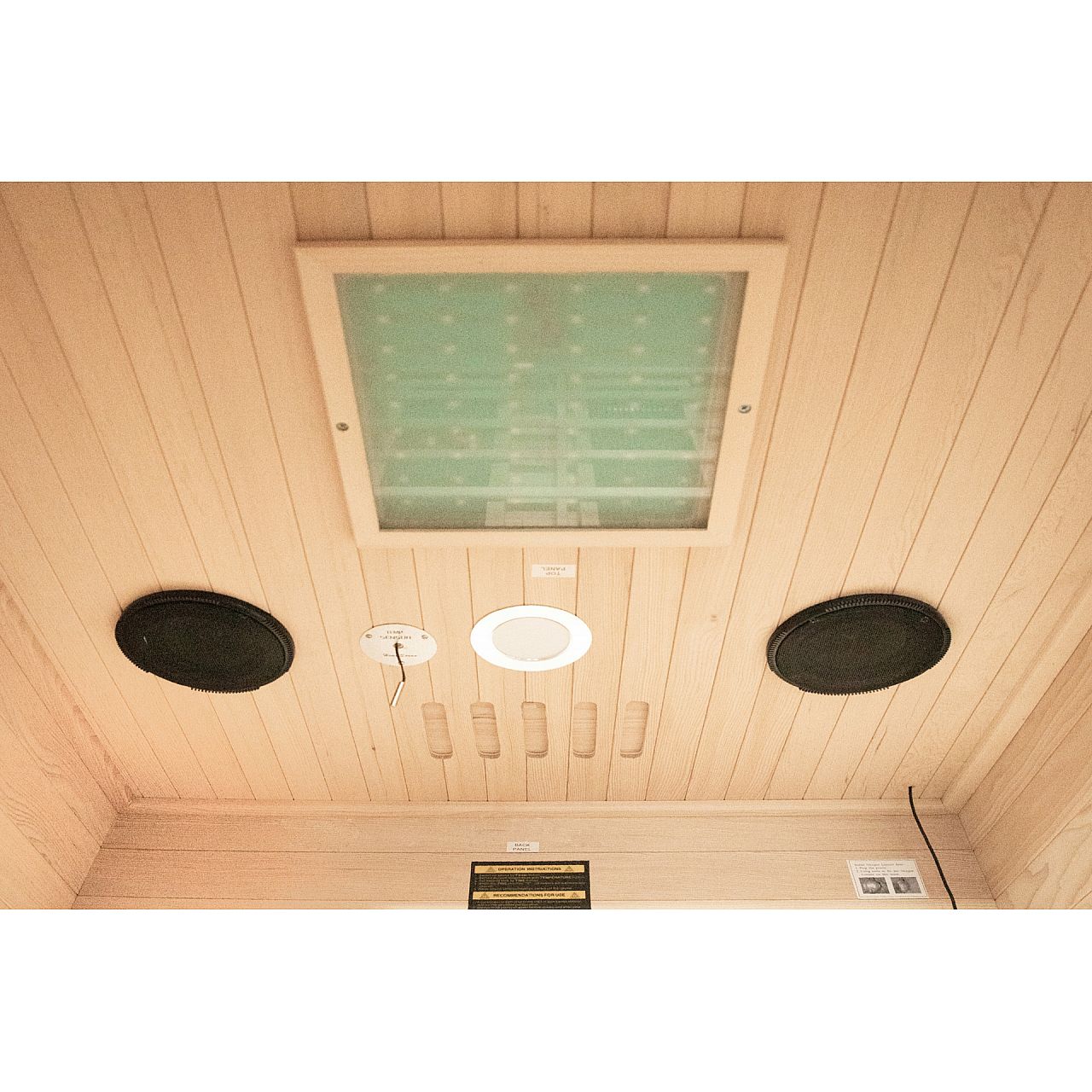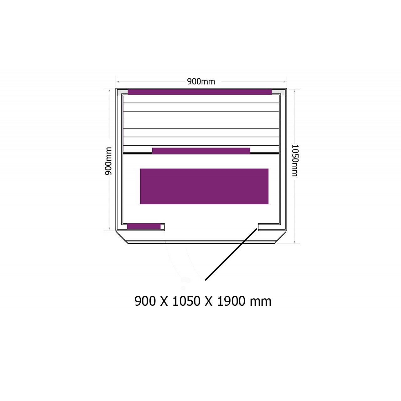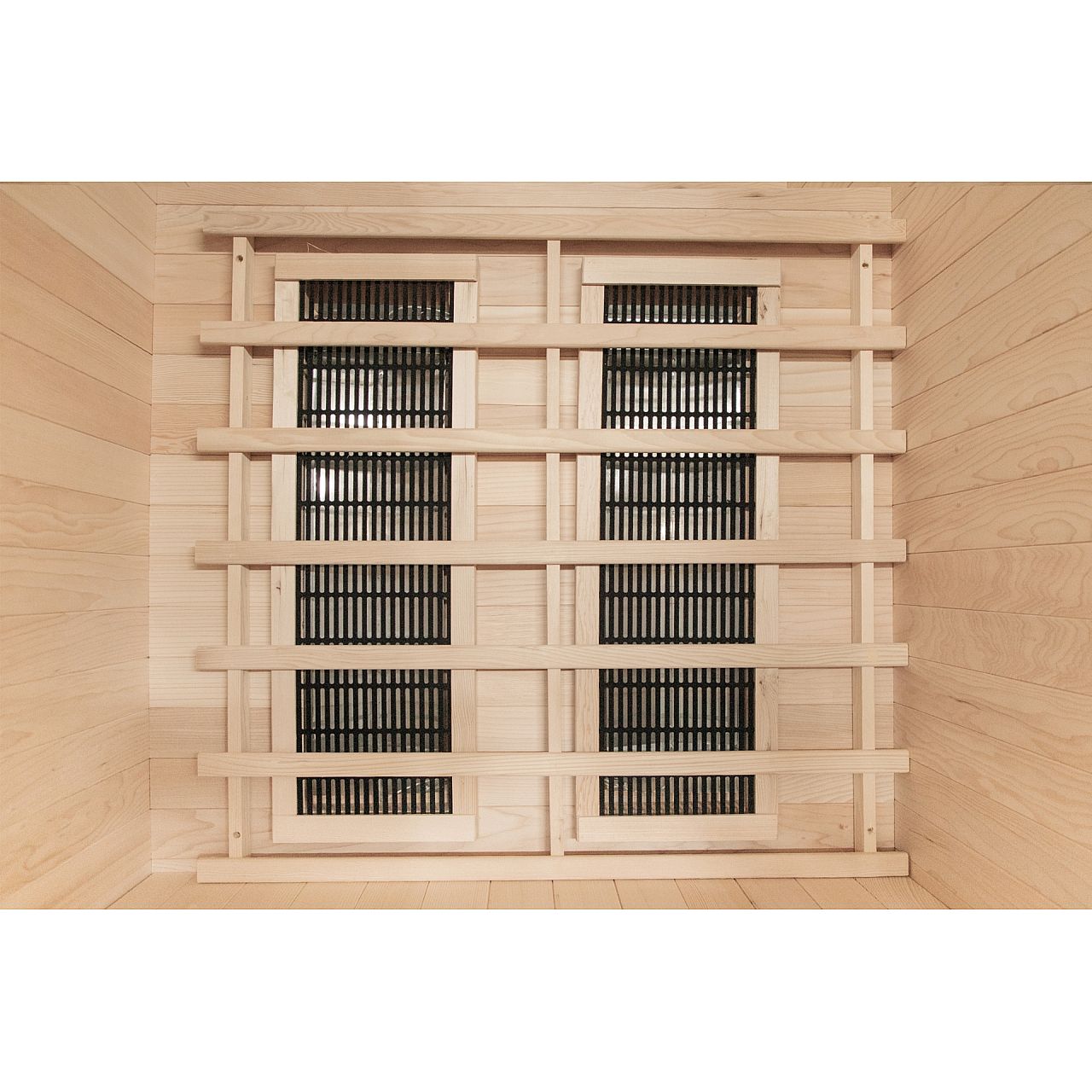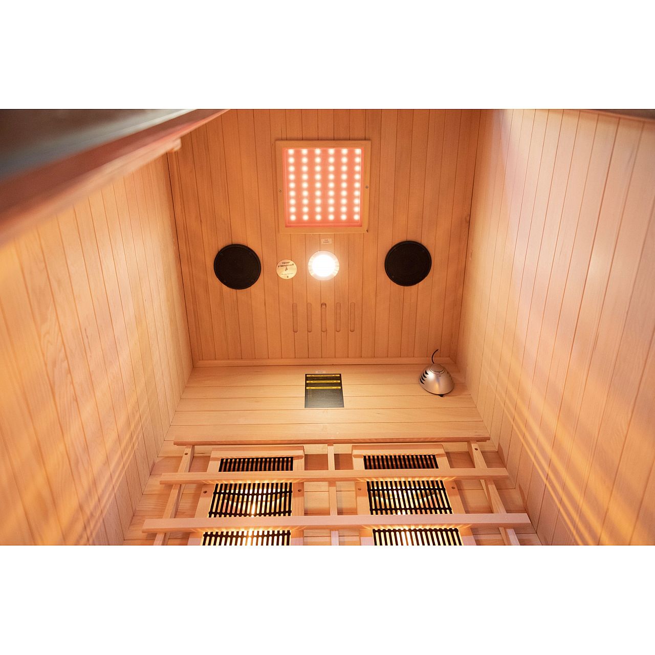 Інфрачервона сауна (інфрачервона, низькотемпературна) без пари і з низькою температурою повітря (до 60°C), де замість традиційних печей використовуються кварцові, керамічні або вугільні інфрачервоні обігрівачі. Кабіну з канадської ялиці можна встановити у ванній, спальні, вітальні або будь-якій іншій кімнаті. Для роботи достатньо звичайного джерела живлення 230В. Після ввімкнення сауна налаштована на заводі на 60 хвилин. Він має автоматичний вимикач, який запобігає випадковому залишанню сауни увімкненою на надто довгий час, що робить її безпечною у використанні. Радіатори захищені дерев'яними сітками.