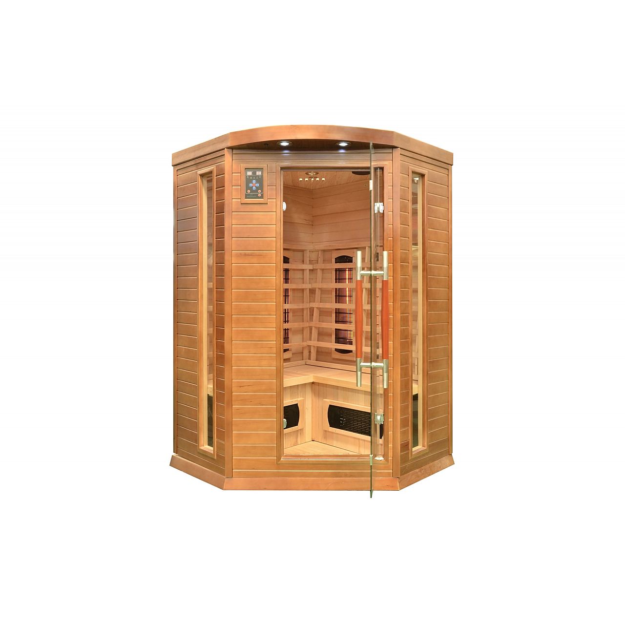 Інфрачервона сауна (інфрачервона, низькотемпературна) без пари і з низькою температурою повітря (до 60°C), де замість традиційних печей використовуються кварцові, керамічні або вугільні інфрачервоні обігрівачі. Кабіну з канадської ялиці можна встановити у ванній, спальні, вітальні або будь-якій іншій кімнаті. Для роботи достатньо звичайного джерела живлення 230В. Після ввімкнення сауна налаштована на заводі на 60 хвилин. Він має автоматичний вимикач, який запобігає випадковому залишанню сауни увімкненою на надто довгий час, що робить її безпечною у використанні. Радіатори захищені дерев'яними сітками.
