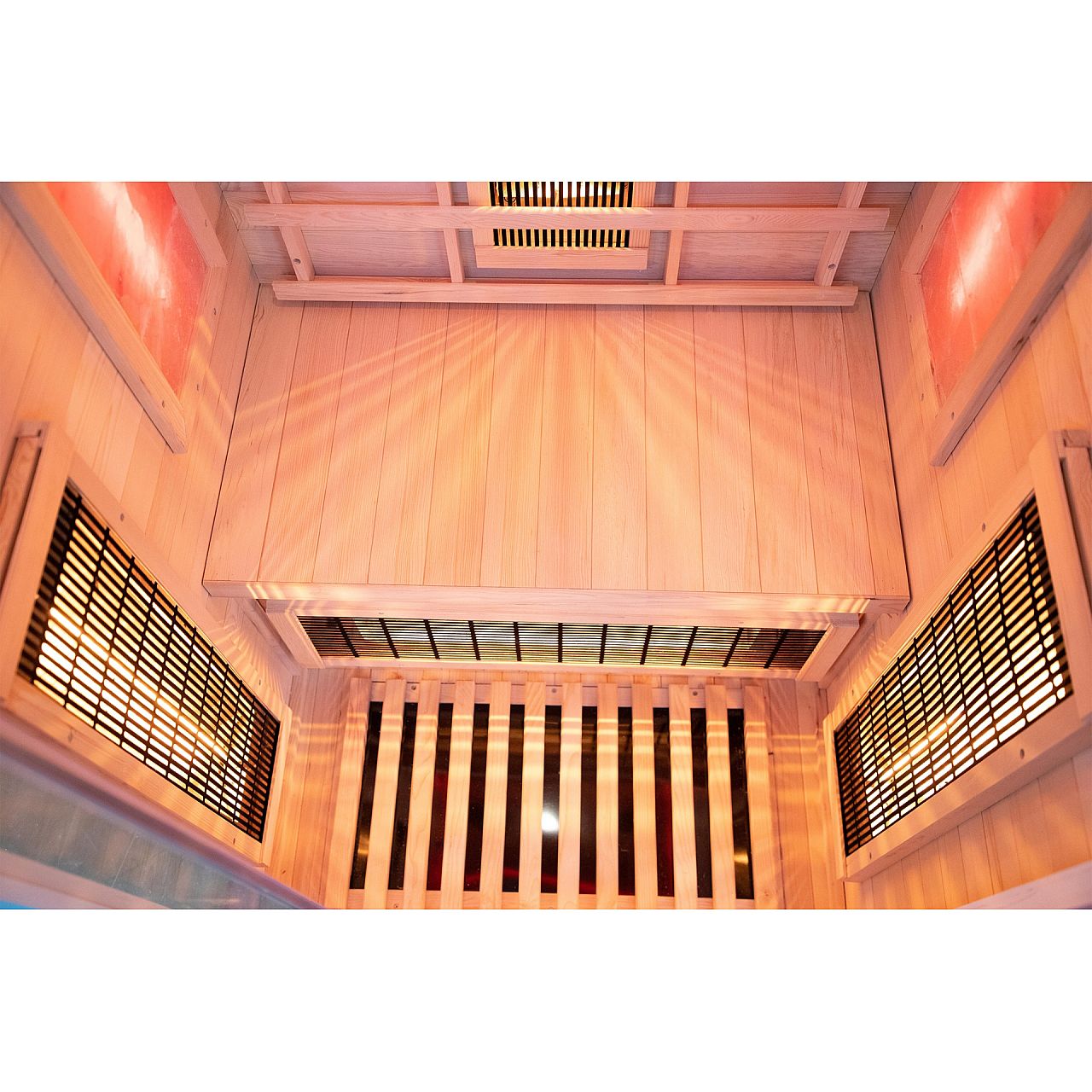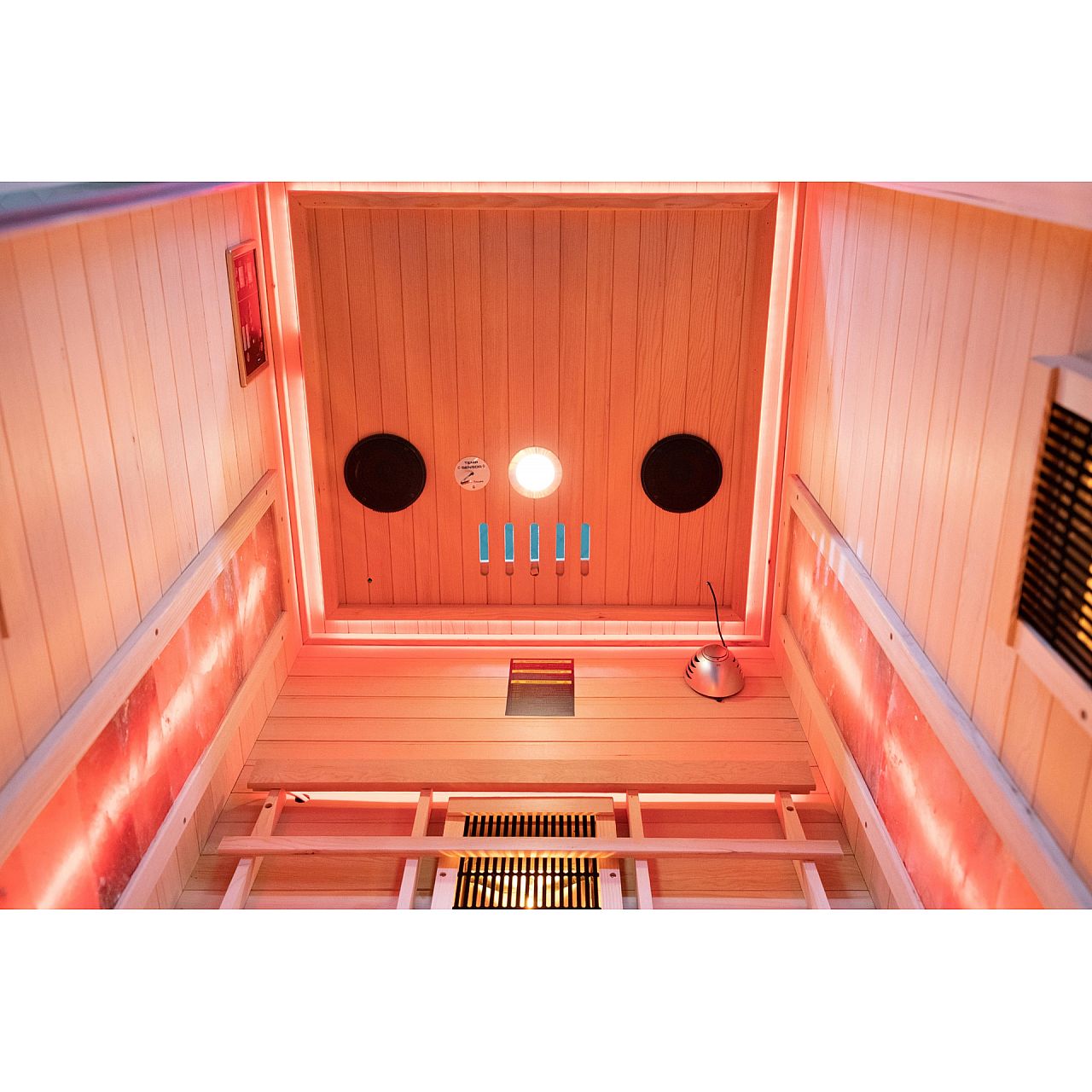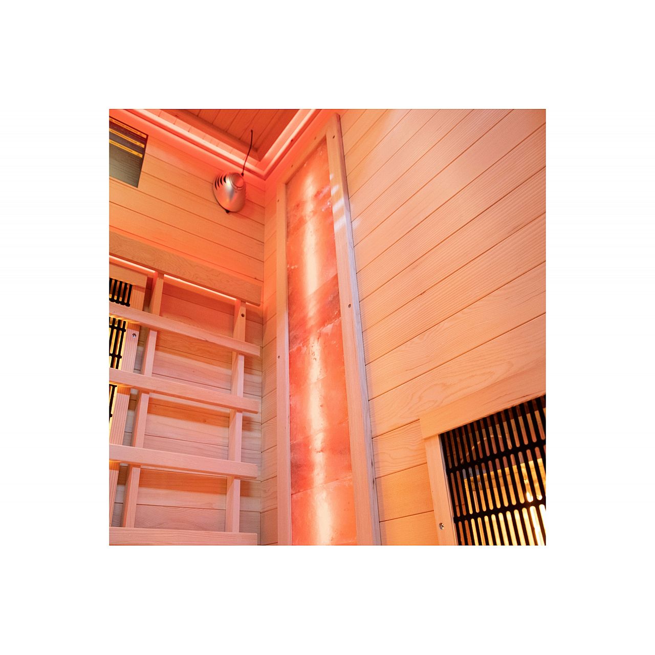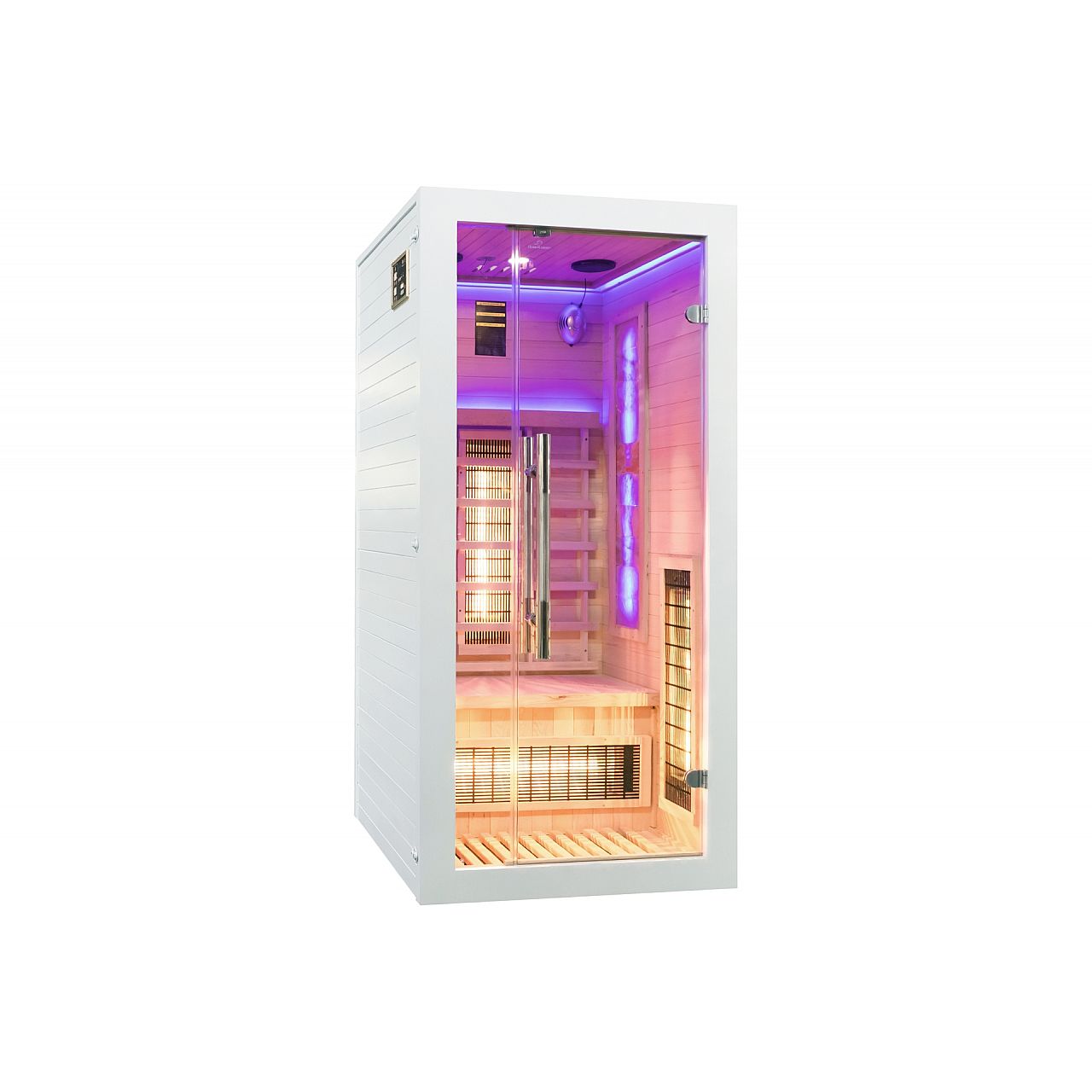 Інфрачервона сауна (інфрачервона, низькотемпературна) без пари та з низькою температурою повітря (до 60°C), де замість традиційних печей використовуються кварцові, керамічні або карбонові інфрачервоні обігрівачі. Дерев'яну кабіну з канадської ялиці можна встановити у ванній кімнаті, спальні, вітальні або будь-якій іншій кімнаті. Для роботи достатньо стандартного джерела живлення 230 В. Заводські налаштування сауни встановлені на 60 хвилин після ввімкнення. Він має автоматичний вимикач, який запобігає випадковому залишенню сауни увімкненою на занадто тривалий час, що робить її безпечною у використанні. Радіатори захищені дерев'яними решітками.