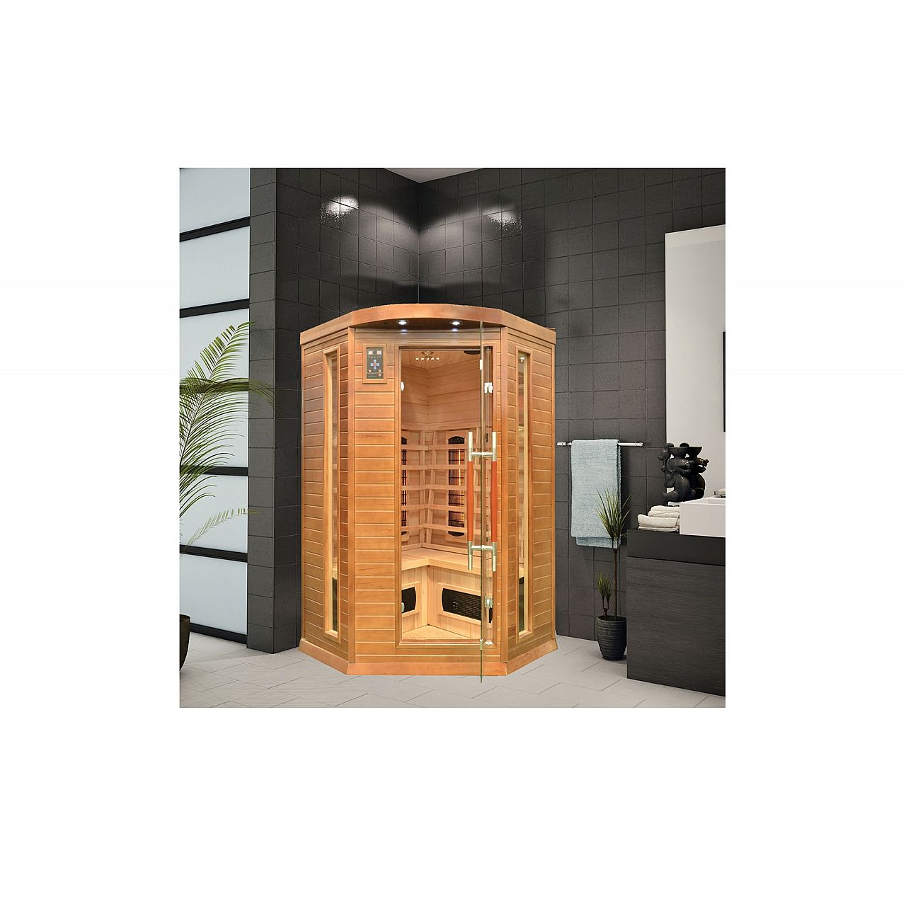 Інфрачервона сауна (інфрачервона, низькотемпературна) без пари і з низькою температурою повітря (до 60°C), де замість традиційних печей використовуються кварцові або вугільні інфрачервоні обігрівачі. Кабіну з канадської ялиці можна встановити у ванній, спальні, вітальні або будь-якій іншій кімнаті. Для роботи достатньо звичайного джерела живлення 230В. Після ввімкнення сауна налаштована на заводі на 60 хвилин. Він має автоматичний вимикач, який запобігає випадковому залишанню сауни увімкненою на надто довгий час, що робить її безпечною у використанні. Радіатори захищені дерев'яними сітками.