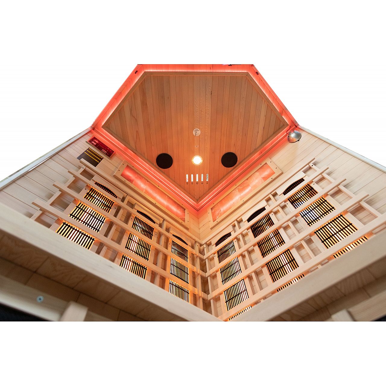 Обладнання:radio multimedialne z USB/BT, dwa stereofoniczne głośniki zamocowane w suficie sauny, 2 panele sterujące: zewnętrzny i wewnętrzny (umożliwia nam zmianę parametrów pracy sauny bez konieczności wychodzenia z sauny podczas relaksu), jonizator powietrza usuwający bakterie wywołujące nieprzyjemny zapach oraz odświeżający powietrze, dzięki jonizatorowi powietrze w saunie będzie zawsze czyste i zdrowe, koloroterapia umożliwia ustawienie relaksacyjnej częstotliwości kolorowych świateł, oświetlenie wewnętrzne, drzwi z hartowanego szkła, panele solne | |