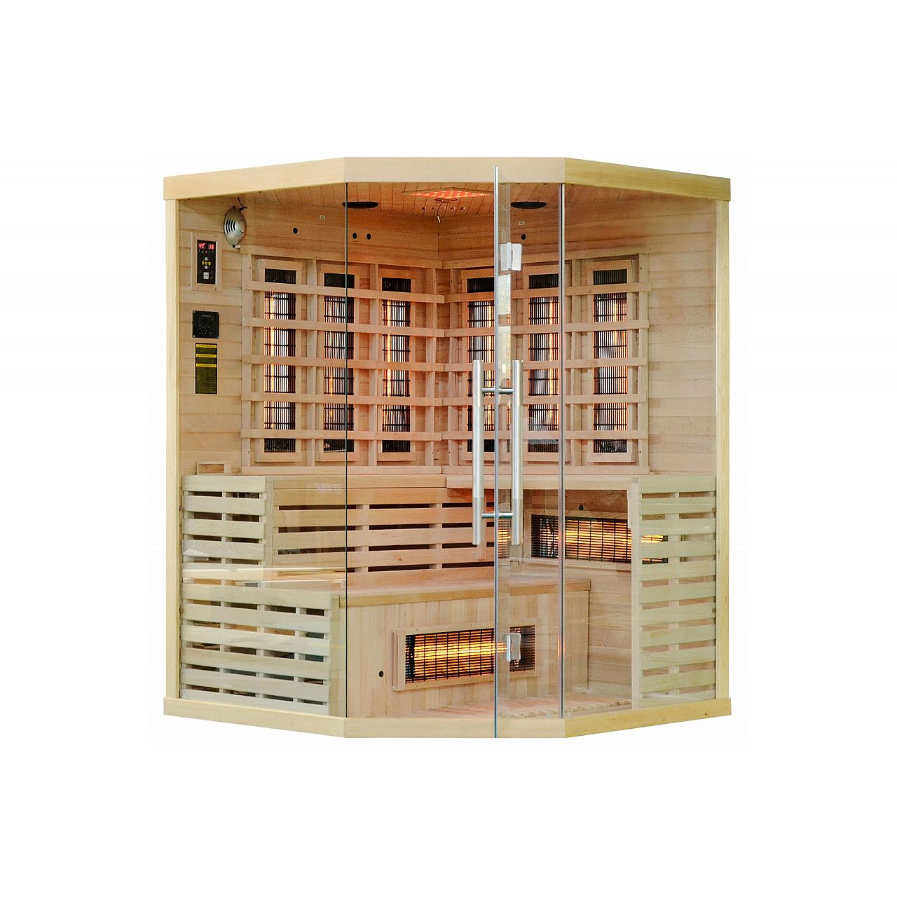 Інфрачервона сауна (інфрачервона, низькотемпературна) без пари і з низькою температурою повітря (до 60°C), де замість традиційних печей використовуються кварцові, керамічні або вугільні інфрачервоні обігрівачі. Кабіну з канадської ялиці можна встановити у ванній, спальні, вітальні або будь-якій іншій кімнаті. Для роботи достатньо звичайного джерела живлення 230В. Після ввімкнення сауна налаштована на заводі на 60 хвилин. Він має автоматичний вимикач, який запобігає випадковому залишанню сауни увімкненою на надто тривалий час, що робить її безпечною у використанні. Радіатори захищені дерев'яними сітками.