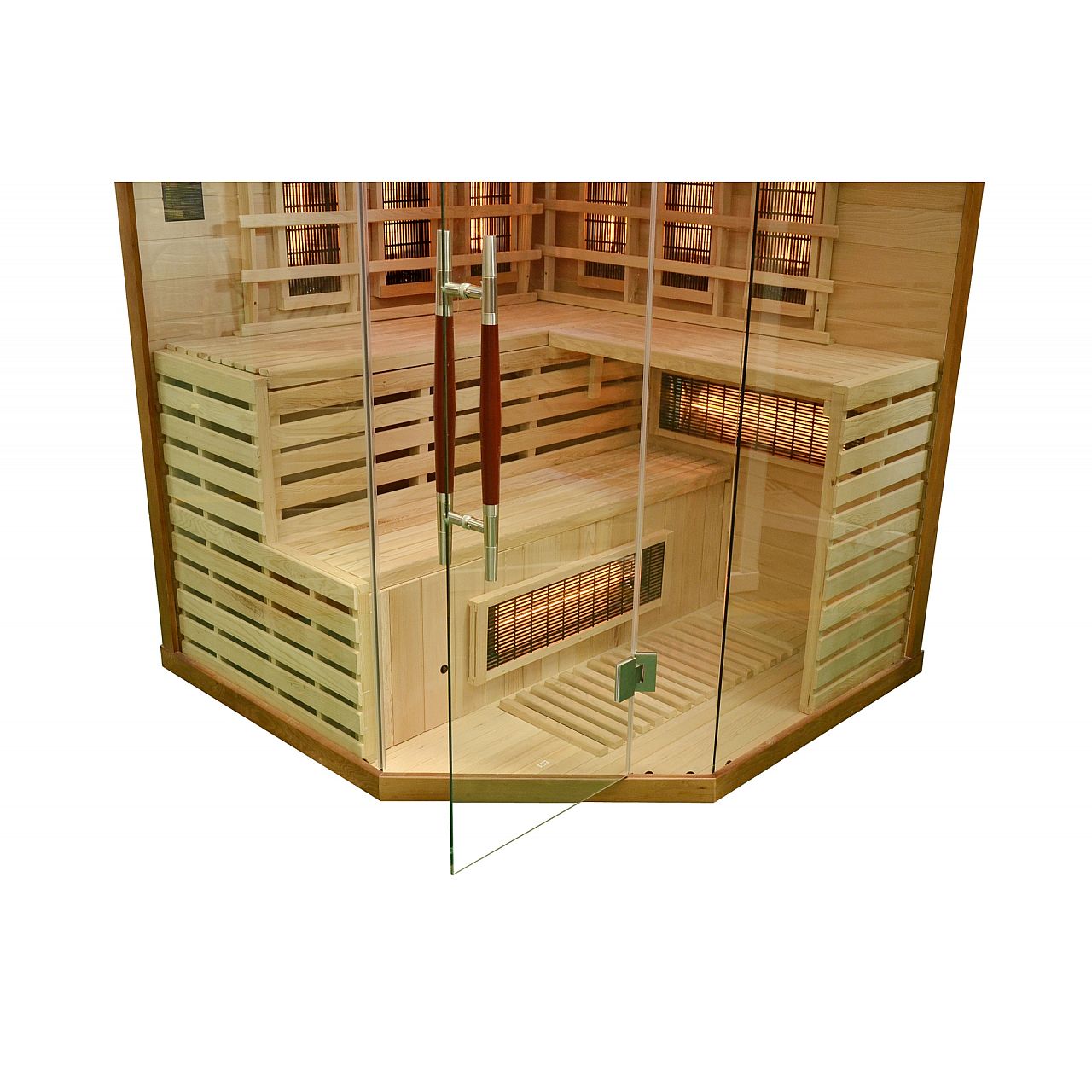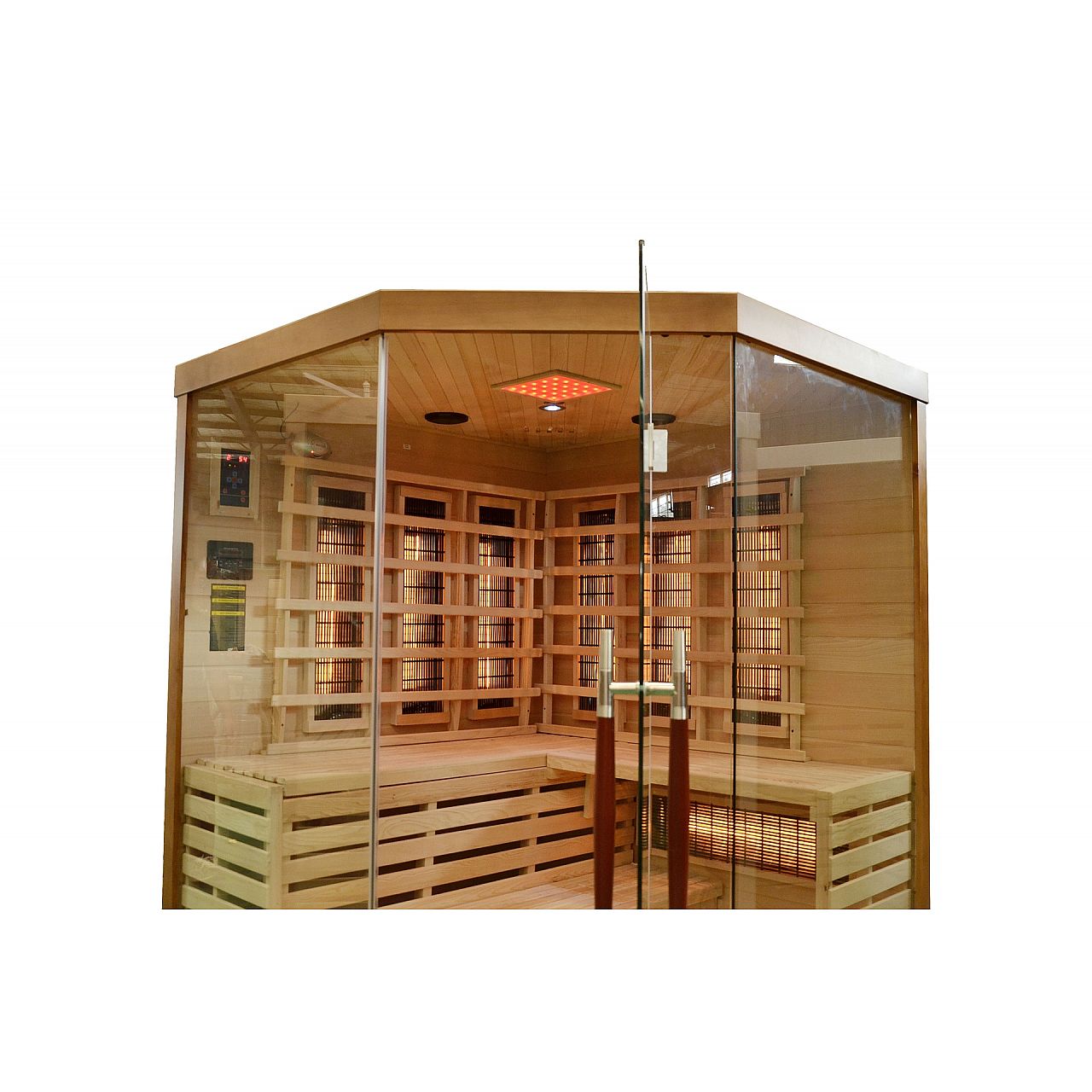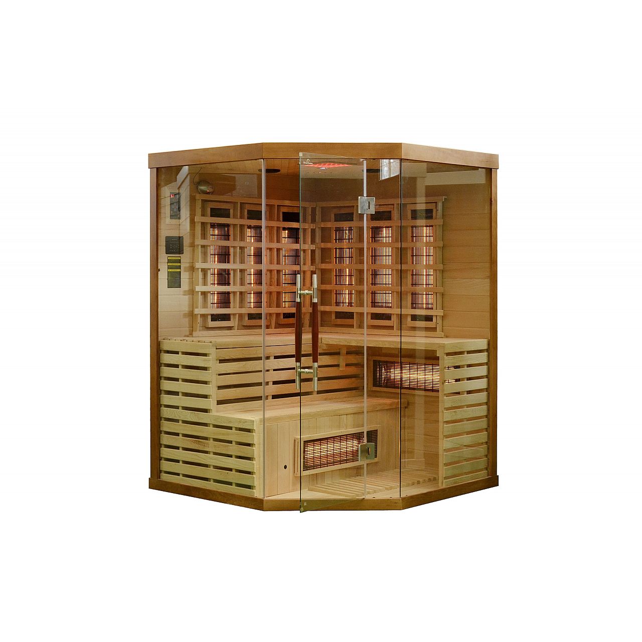 Інфрачервона сауна (інфрачервона, низькотемпературна) без пари і з низькою температурою повітря (до 60°C), де замість традиційних печей використовуються кварцові, керамічні або вугільні інфрачервоні обігрівачі. Кабіну з канадської ялиці можна встановити у ванній, спальні, вітальні або будь-якій іншій кімнаті. Для роботи достатньо звичайного джерела живлення 230В. Після ввімкнення сауна налаштована на заводі на 60 хвилин. Він має автоматичний вимикач, який запобігає випадковому залишанню сауни увімкненою на надто довгий час, що робить її безпечною у використанні. Радіатори захищені дерев'яними сітками.