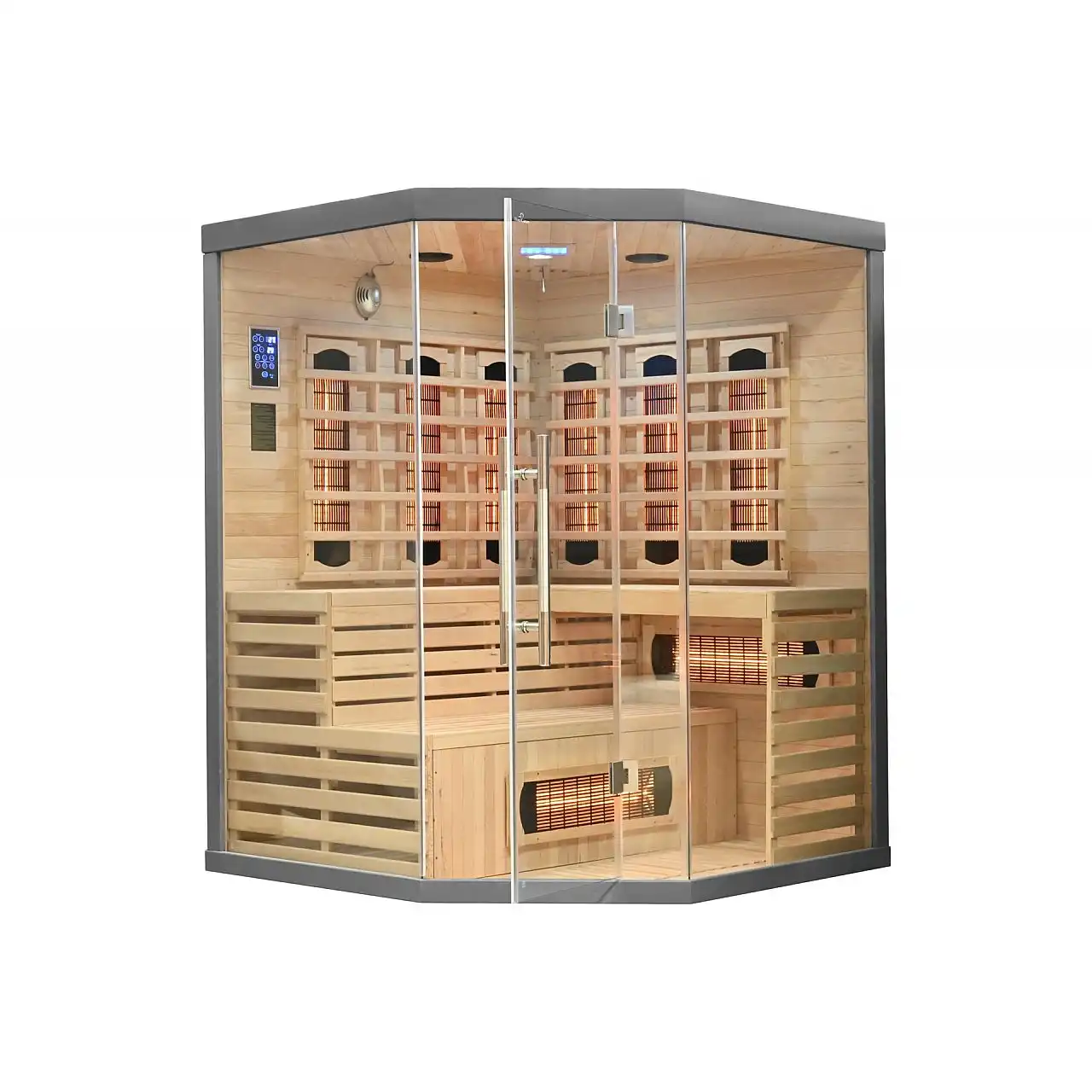 | Обладнання:• мультимедійне радіо з USB/BT, оснащене кабелем антени • два стереодинаміки, встановлені в стелі сауни • 2 панелі управління: зовнішня та внутрішня (дозволяє змінювати параметри роботи сауни, не виходячи з сауни під час відпочинку) • іонізатор повітря видаляючи бактерії, які викликають неприємні запахи, та освіжаючи повітря, завдяки іонізатору повітря в сауні завжди буде чистим і здоровим • кольоротерапія дозволяє встановити розслаблюючу частоту кольорового світла • внутрішнє освітлення • двері із загартованого скла | |