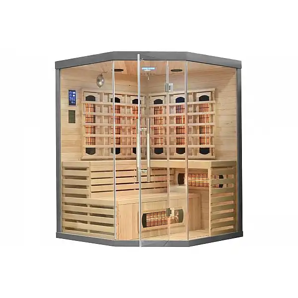 Інфрачервона сауна (інфрачервона, низькотемпературна) без пари і з низькою температурою повітря (до 60°C), де замість традиційних печей використовуються кварцові, керамічні або вугільні інфрачервоні обігрівачі. Кабіну з канадської ялиці можна встановити у ванній, спальні, вітальні або будь-якій іншій кімнаті. Для роботи достатньо звичайного джерела живлення 230В. Після ввімкнення сауна налаштована на заводі на 60 хвилин. Він має автоматичний вимикач, який запобігає випадковому залишанню сауни увімкненою на надто довгий час, що робить її безпечною у використанні. Радіатори захищені дерев'яними сітками.