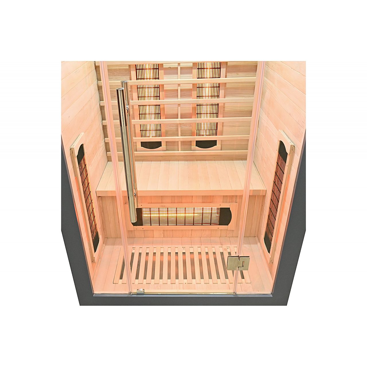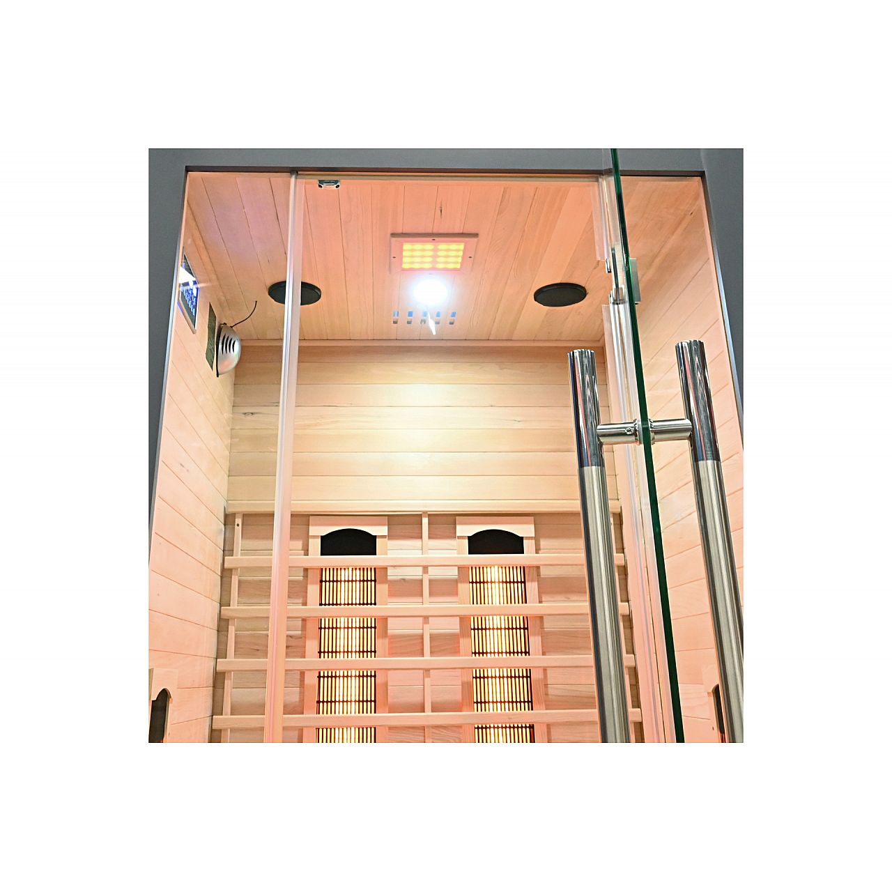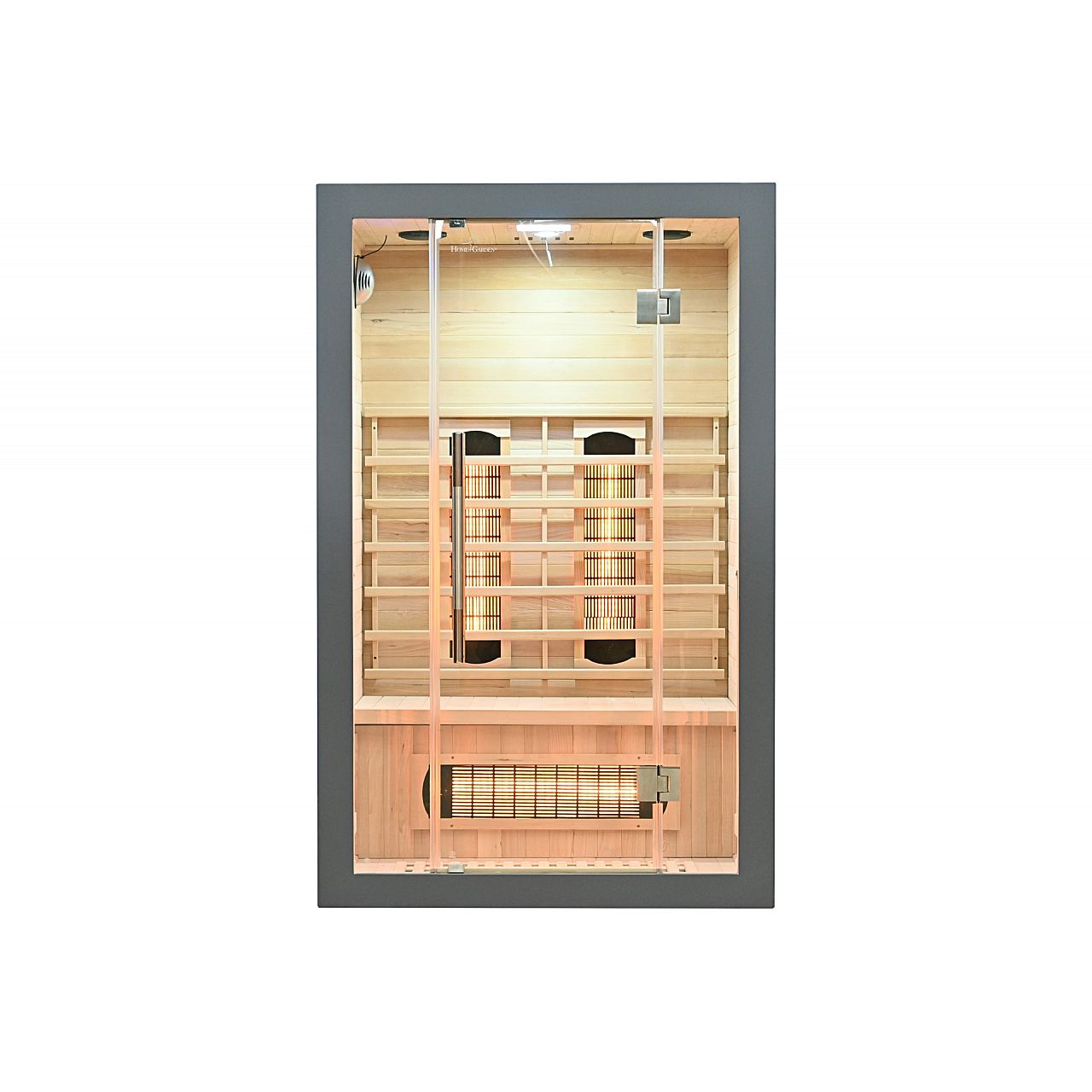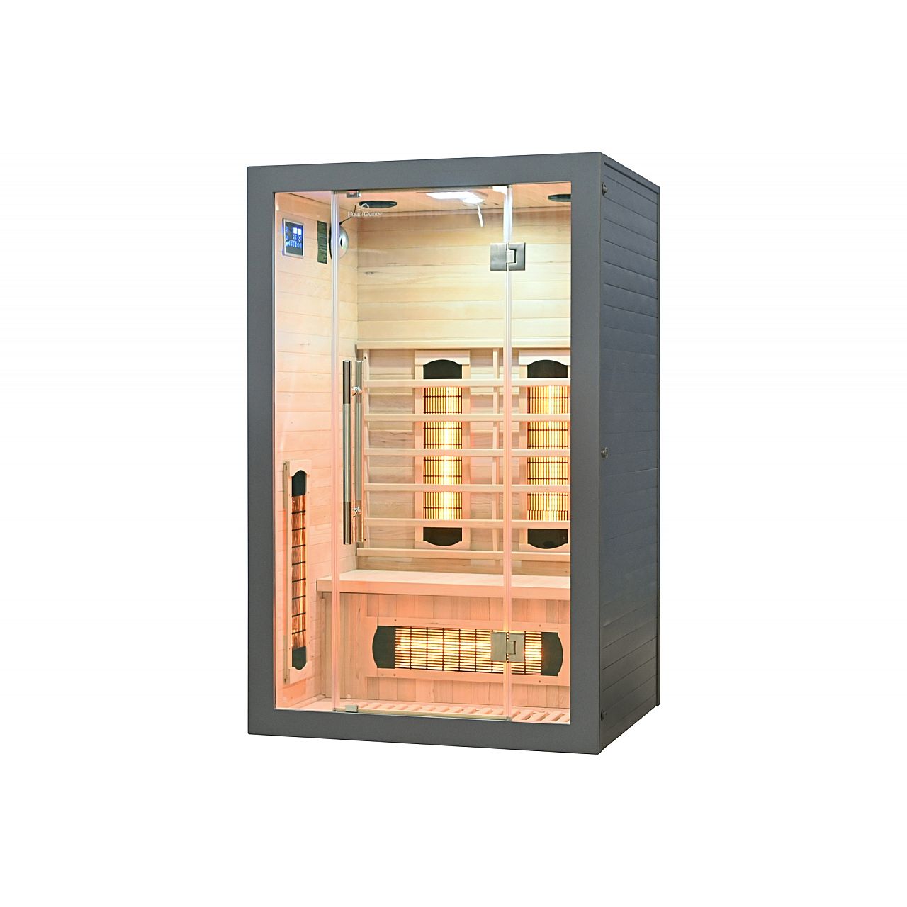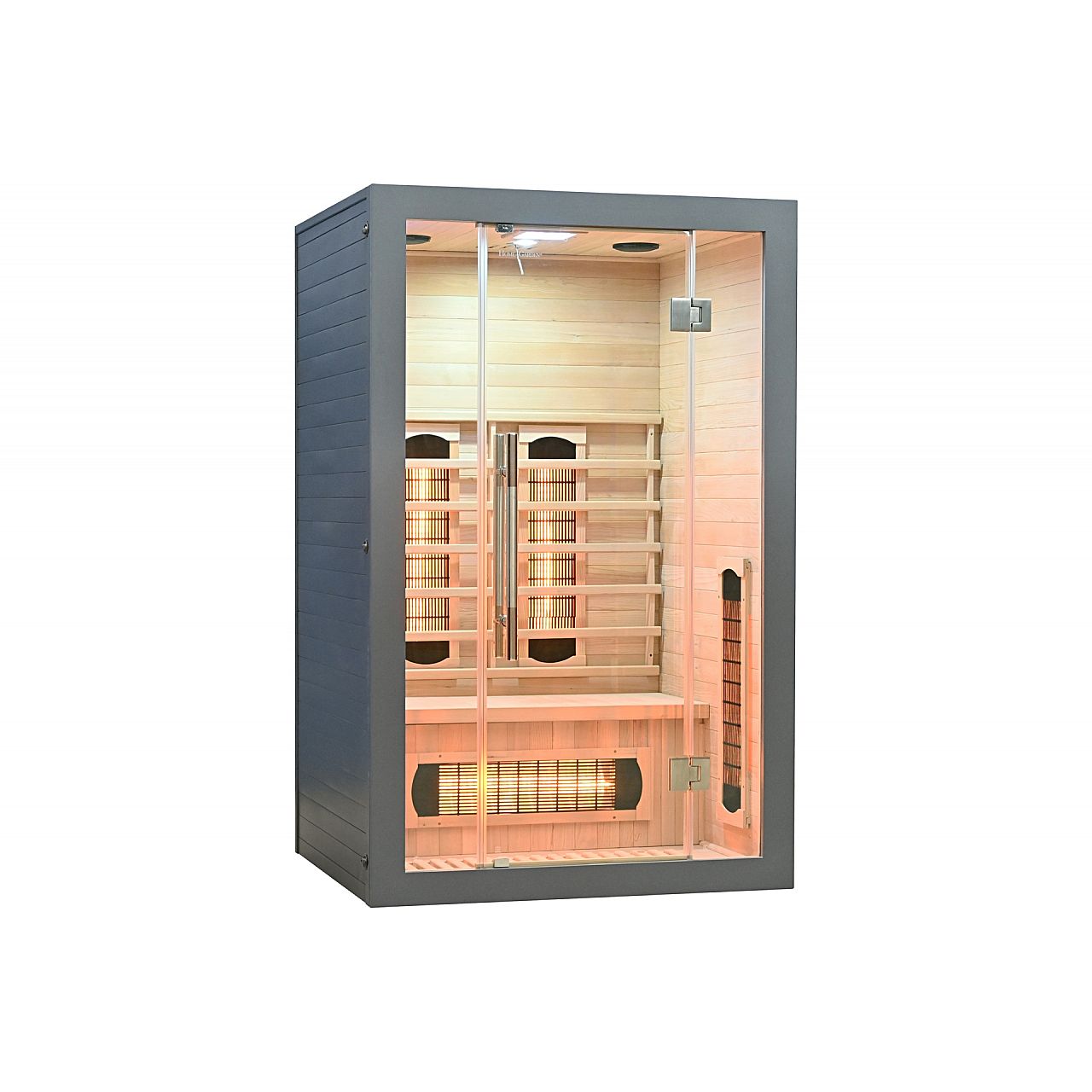 Інфрачервона сауна (інфрачервона, низькотемпературна) без пари і з низькою температурою повітря (до 60°C), де замість традиційних печей використовуються кварцові, керамічні або вугільні інфрачервоні обігрівачі. Кабіну з канадської ялиці можна встановити у ванній, спальні, вітальні або будь-якій іншій кімнаті. Для роботи достатньо звичайного джерела живлення 230В. Сауна має автоматичний вимикач, який запобігає випадковому залишанню увімкненою на надто тривалий час, що робить її безпечною у використанні. Радіатори захищені дерев'яними сітками.
