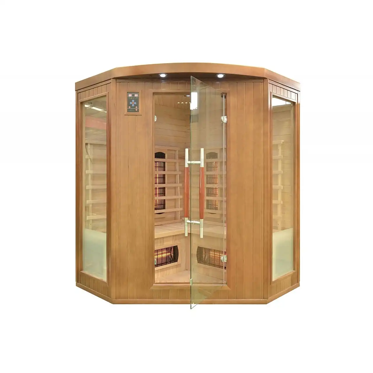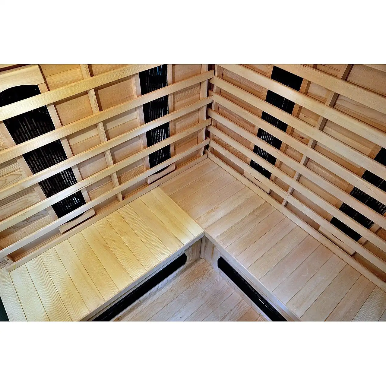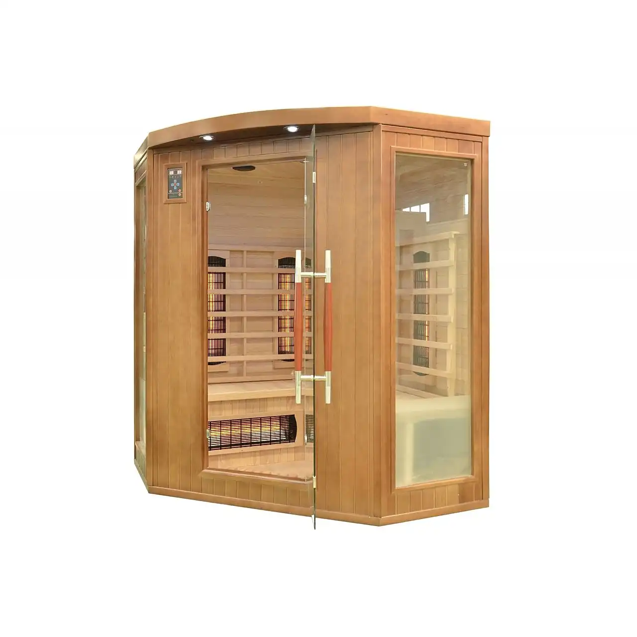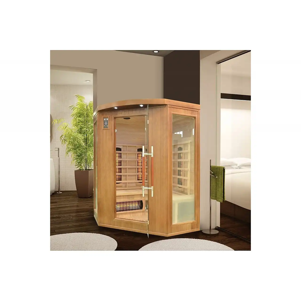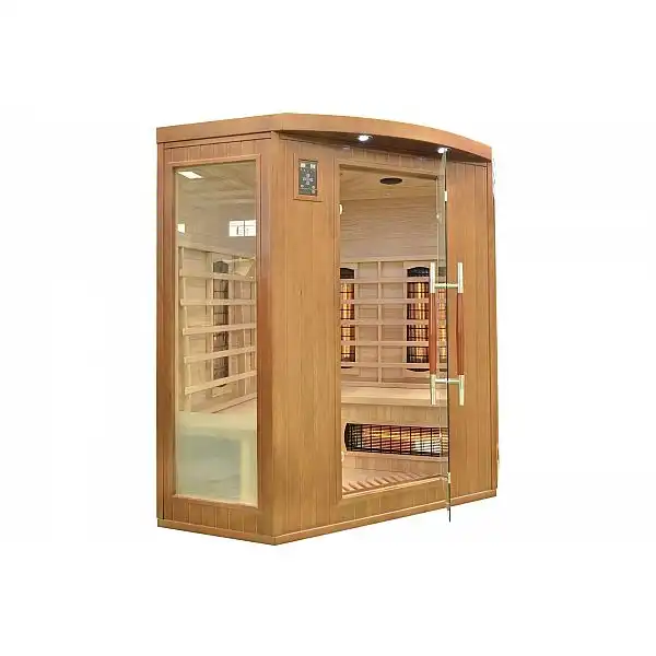 Інфрачервона сауна (інфрачервона, низькотемпературна) без пари і з низькою температурою повітря (до 60°C), де замість традиційних печей використовуються кварцові, керамічні або вугільні інфрачервоні обігрівачі. Кабіну з канадської ялиці можна встановити у ванній, спальні, вітальні або будь-якій іншій кімнаті. Для роботи достатньо звичайного джерела живлення 230В. Після ввімкнення сауна налаштована на заводі на 60 хвилин. Він має автоматичний вимикач, який запобігає випадковому залишанню сауни увімкненою на надто довгий час, що робить її безпечною у використанні. Радіатори захищені дерев'яними сітками.