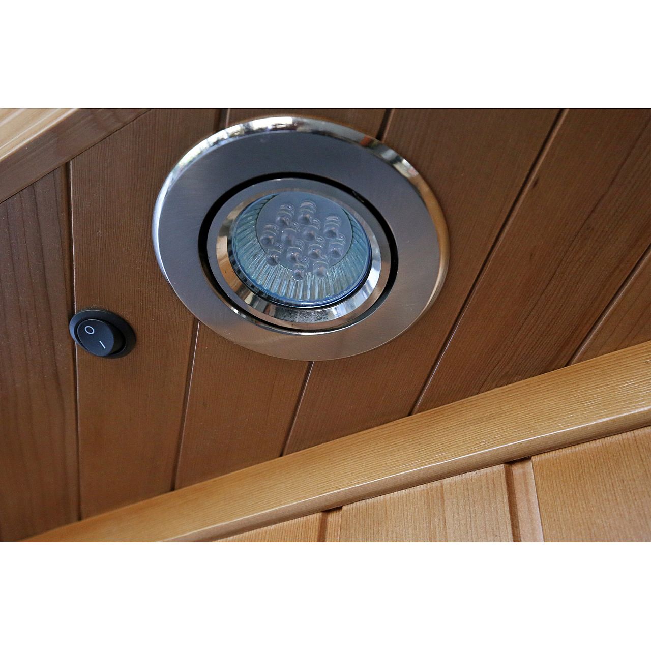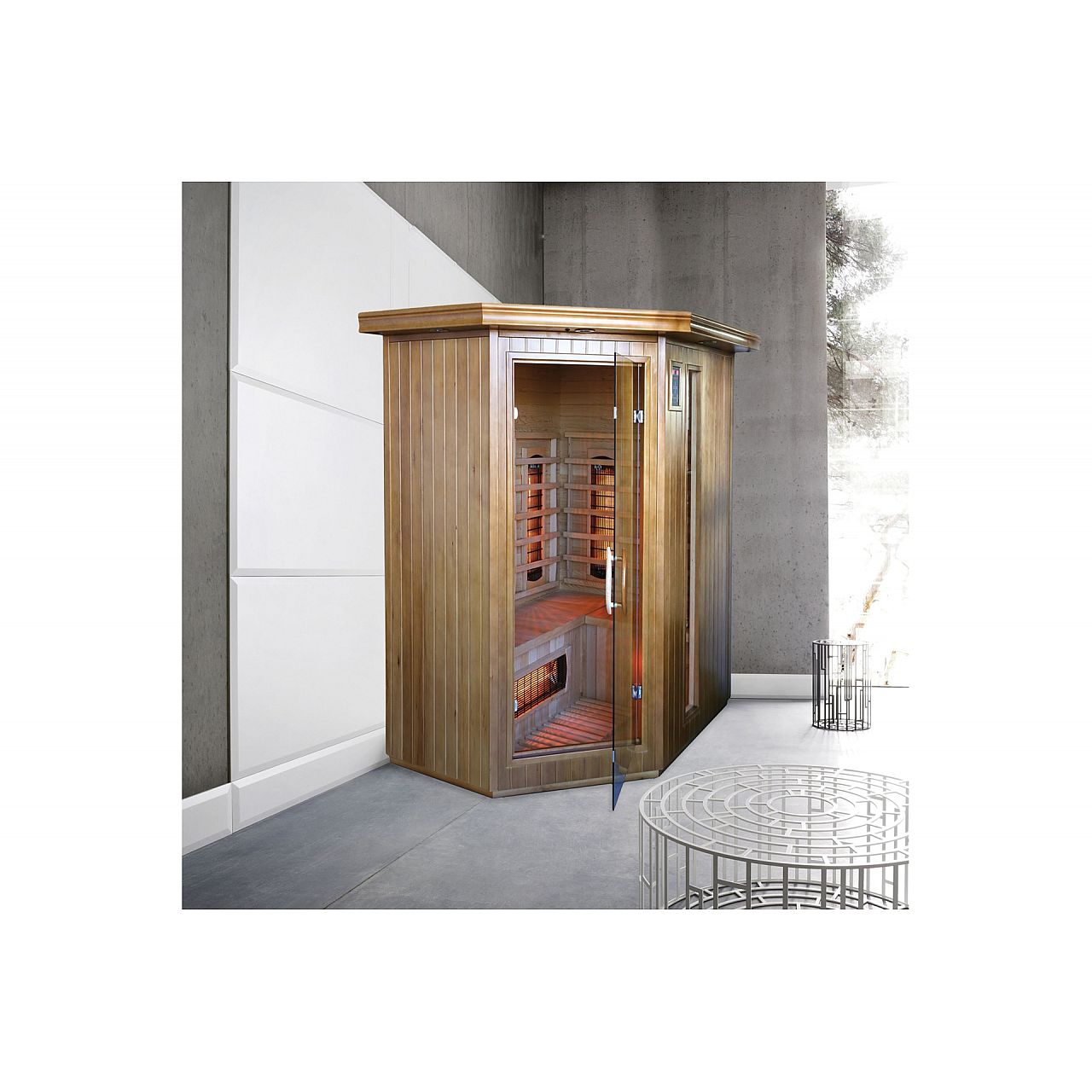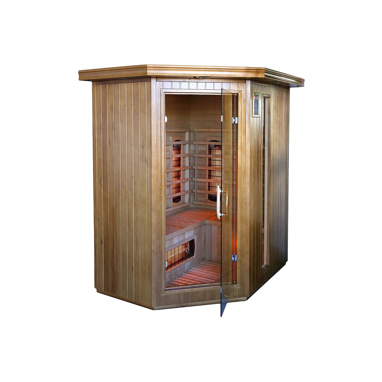 Інфрачервона сауна (інфрачервона, низькотемпературна) без пари і з низькою температурою повітря (до 60°C), де замість традиційних печей використовуються кварцові, керамічні або вугільні інфрачервоні обігрівачі. Кабіну з канадської ялиці можна встановити у ванній, спальні, вітальні або будь-якій іншій кімнаті. Для роботи достатньо звичайного джерела живлення 230В. Після ввімкнення сауна налаштована на заводі на 60 хвилин. Він має автоматичний вимикач, який запобігає випадковому залишанню сауни увімкненою на надто довгий час, що робить її безпечною у використанні. Радіатори захищені дерев'яними сітками.