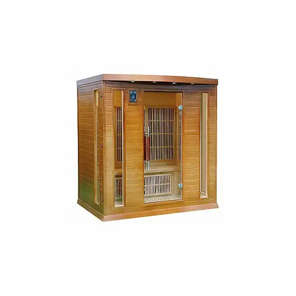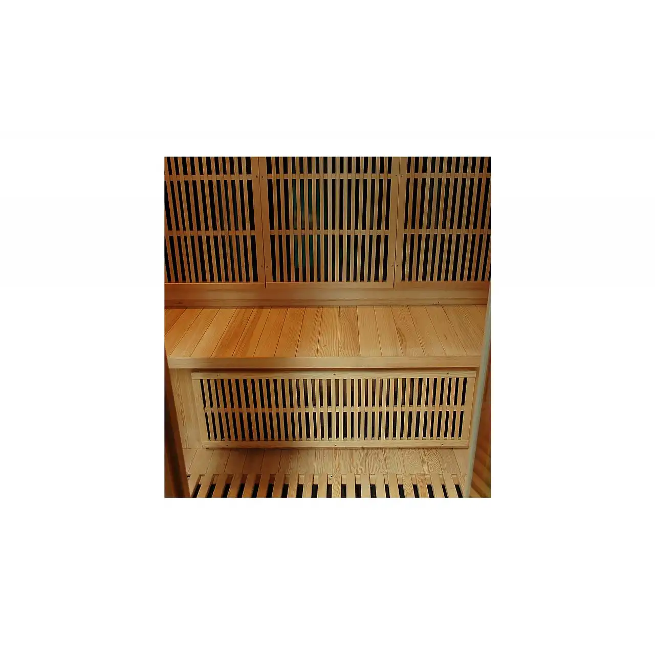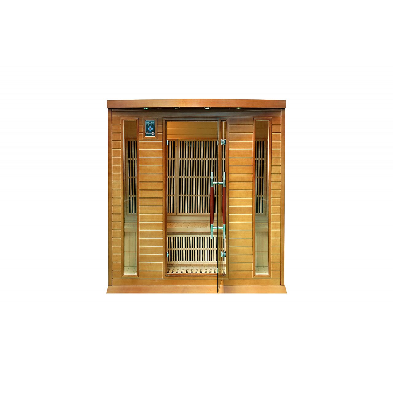 Інфрачервона сауна (інфрачервона, низькотемпературна) без пари і з низькою температурою повітря (до 60°C), де замість традиційних печей використовуються кварцові, керамічні або вугільні інфрачервоні обігрівачі. Кабіну з канадської ялиці можна встановити у ванній, спальні, вітальні або будь-якій іншій кімнаті. Для роботи достатньо звичайного джерела живлення 230В. Після ввімкнення сауна налаштована на заводі на 60 хвилин. Він має автоматичний вимикач, який запобігає випадковому залишанню сауни увімкненою на надто довгий час, що робить її безпечною у використанні. Радіатори захищені дерев'яними сітками.