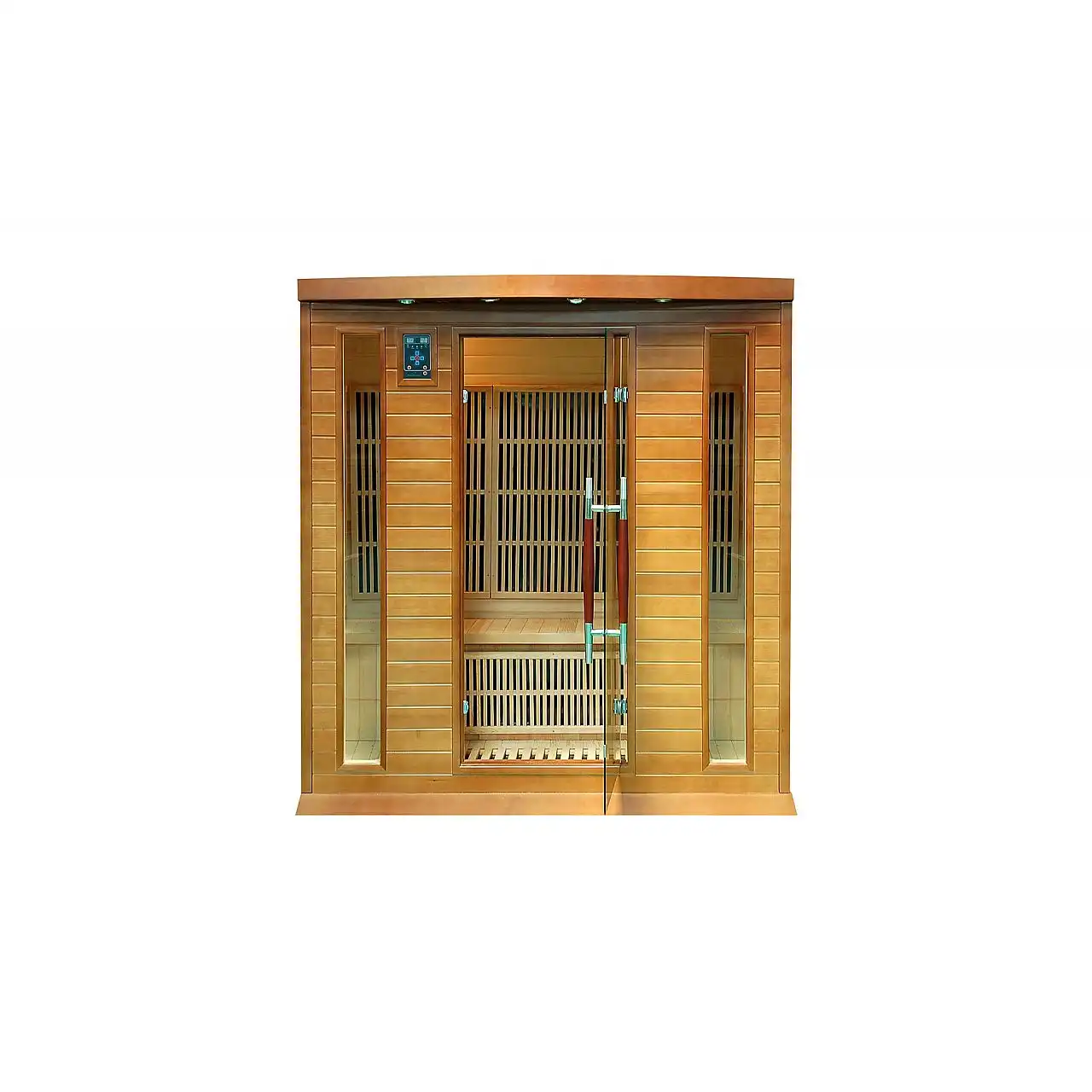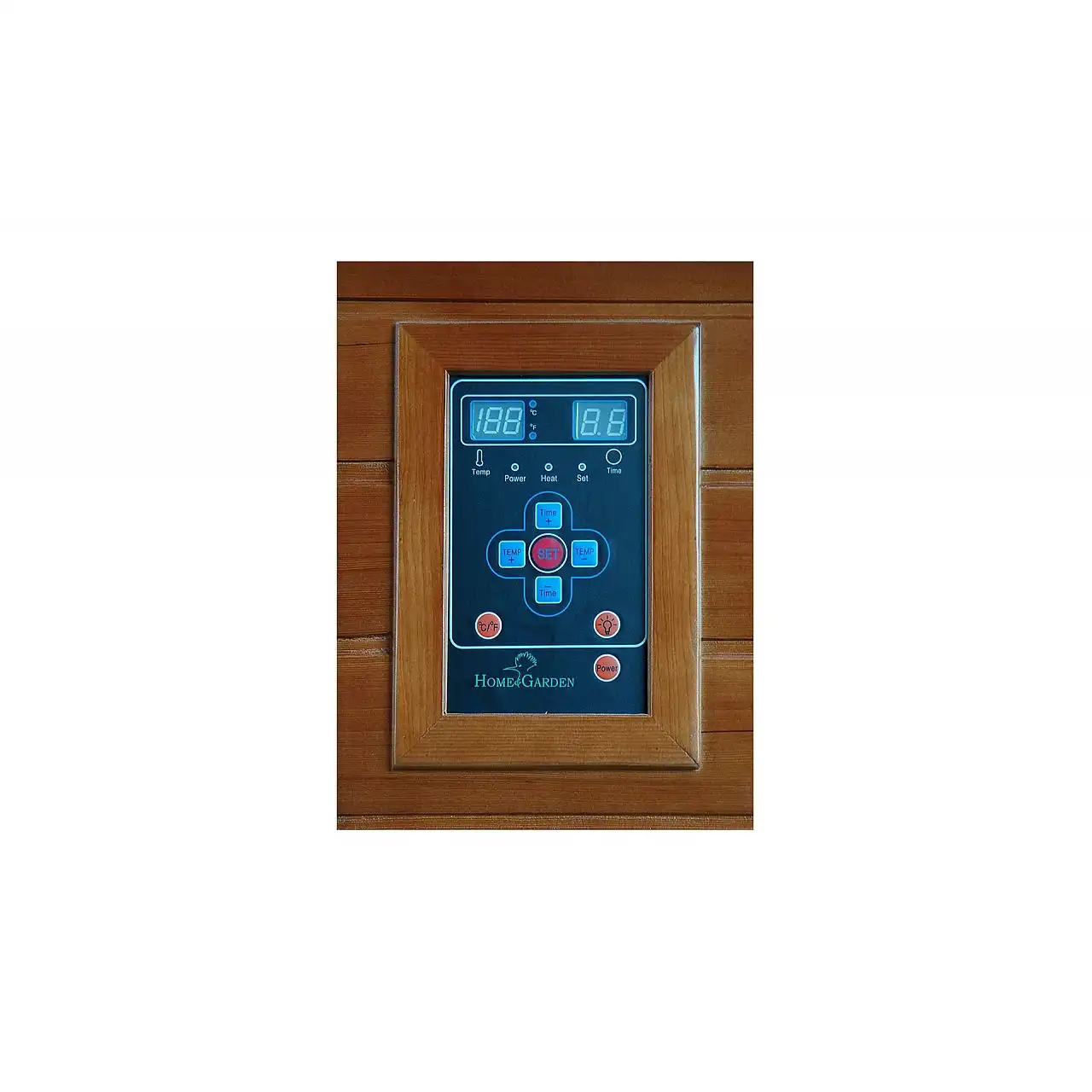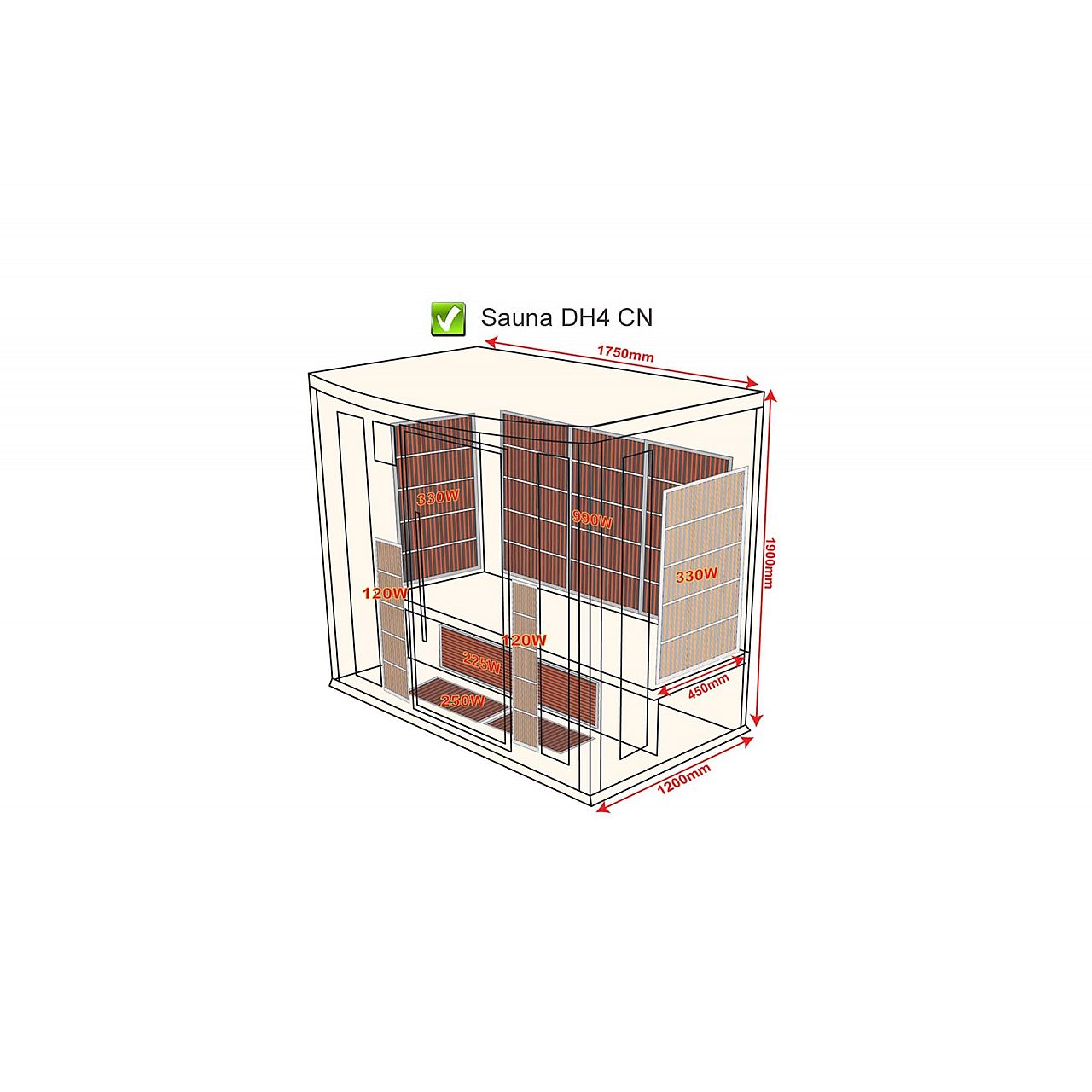 Інфрачервона сауна (інфрачервона, низькотемпературна) без пари і з низькою температурою повітря (до 60°C), де замість традиційних печей використовуються кварцові, керамічні або вугільні інфрачервоні обігрівачі. Кабіну з канадської ялиці можна встановити у ванній, спальні, вітальні або будь-якій іншій кімнаті. Для роботи достатньо звичайного джерела живлення 230В. Після ввімкнення сауна налаштована на заводі на 60 хвилин. Він має автоматичний вимикач, який запобігає випадковому залишанню сауни увімкненою на надто довгий час, що робить її безпечною у використанні. Радіатори захищені дерев'яними сітками.