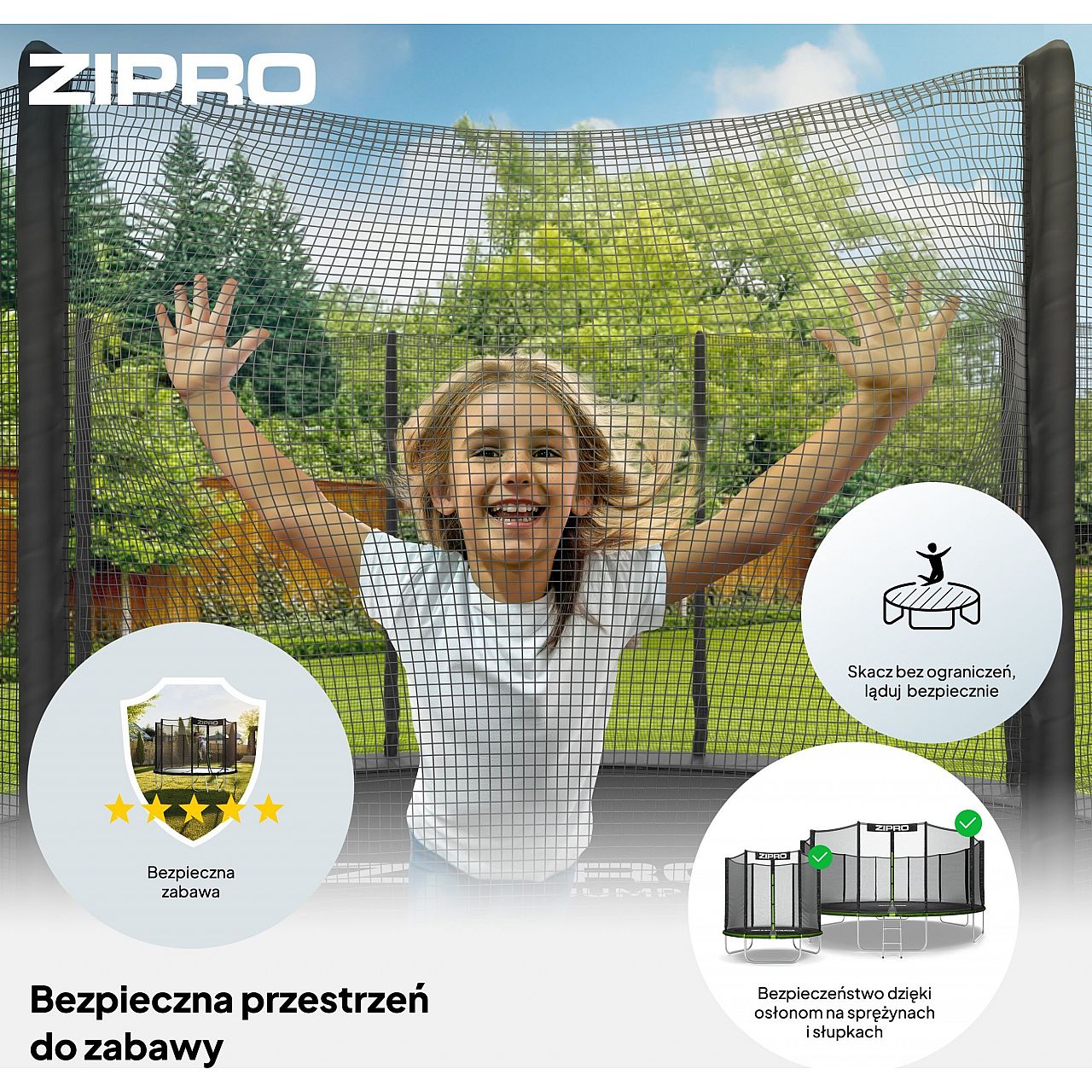Батути ZIPRO гарантують безпеку. Впроваджені рішення створюють повністю безпечне середовище навіть для найменших. Щоб забезпечити безтурботну гру дітей та спокій батьків, розробники батута ZIPRO Jump Pro OUT із зовнішньою сіткою працювали безкомпромісно, оснастивши його всім необхідним, щоб користування ним було не що інше, як чисте задоволення.