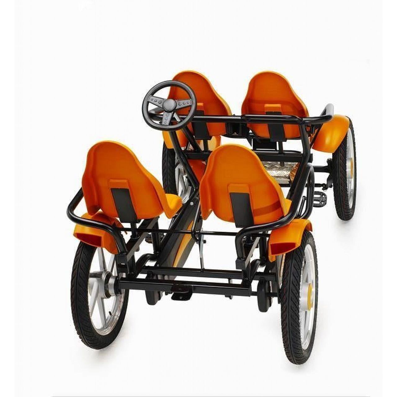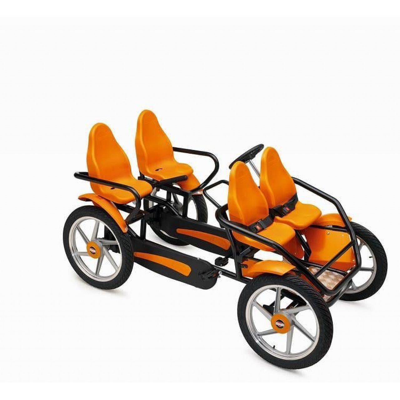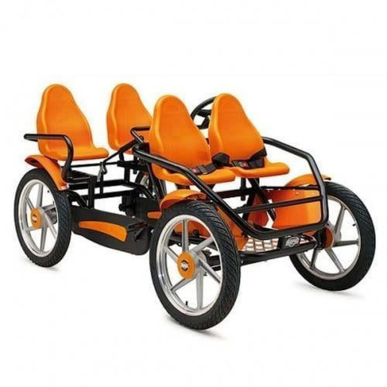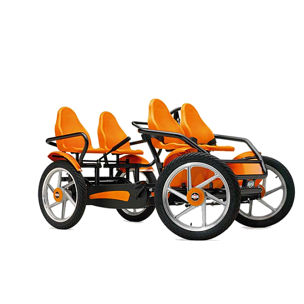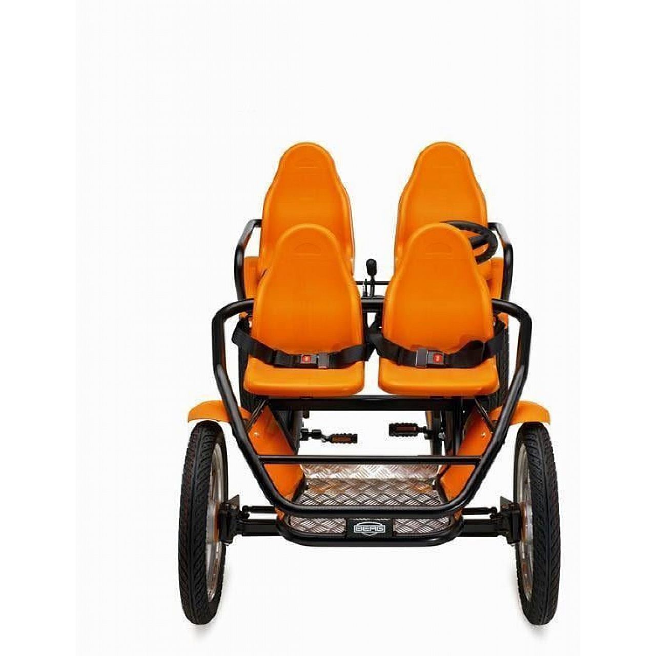 Веломобіль BERG GranTour F Race 4-міський обілей для комерційного використання! Він дотримується загальної націоналізації та дотримується всіх стандартів безпеки. Задоволення на посадці. Абсолютно нова концепція дизайну веломобіля. Веломобіль побудований на легкій консольній рамі, що дозволяє перевозити пасажира з важким вантажем до 100 кілограмів. Великі фальшиві алюмінієві колеса 17 забезпечують високу прохідність. Модель оснащена приводом F, розрахованим на рух тільки вперед і одним провідним приводом без переключателя передачі. Для збільшення користі руху одночасно можуть педалями 2 людини. Для безпеки безпеки, при звіженні веломобіля передні крісла одлокотниками і поясами безпеки. Ніколи ще жоден напівмобільний веломобіль не мав такого продуманого дизайну! У будівництві використаних матеріалів немає необхідності в цій військовій службі. Ви можете це повністю замовити намет яскраво оранжевого кольору. З допомогою універсального механізму сцепки ви можете без праці зробити веломобіль для шести людей.