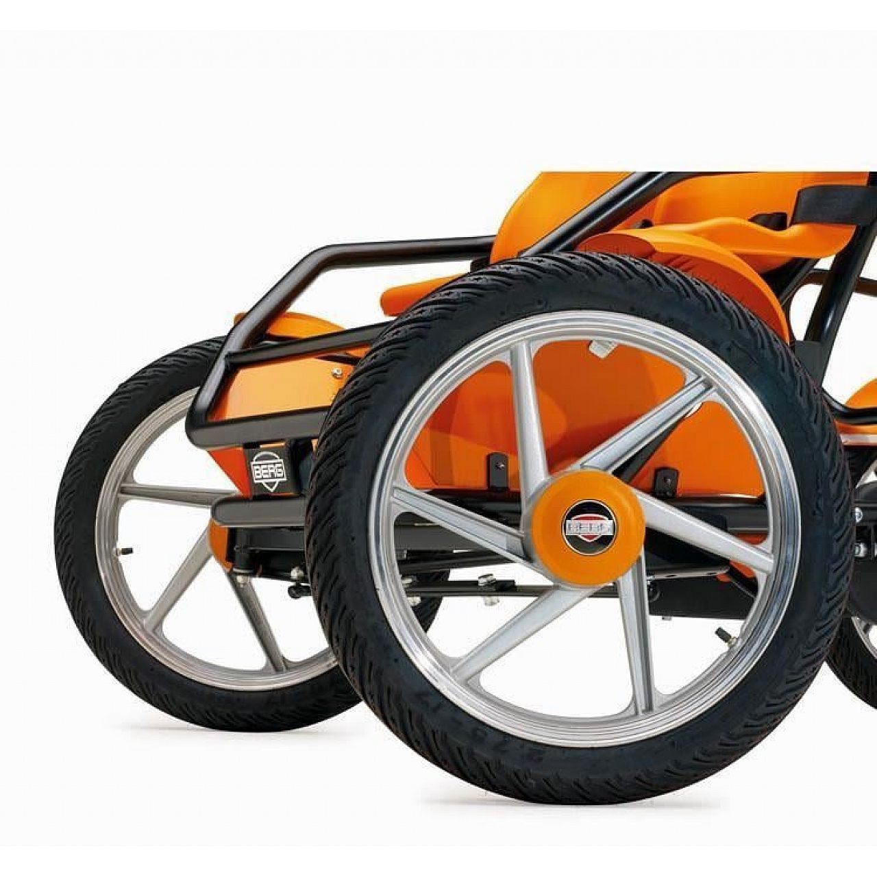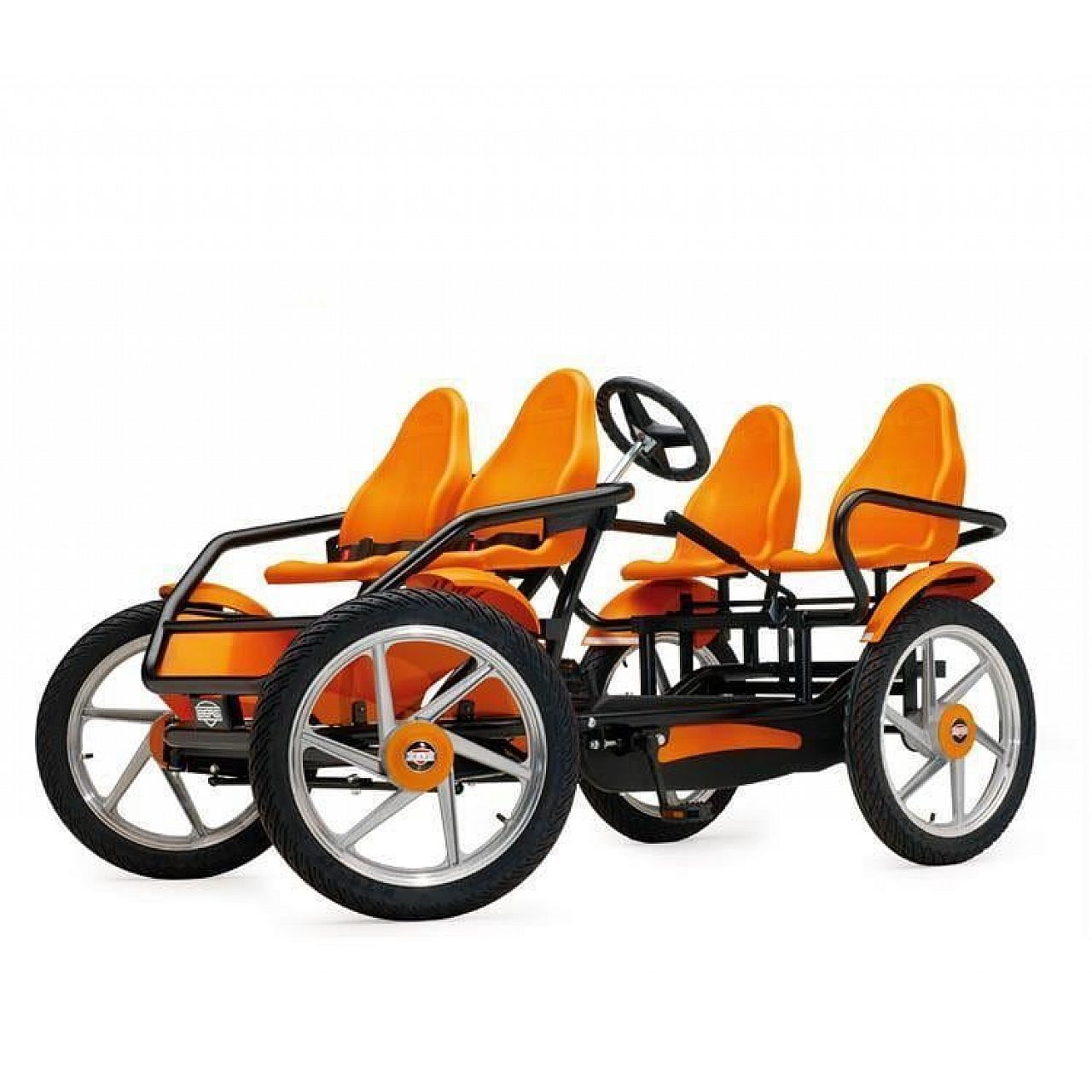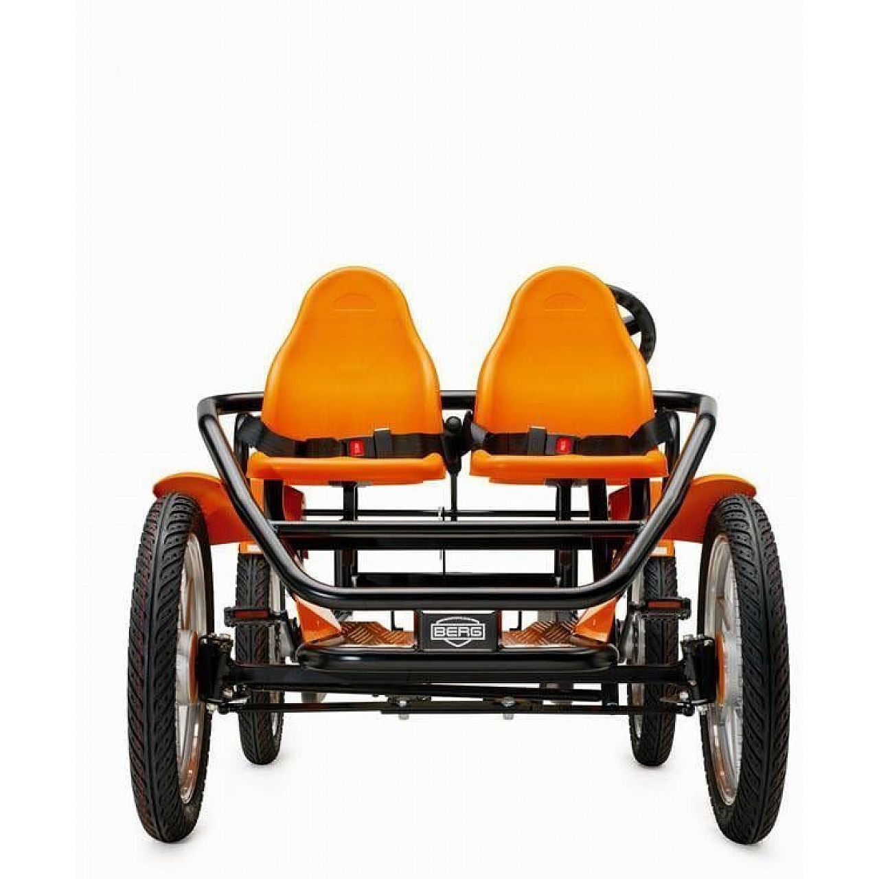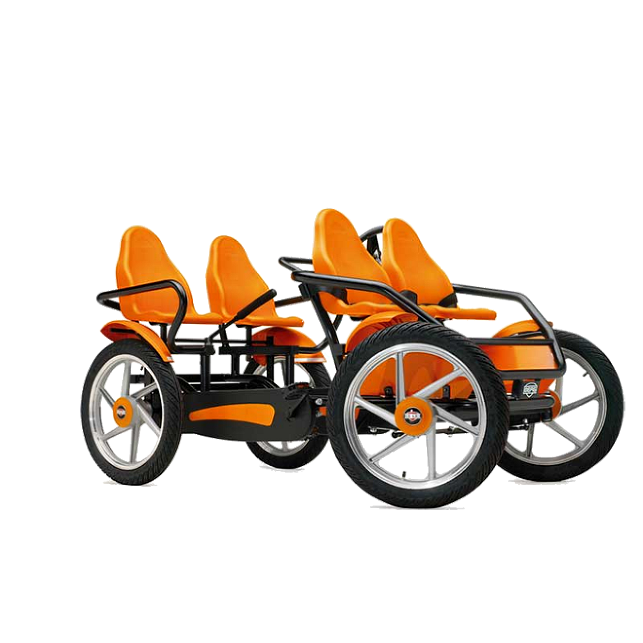Веломобіль BERG GranTour F Race 4-міський обілей для комерційного використання! Він дотримується загальної націоналізації та дотримується всіх стандартів безпеки. Задоволення на посадці. Абсолютно нова концепція дизайну веломобіля. Веломобіль побудований на легкій консольній рамі, що дозволяє перевозити пасажира з важким вантажем до 100 кілограмів. Великі фальшиві алюмінієві колеса 17 забезпечують високу прохідність. Модель оснащена приводом F, розрахованим на рух тільки вперед і одним провідним приводом без переключателя передачі. Для збільшення користі руху одночасно можуть педалями 2 людини. Для безпеки безпеки, при звіженні веломобіля передні крісла одлокотниками і поясами безпеки. Ніколи ще жоден напівмобільний веломобіль не мав такого продуманого дизайну! У будівництві використаних матеріалів немає необхідності в цій військовій службі. Ви можете це повністю замовити намет яскраво оранжевого кольору. З допомогою універсального механізму сцепки ви можете без праці зробити веломобіль для шести людей.