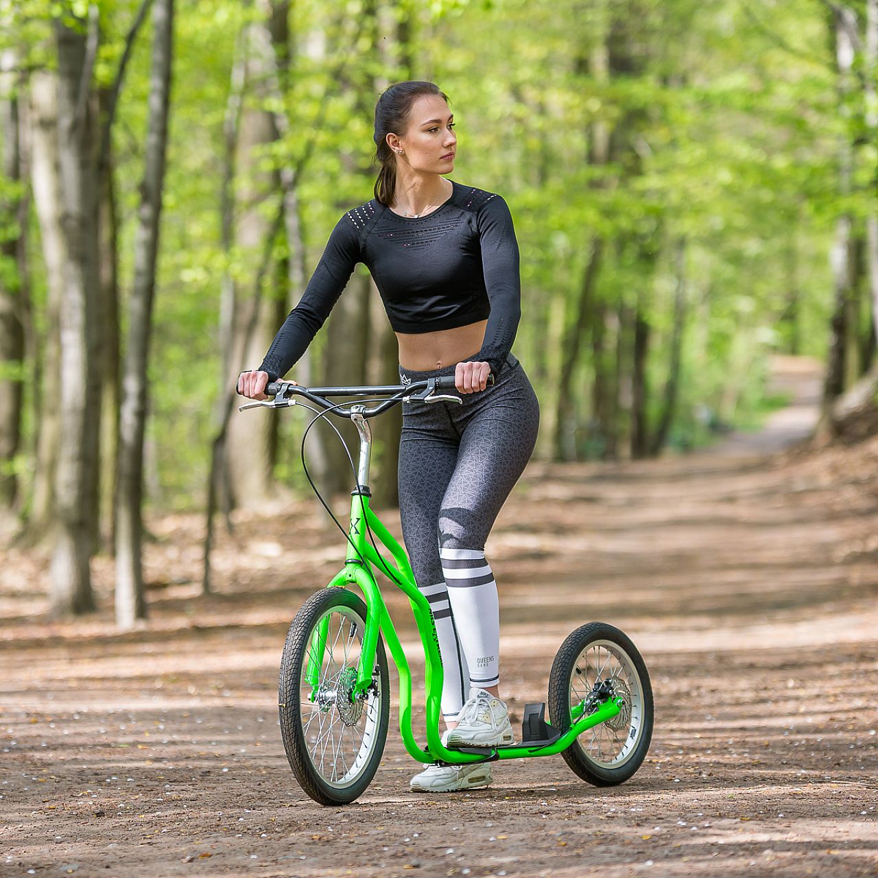 Це самокат, призначений для підлітків і дорослих. Максимальна вага користувача: 120 кг. Рама і кермо виготовлені з міцної та довговічної сталі. Ручки кріпляться гвинтами, що означає, що вони не викручуються і не ковзають. WH206T ідеально підходить для їзди асфальтованими парковими доріжками, асфальтованими тротуарами, а також для бездоріжжя. Великі надувні шини дозволяють плавно долати нерівності. Гальма забезпечують максимальний контроль над скутером. Для більшої ефективності на передніх і задніх колесах встановили дискові гальма.