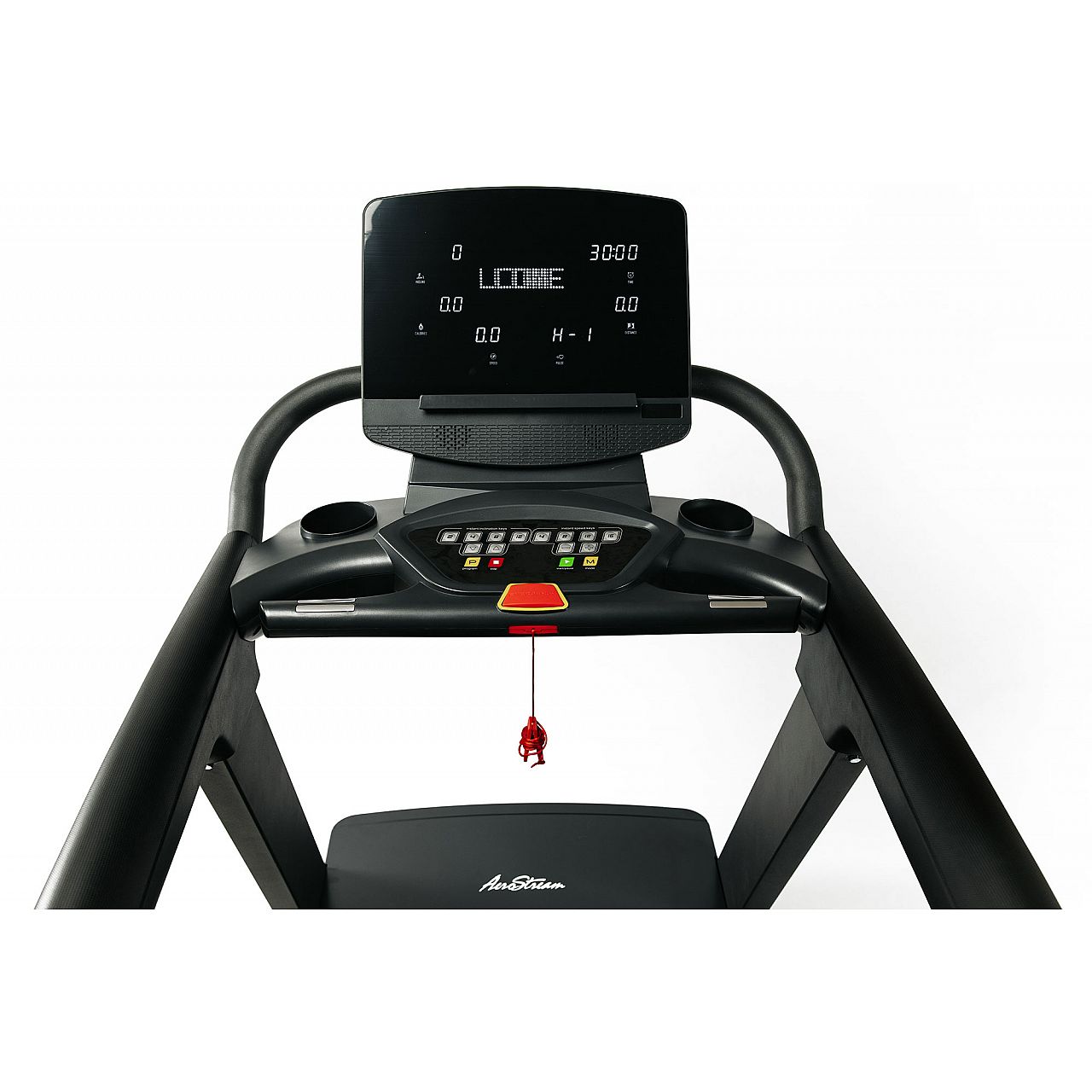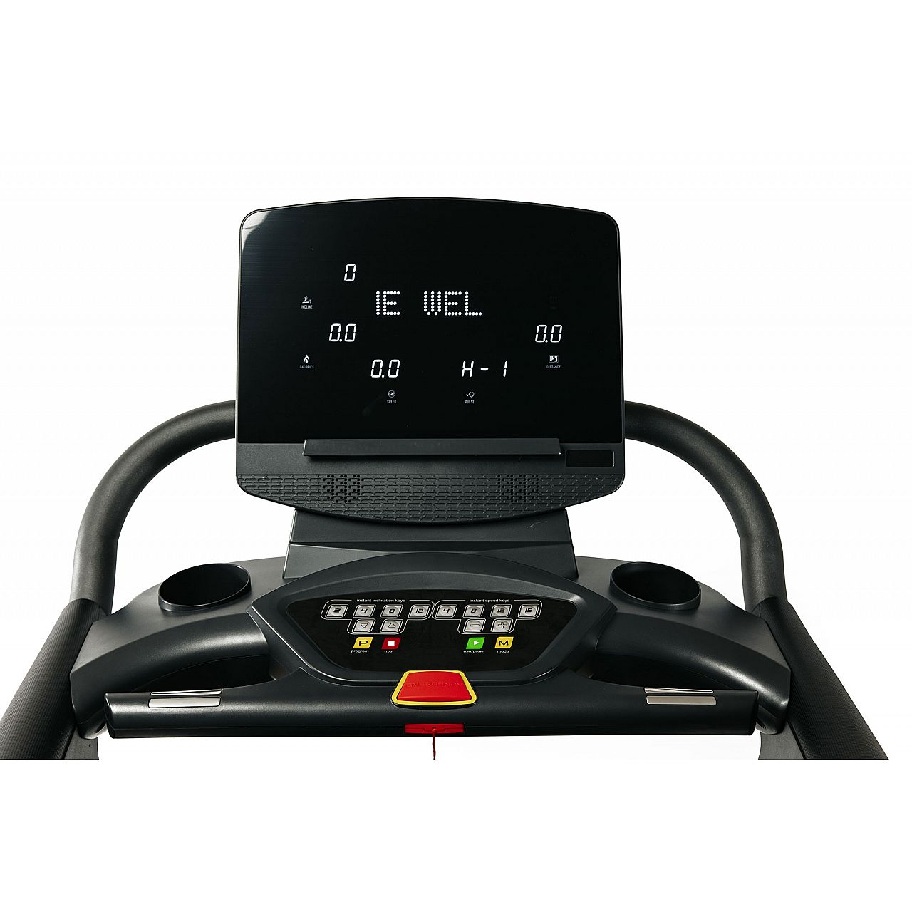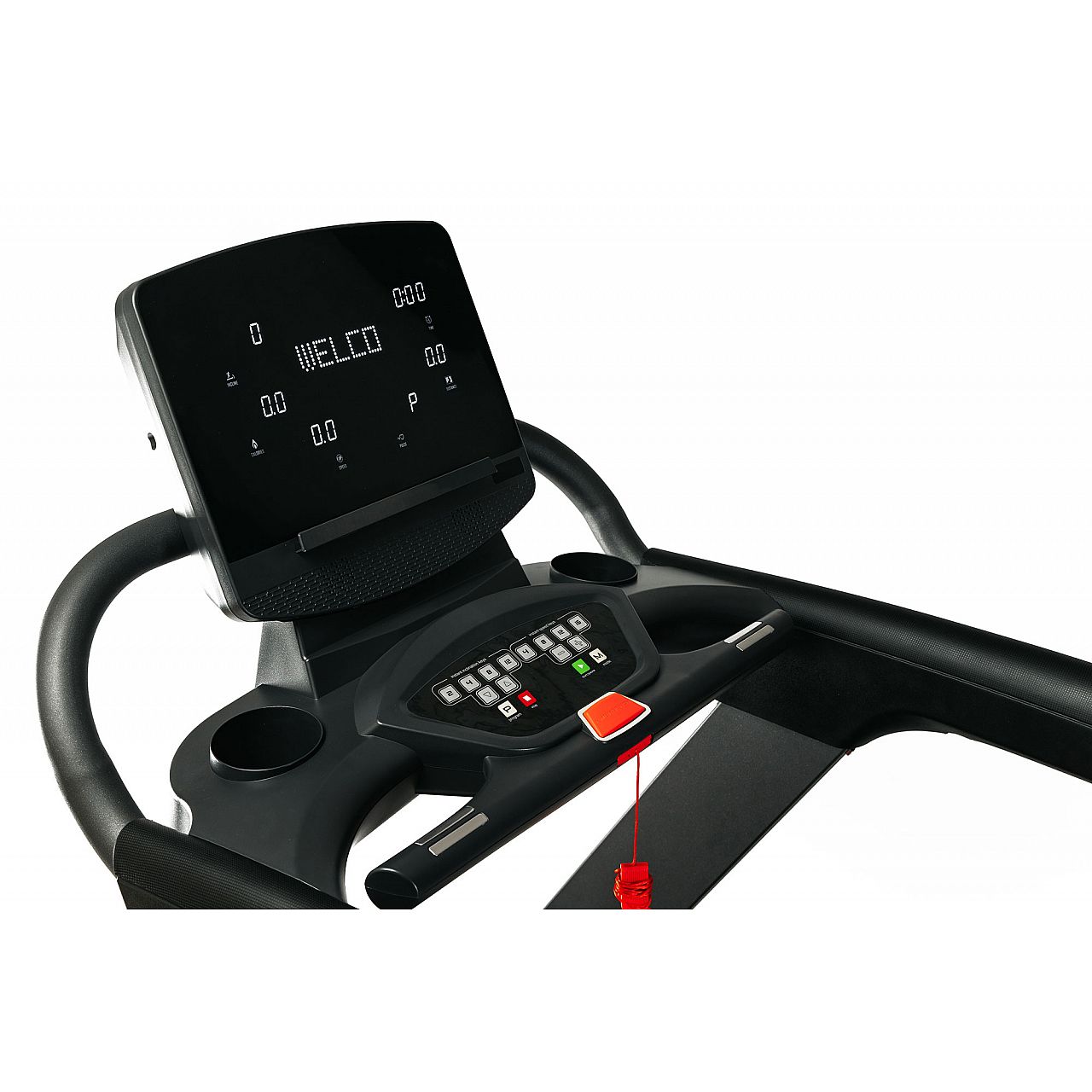 Комфортная панельс ярким LED дисплеем совмещена кнопкой экстренной остановки, а также кнопками быстрого доступа, которые позволяют в одно касание менять скорость и угол наклона бегового полотна.