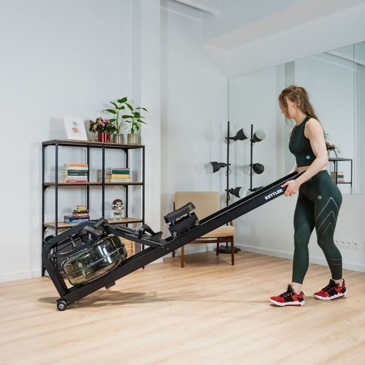 Після тренування гребний тренажер можна зберігати горизонтально або вертикально, заощаджуючи багато місця . За допомогою транспортувальних коліс гребний тренажер можна розмістити де завгодно.