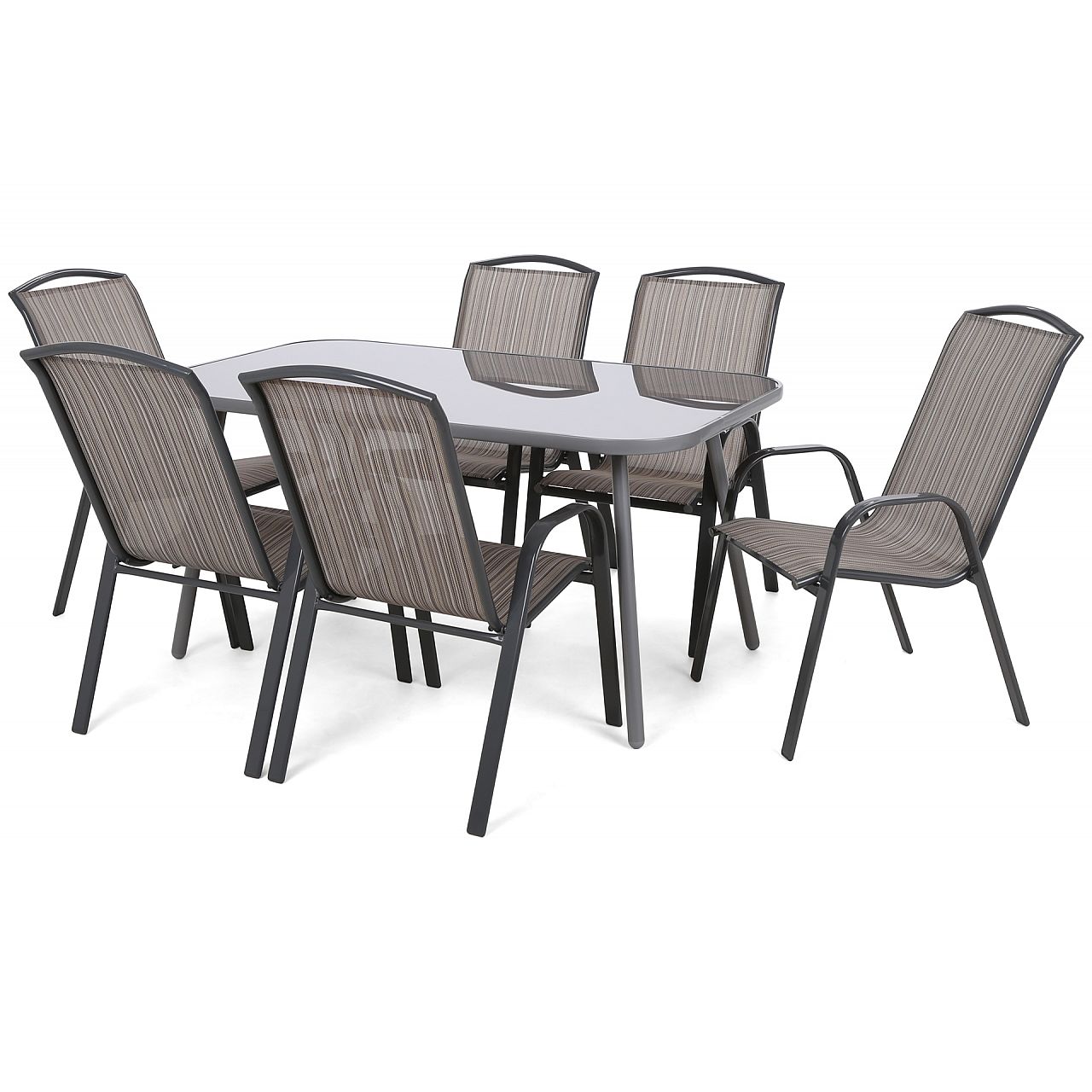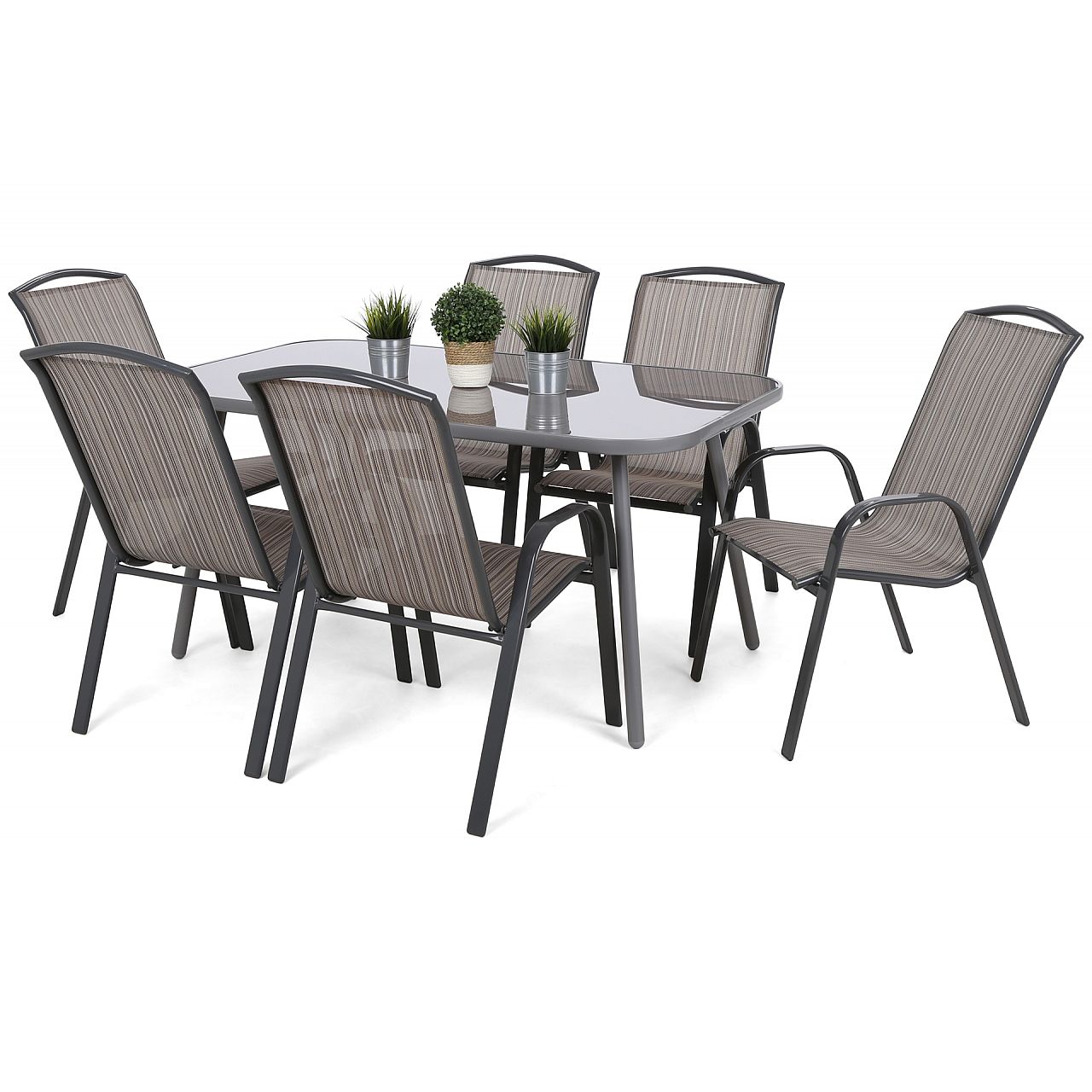 Металлическая садовая мебель Casablanca 150 см Silver / Taupe Atlanta Grey / Beige Striped 6+1 — элегантный комплект, идеально подходящий для вашего сада или террасы. Комплект состоит из прочного стола длиной 150 см и 6 удобных стульев Атлант. Весь комплект восхищает сочетанием серого и бежевого цветов, что придает ему современный и стильный вид.