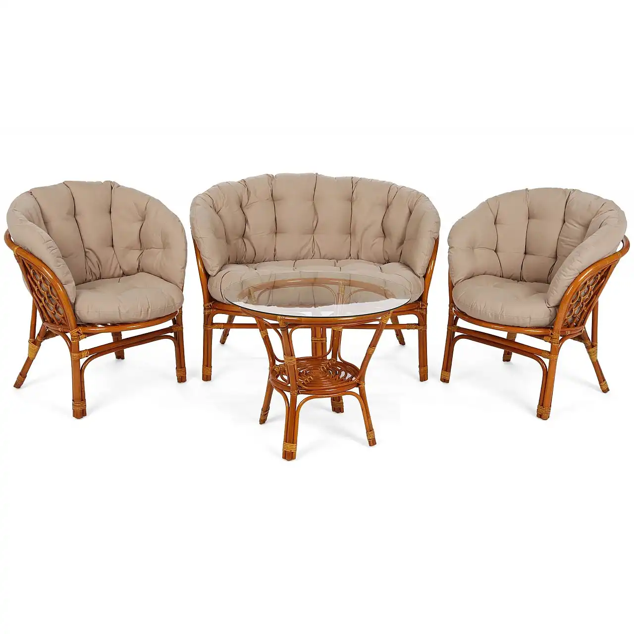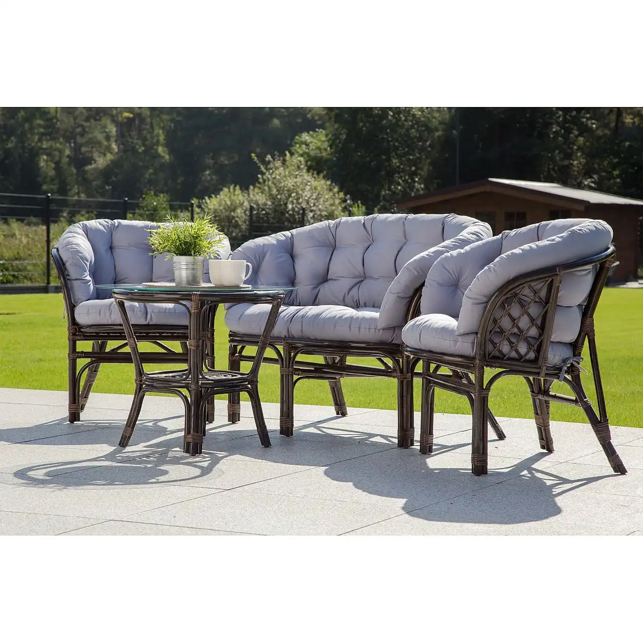 Одним из самых популярных продуктов в нашем широком предложении является садовая мебель из ротанга Bahama . Их изысканный дизайн украсит интерьер любой гостиной, террасы или сада. Комплект состоит из дивана, двух кресел и стола. И кресла, и диван обтянуты удобными подушками, покрытыми обивкой из приятной на ощупь смеси хлопка и полиэстера. Со вкусом оформленный стол играет очень важную роль во всем наборе. Его верхняя часть изготовлена из прочного закаленного стекла. Небольшая полка (например, для утренней газеты или сумки) дополнительно повышает его устойчивость. Гармоничный цвет ротанга и подобранные по цвету подушки придают мебели элегантный характер. Садовая мебель из ротанга Bahama – это высококачественный продукт, предназначенный для людей, ценящих удобство и комфорт.