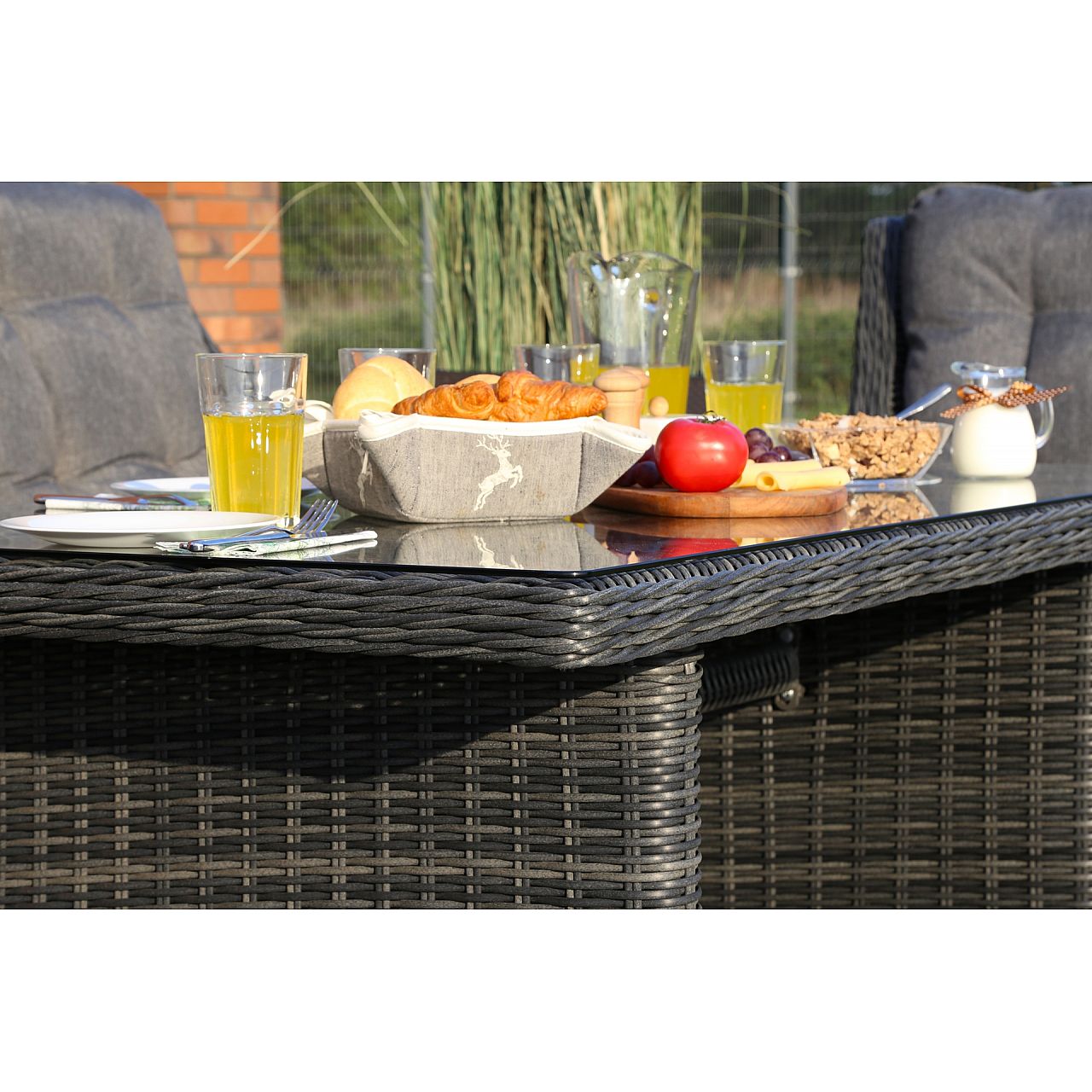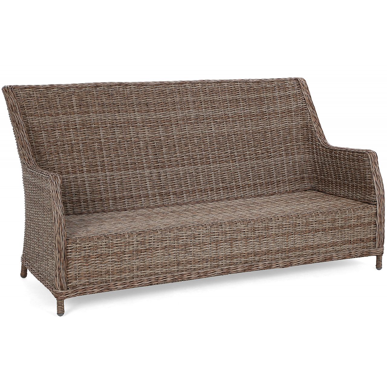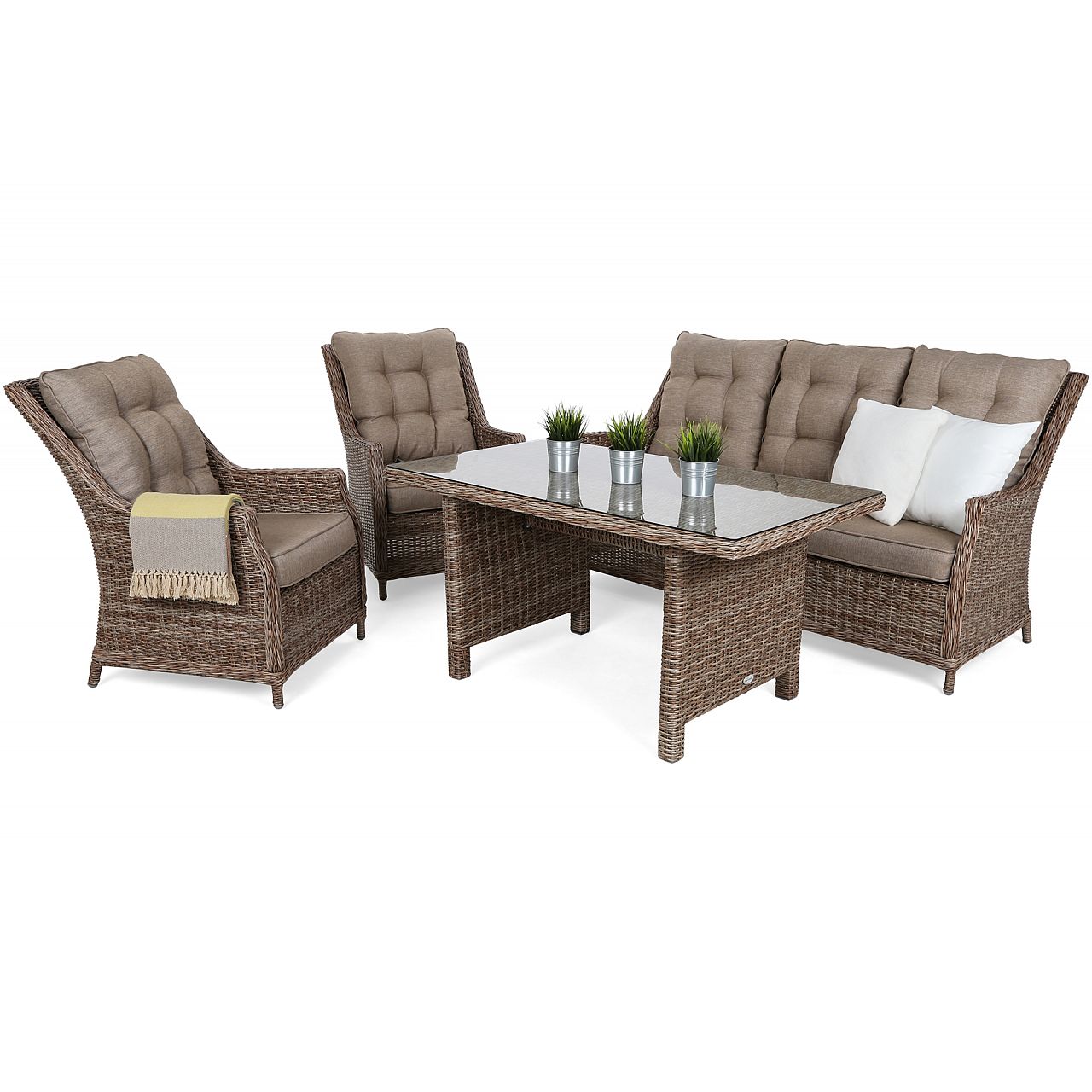Садовая мебель Аликанте коричневого цвета состоит из кресел и дивана с высокими спинками и подлокотниками. Благодаря этим элементам вы будете наслаждаться большим комфортом. Размер стола оптимален для размещения тарелок с закусками и стаканов с напитками. Они будут стоять устойчиво, поскольку мебель покрыта закаленным стеклом.